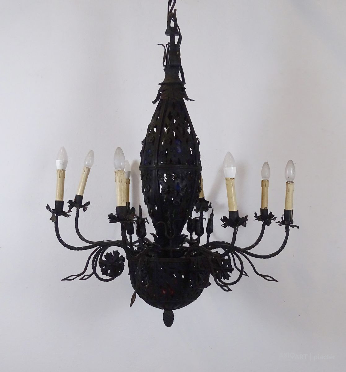 [1S907/UZ-K] Régi nagy méretű különlegesen díszes, 8 égős, kovácsoltvas csillár. A karok papírmasé gyertyákban végződnek, kisméretű (E14) izzó való bele. A csillár testében egy-egy sérülésen keresztül színes izzók kerültek elhelyezésre. Magasság: 105 cm Szélesség: 93 cm
