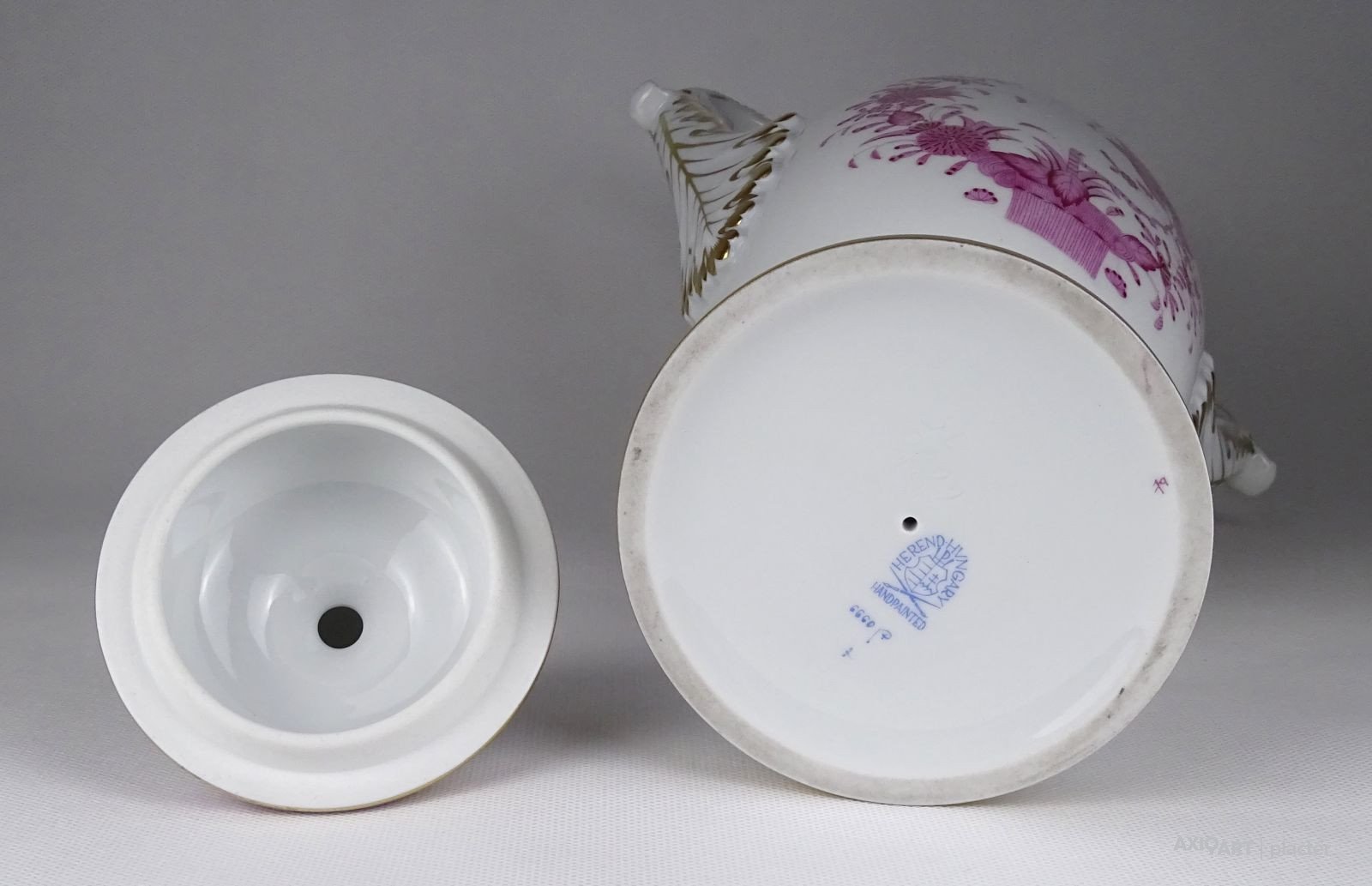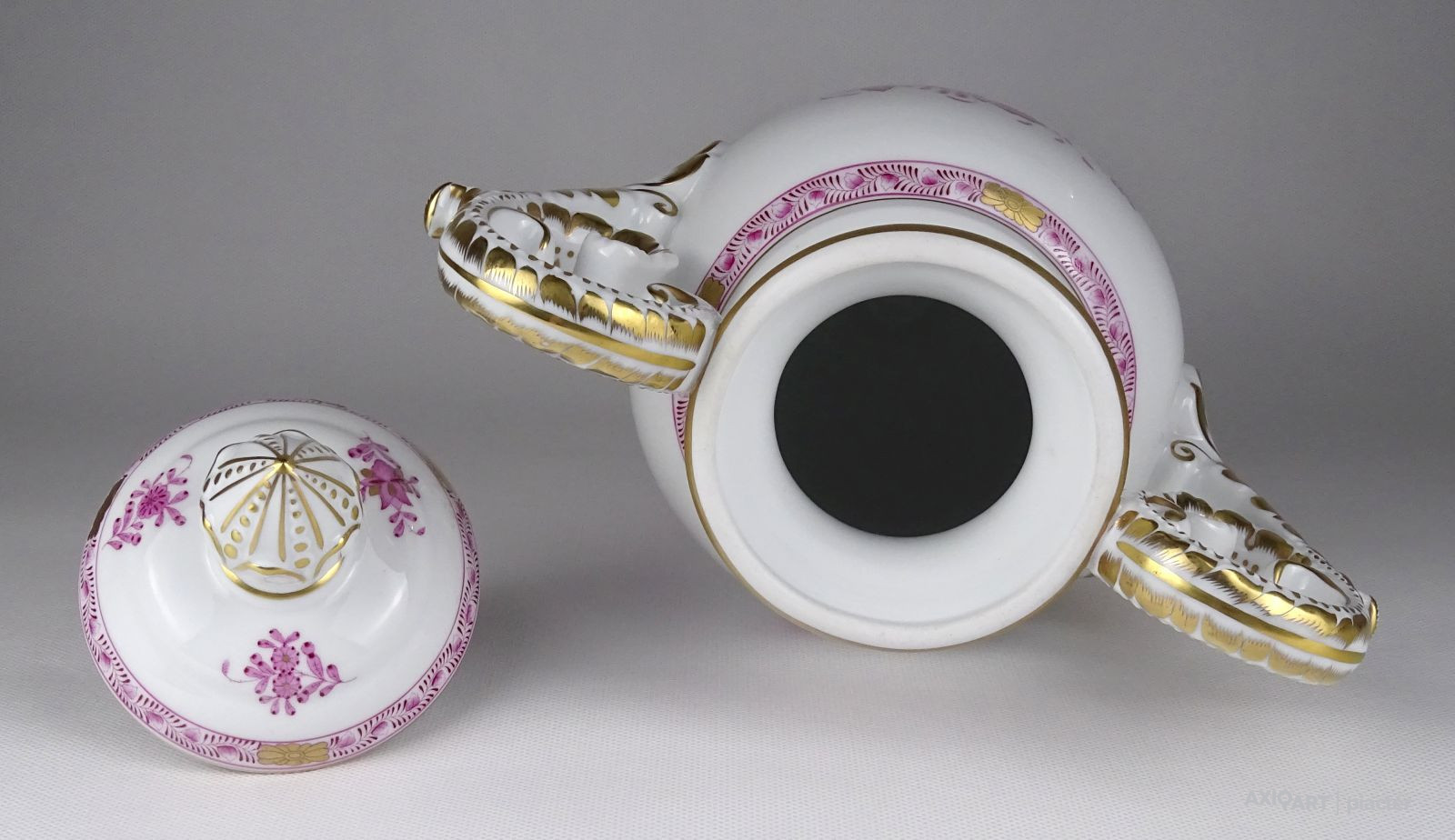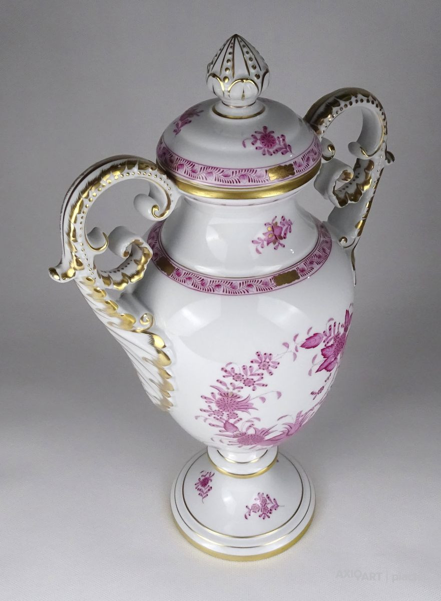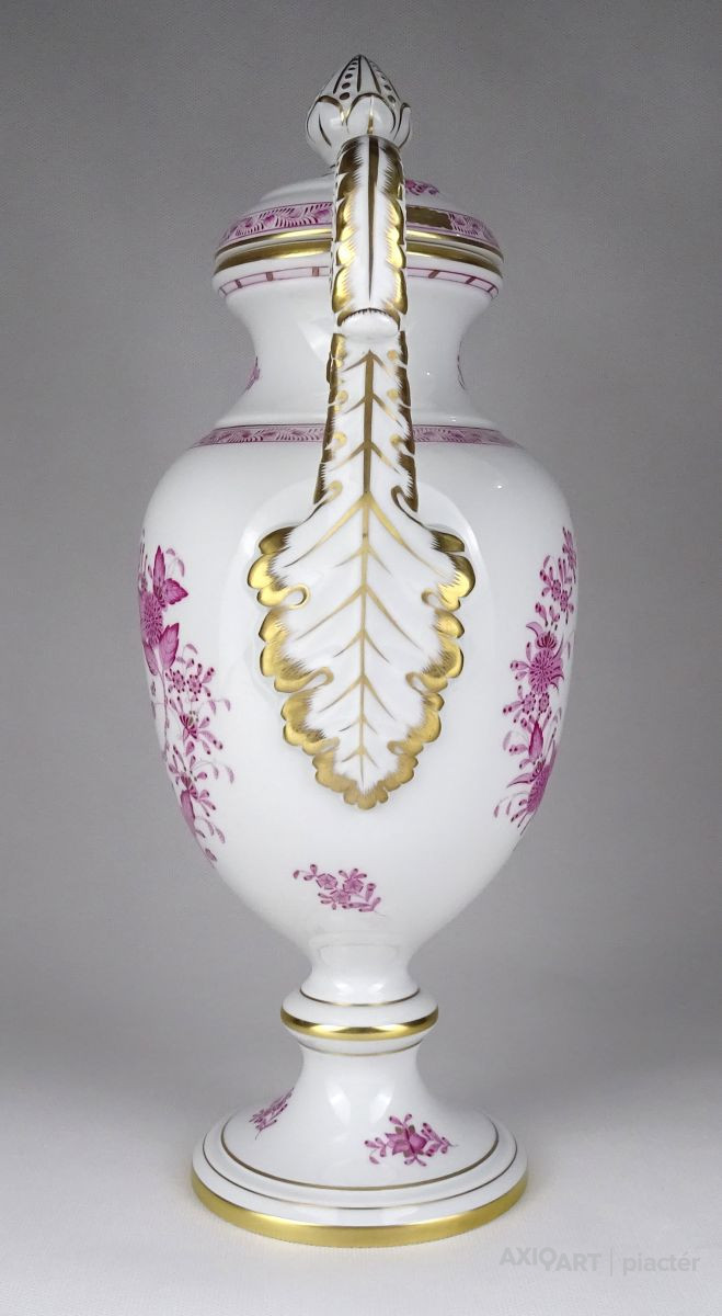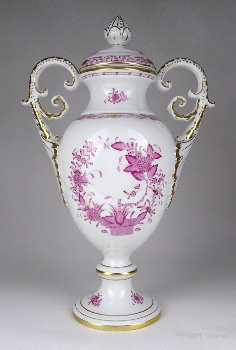 [1R300/BX-8] Hibátlan állapotú, dúsan aranyozott rózsaszín indiai kosár mintás nagy méretű Herendi porcelán urna, váza. Alján kék Herendi jelzés: HEREND HUNGARY HANDPAINTED Mélynyomással: HEREND Formaszám kékkel: 6660/P Teljesen hibátlan, azonnal ajándékba adható állapotban van. Magasság: 36.5 cm Szélesség: 24 cm Súly: 1.58 kg