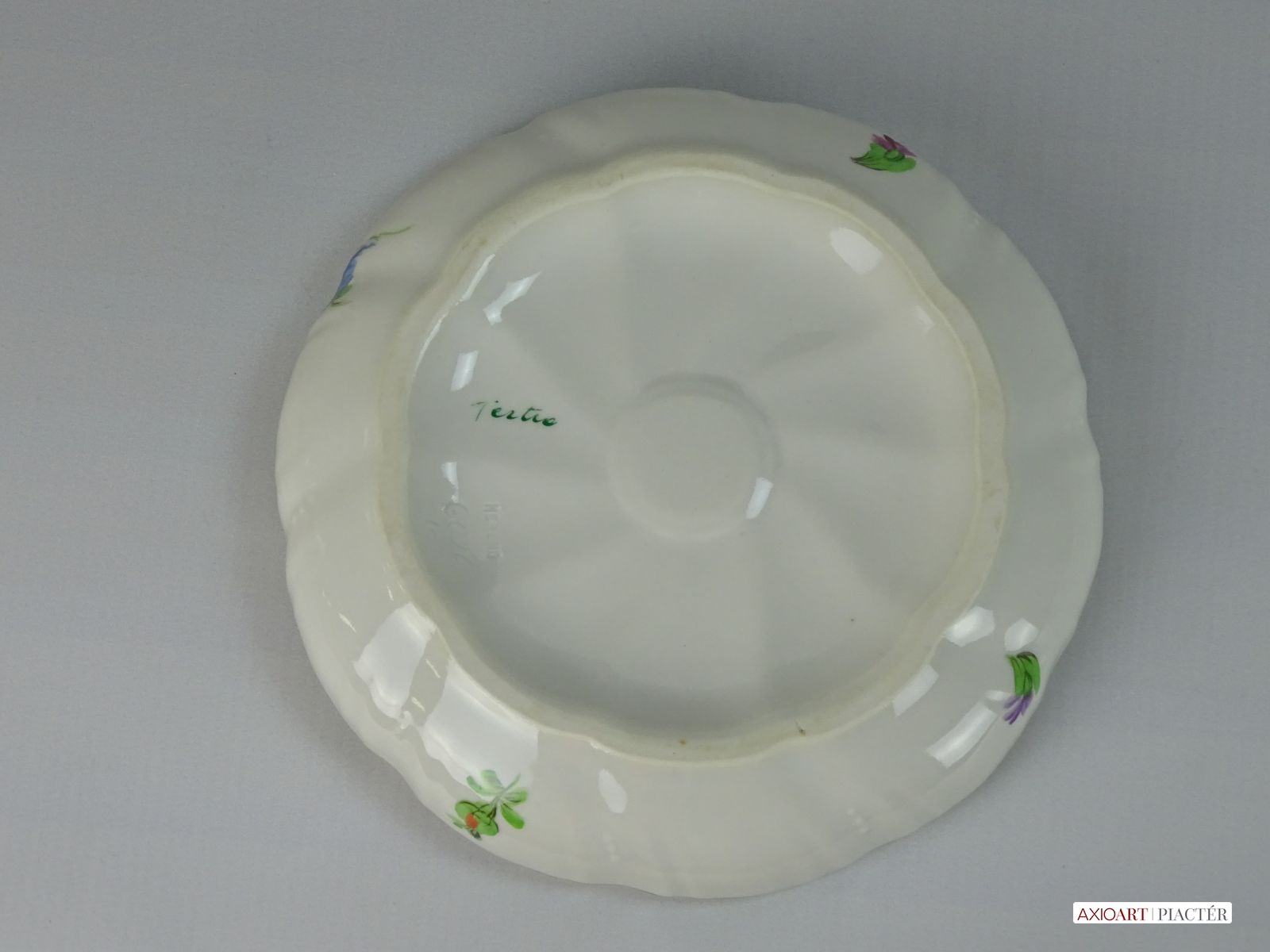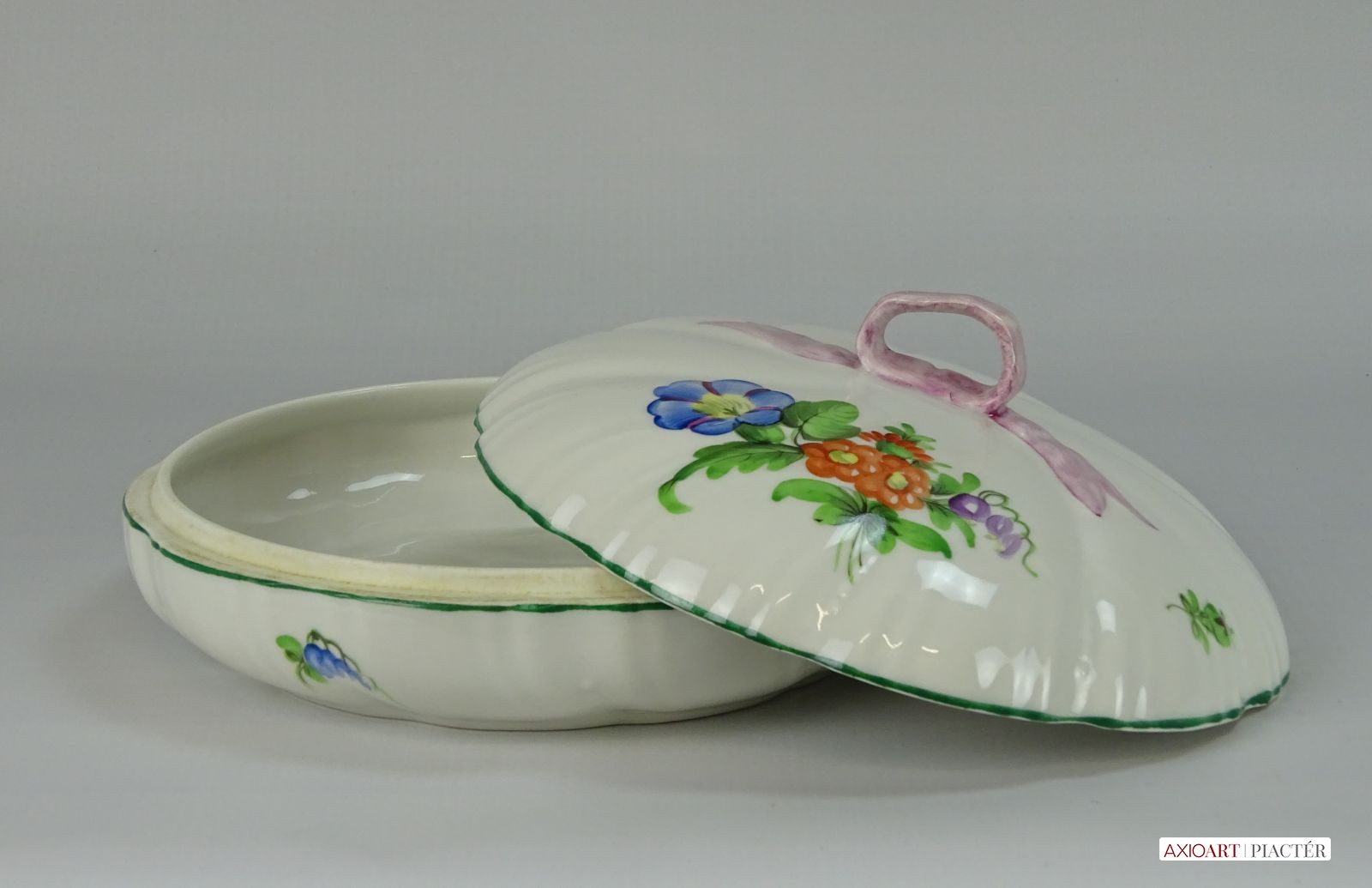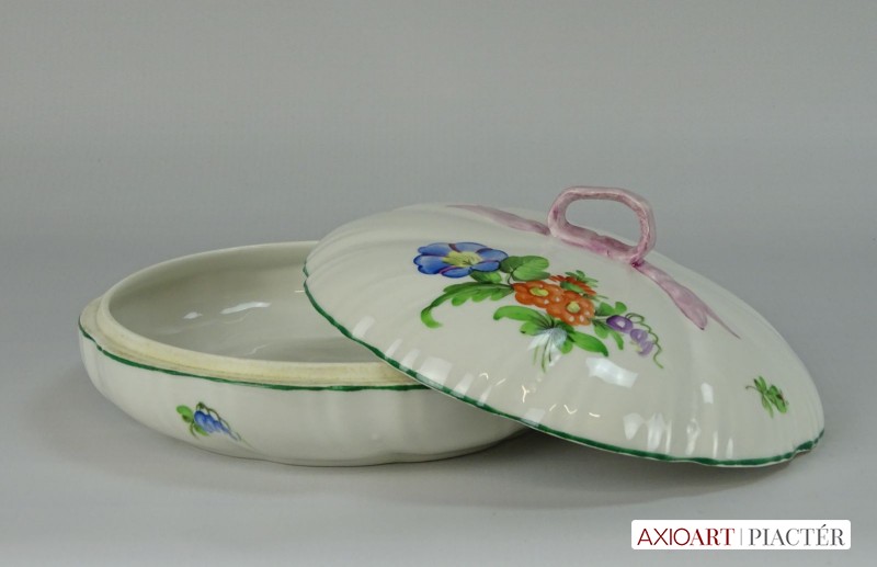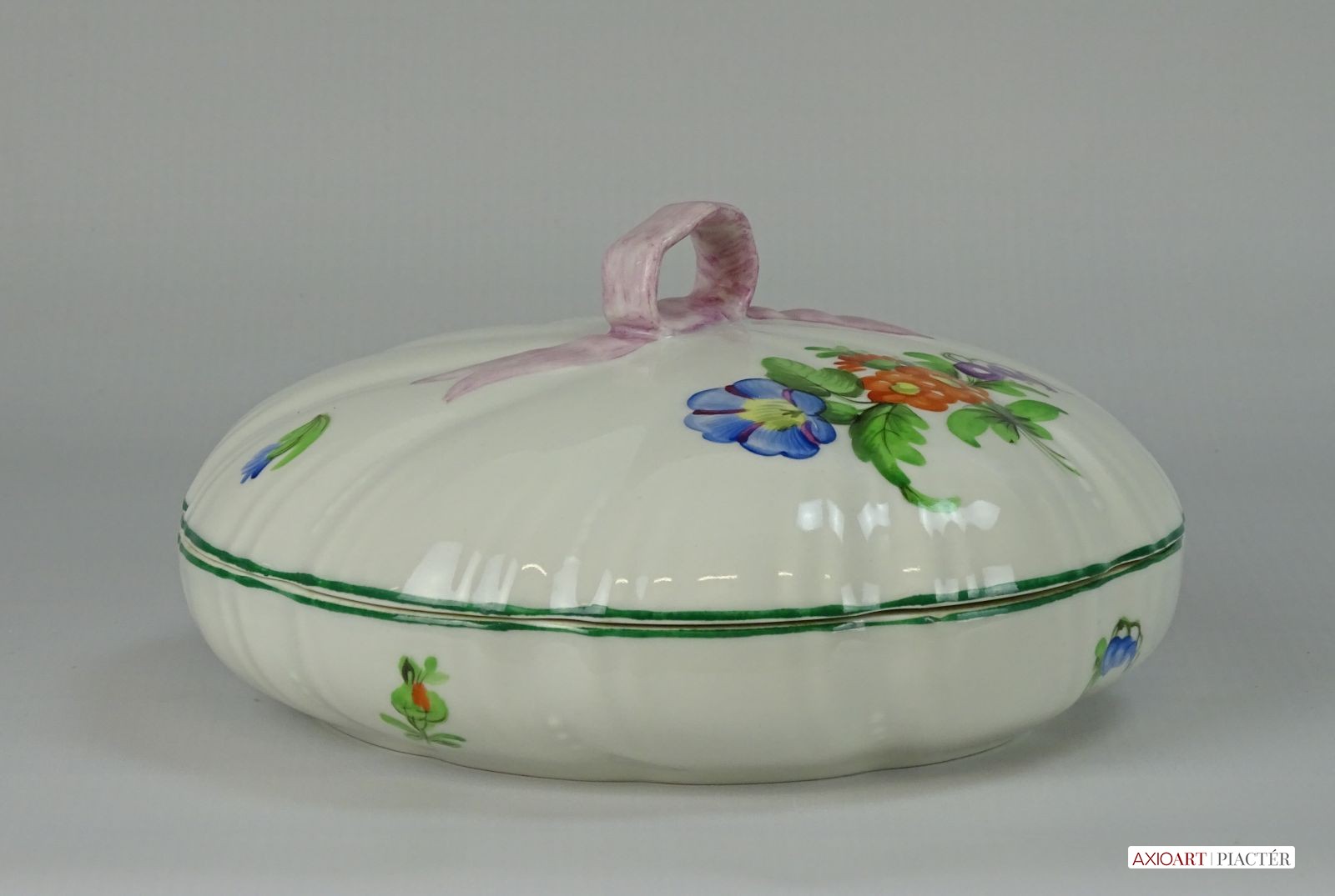 [0I266/VTR-7] Ritka formájú, tetején szalag mintás herendi porcelán bonbonier, teljesen hibátlan. Alján herendi jelzés: TERTIA Mélynyomással: HEREND Formaszám: 6026 Magasság: 8.5 cm Szélesség: 16.5 cm Súly: 0.483 kg
