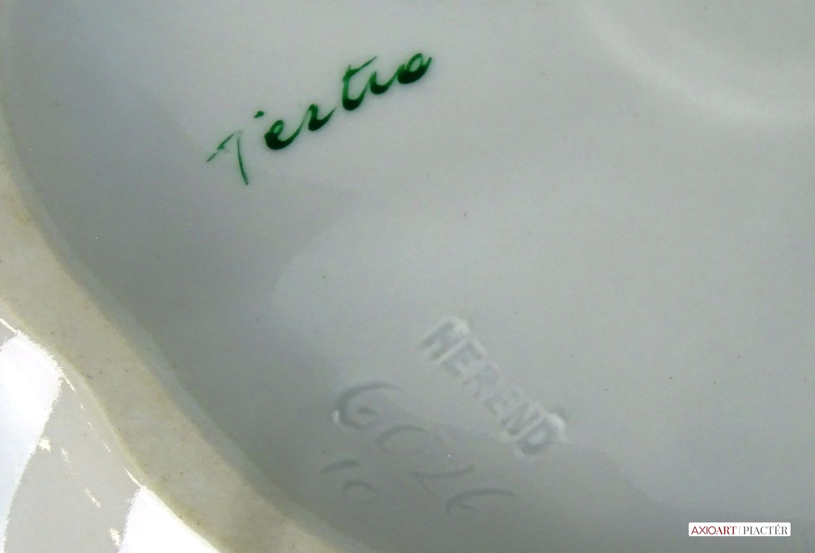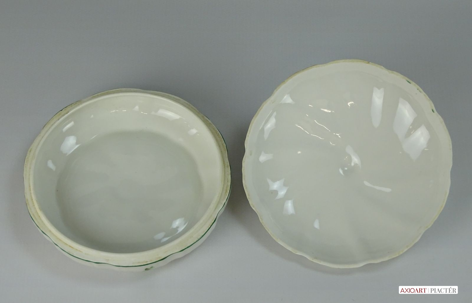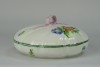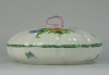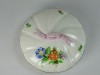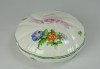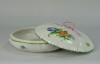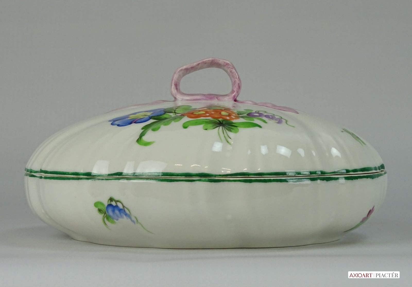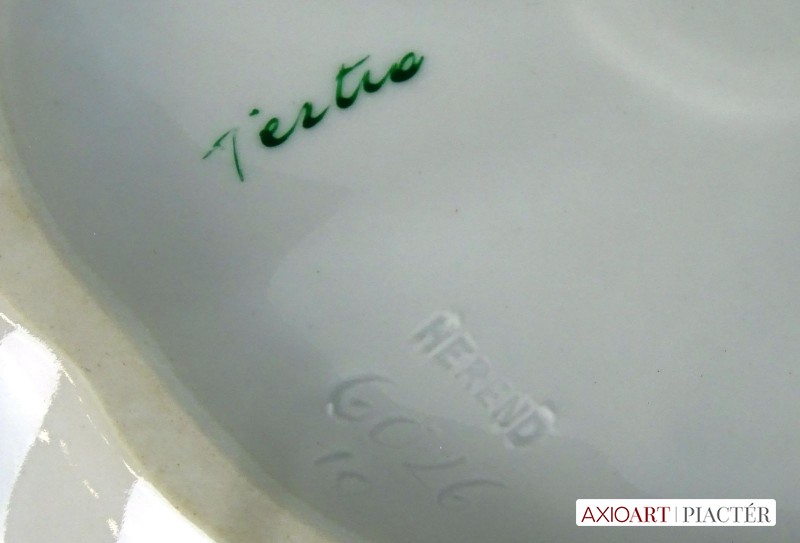 [0I266/VTR-7] Ritka formájú, tetején szalag mintás herendi porcelán bonbonier, teljesen hibátlan. Alján herendi jelzés: TERTIA Mélynyomással: HEREND Formaszám: 6026 Magasság: 8.5 cm Szélesség: 16.5 cm Súly: 0.483 kg