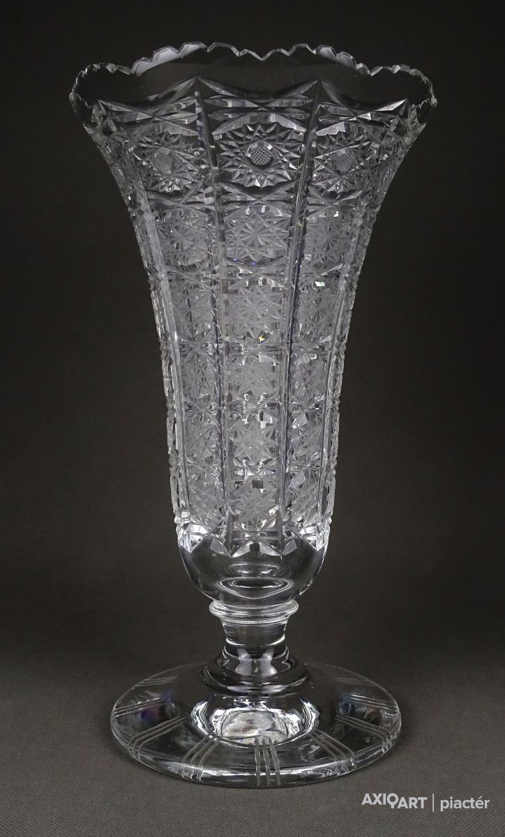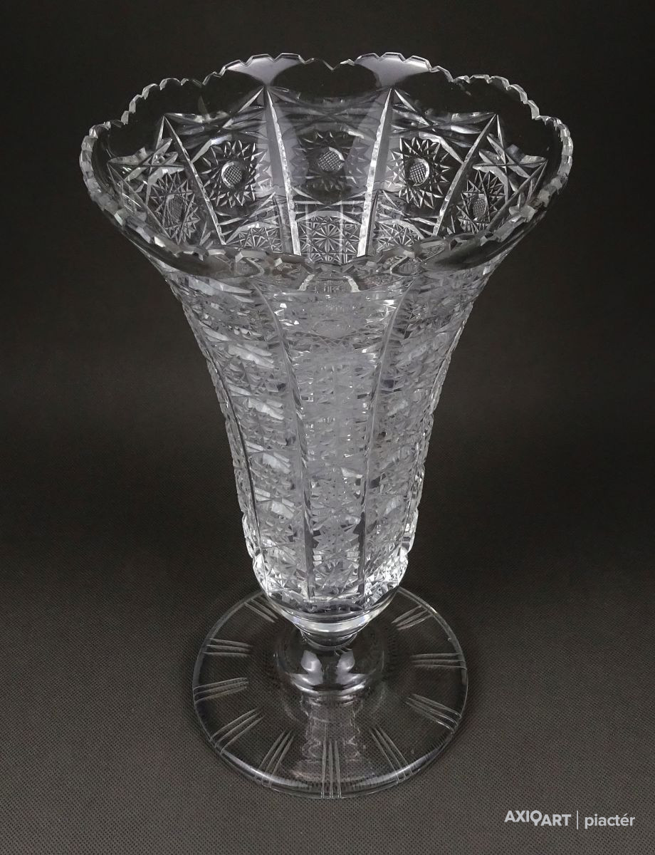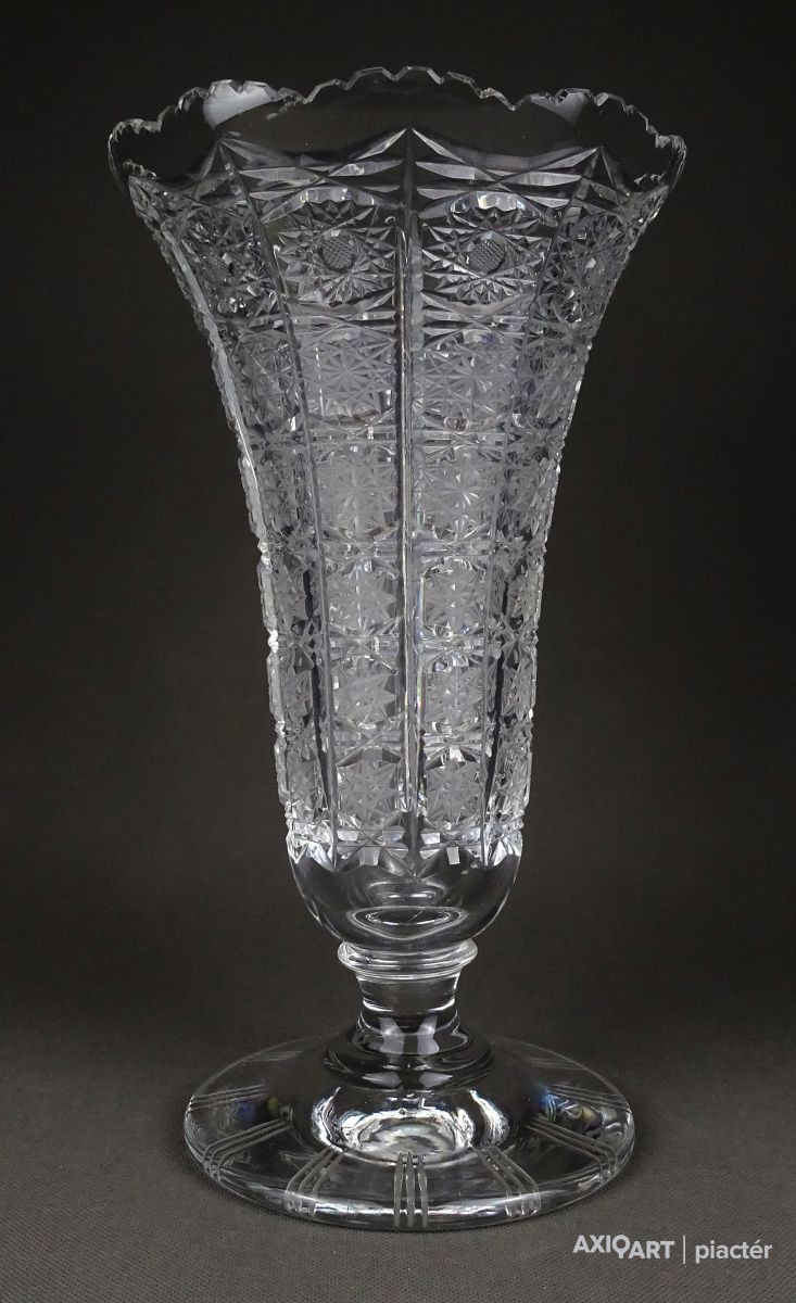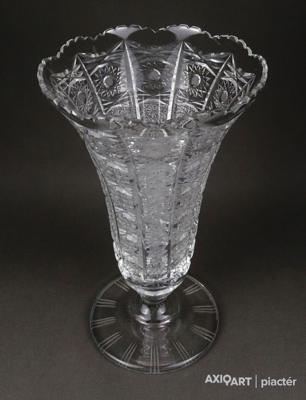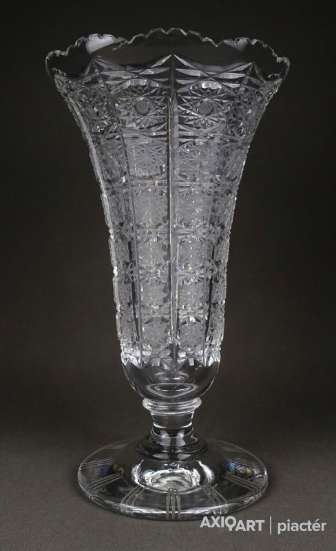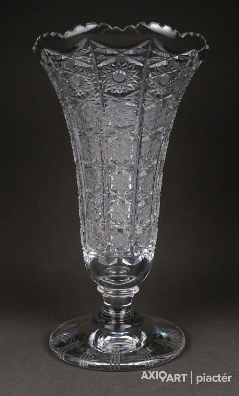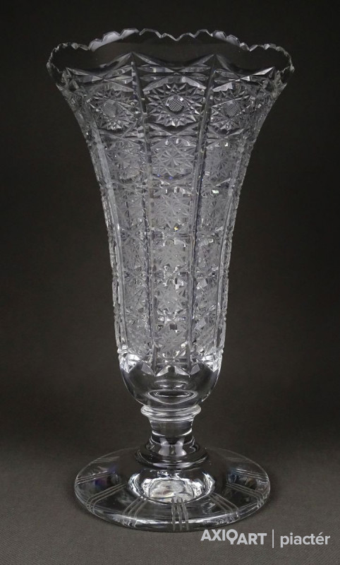 Hibátlan állapotú, hatalmas méretű, talpas, kehely alakú csiszolt kristály váza. A váza teljes felülete gazdagon díszített, kézi csiszolt.