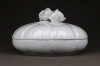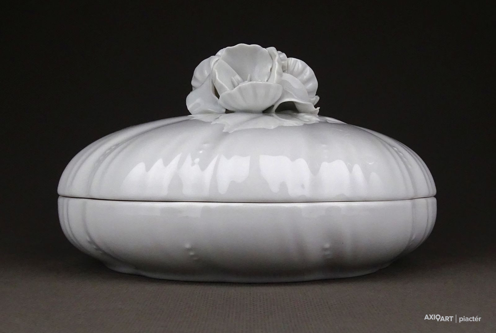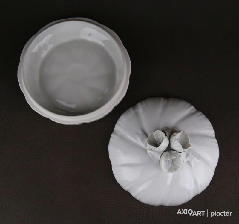 Nagy méretű porcelán bonbonier. Ritka forma. Tetején plasztikus virág díszítés. A virágdíszítésen egy pici lepattanás található, lásd fotó.