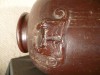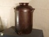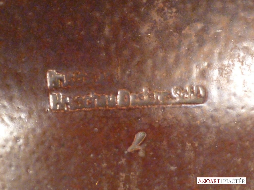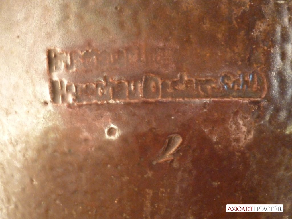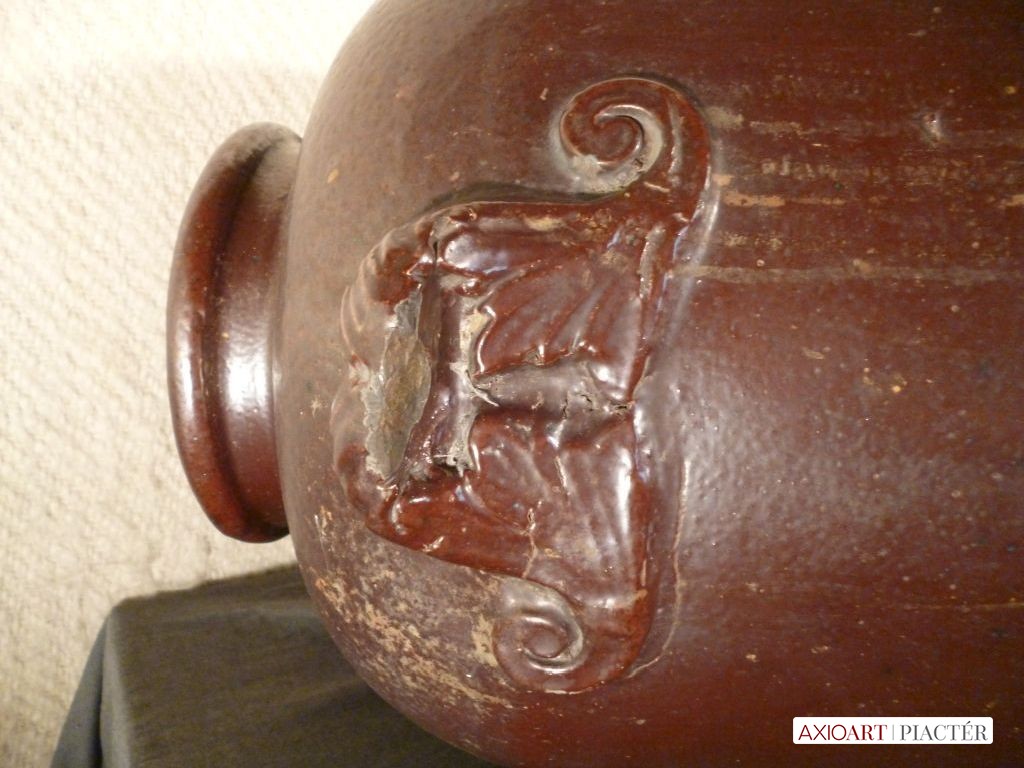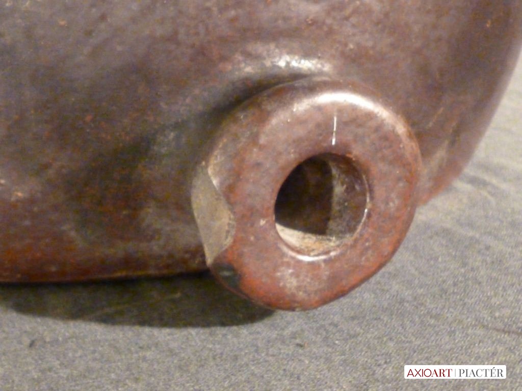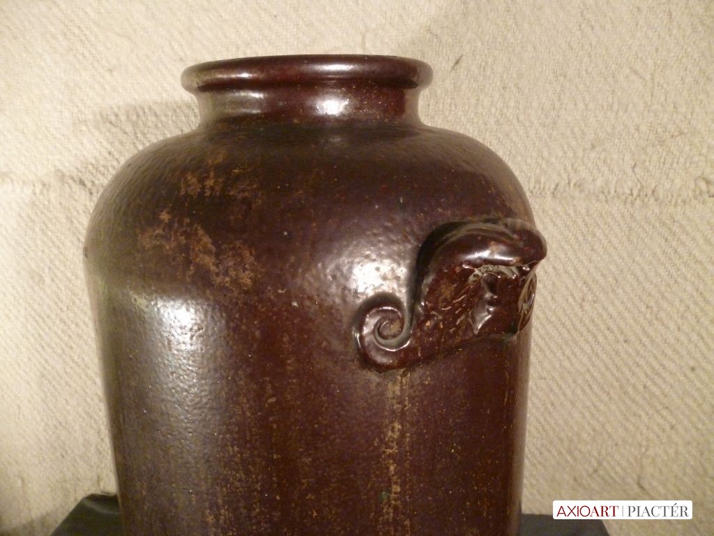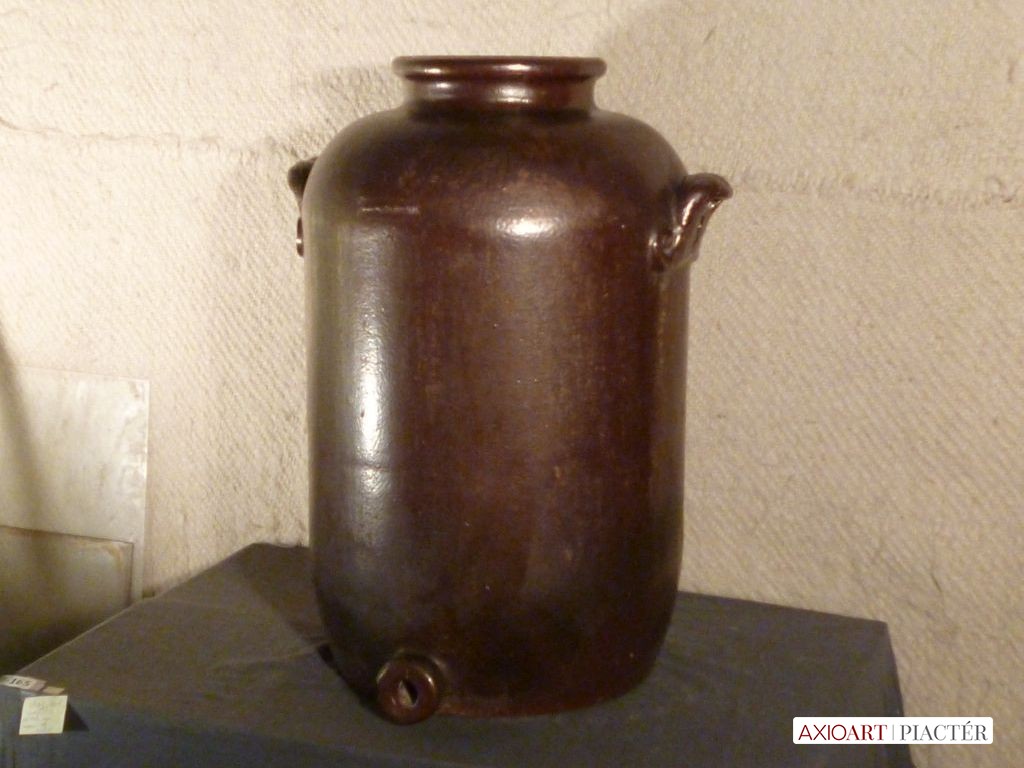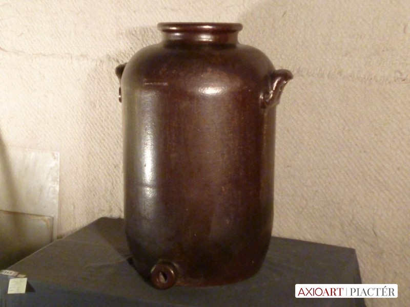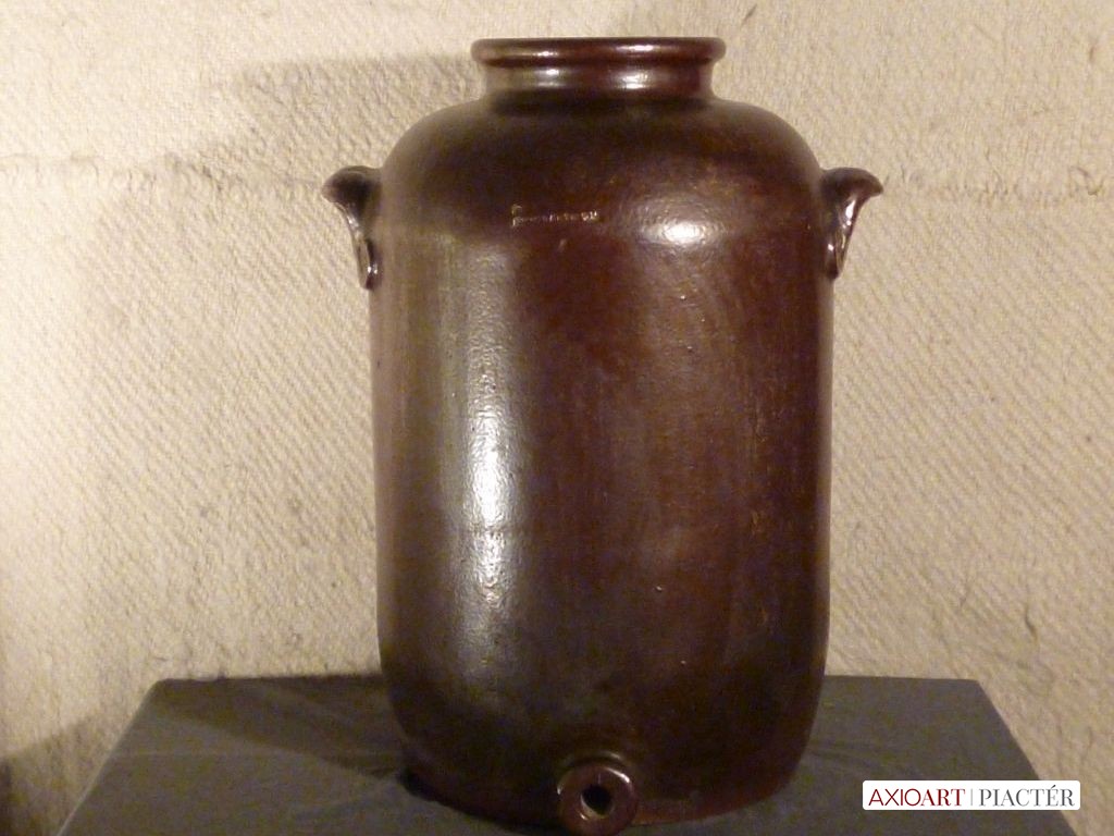 [4165/KCS] Óriási méretű, extra vastagfalú, nagyon szép állapotú, sötétbarna színű kőcserép tároló edény, ülepítő edény. Oldalán két hordozó füllel. Elején mélynyomású pecsét, nehezen olvasható: HRUSCHAU ? alatta 4-es méretszám. Alul a csap résznél egy korabeli lepattanás található. Extra nehéz, grandiózus darab. Valószínűleg olaj vagy ecet tárolására használták. Magasság: 65 cm Szélesség: 40 cm