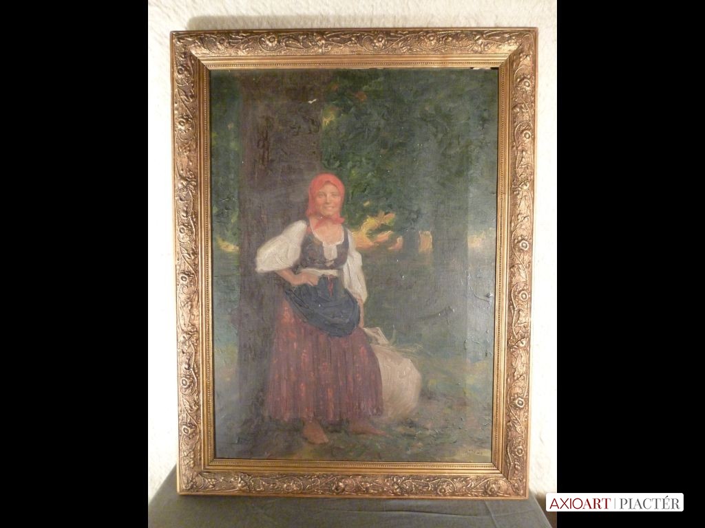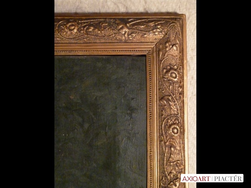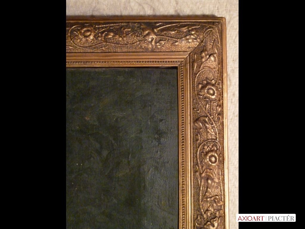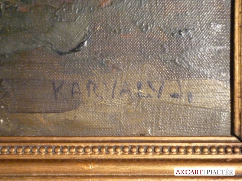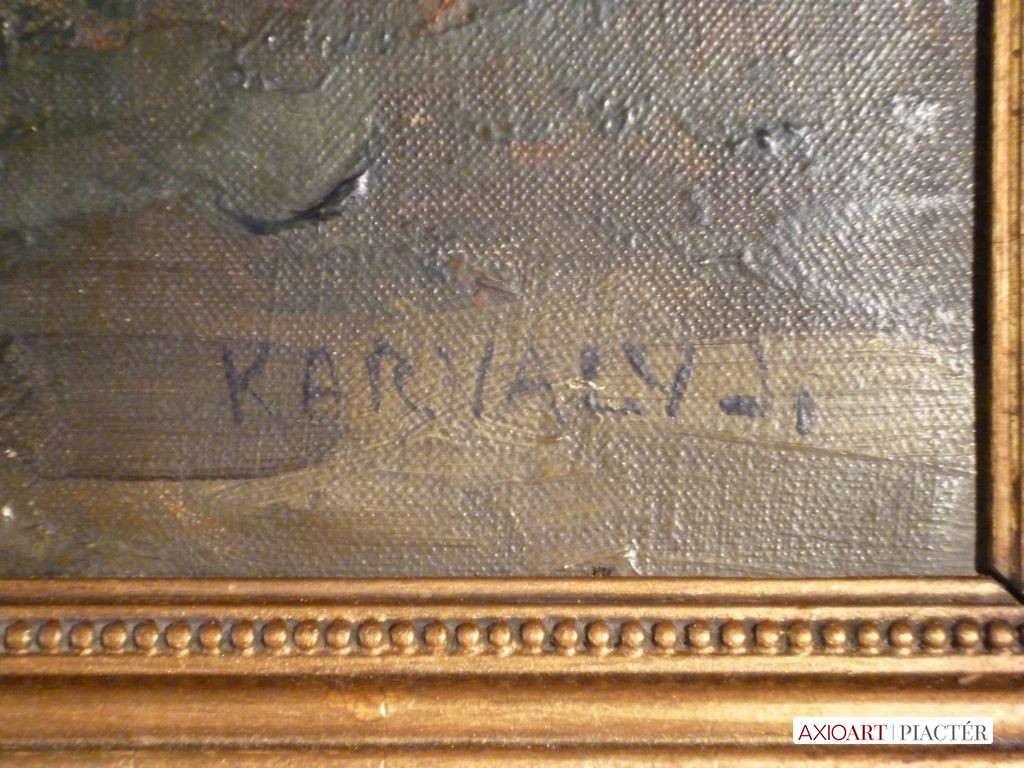 [3047/025] Jelezve jobbra lent KARVALY J. Olaj vászon festmény, azonnal falra akasztható, szép állapotban, kerete hibátlan, nem lepattant. Szélesség: 100 cm Hosszúság: 76.5 cm Festő. Budapesten, a Képzőművészeti Főiskolán, Székely Bertalan és Karlovszky Bertalan voltak a mesterei, Münchenben Hollósy Simon növendéke volt. 1899-ben Itáliában járt tanulmányúton. 1895- 1909 között főleg képmásokkal szerepelt a Műcsarnokban.  Mérete 86 x 62 cm, kerettel együtt 100 x 76,5 cm.