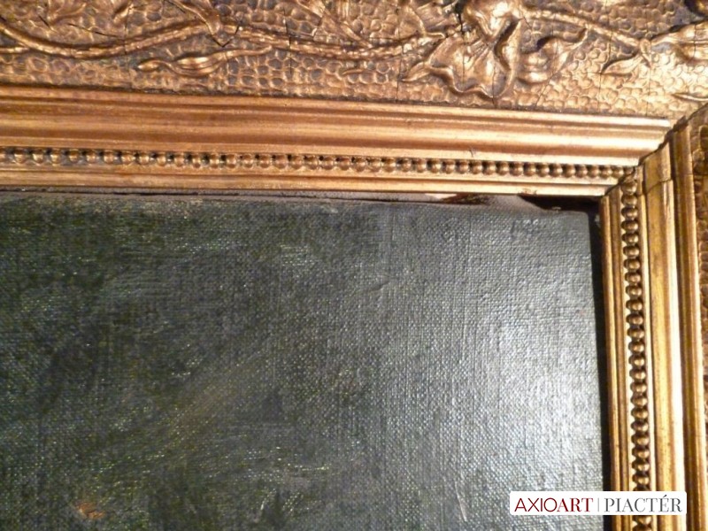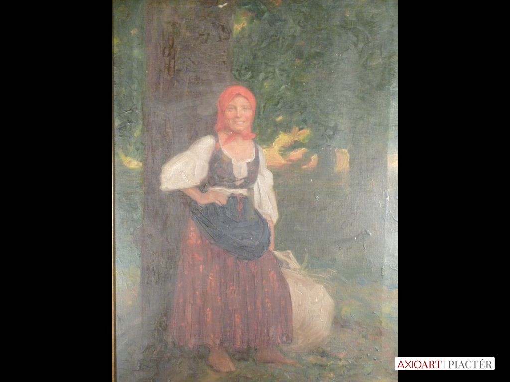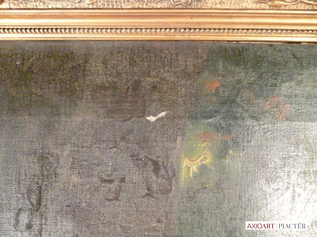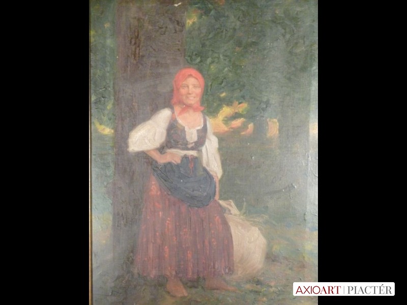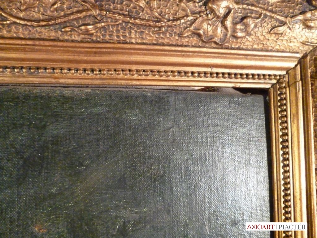 [3047/025] Jelezve jobbra lent KARVALY J. Olaj vászon festmény, azonnal falra akasztható, szép állapotban, kerete hibátlan, nem lepattant. Szélesség: 100 cm Hosszúság: 76.5 cm Festő. Budapesten, a Képzőművészeti Főiskolán, Székely Bertalan és Karlovszky Bertalan voltak a mesterei, Münchenben Hollósy Simon növendéke volt. 1899-ben Itáliában járt tanulmányúton. 1895- 1909 között főleg képmásokkal szerepelt a Műcsarnokban.  Mérete 86 x 62 cm, kerettel együtt 100 x 76,5 cm.