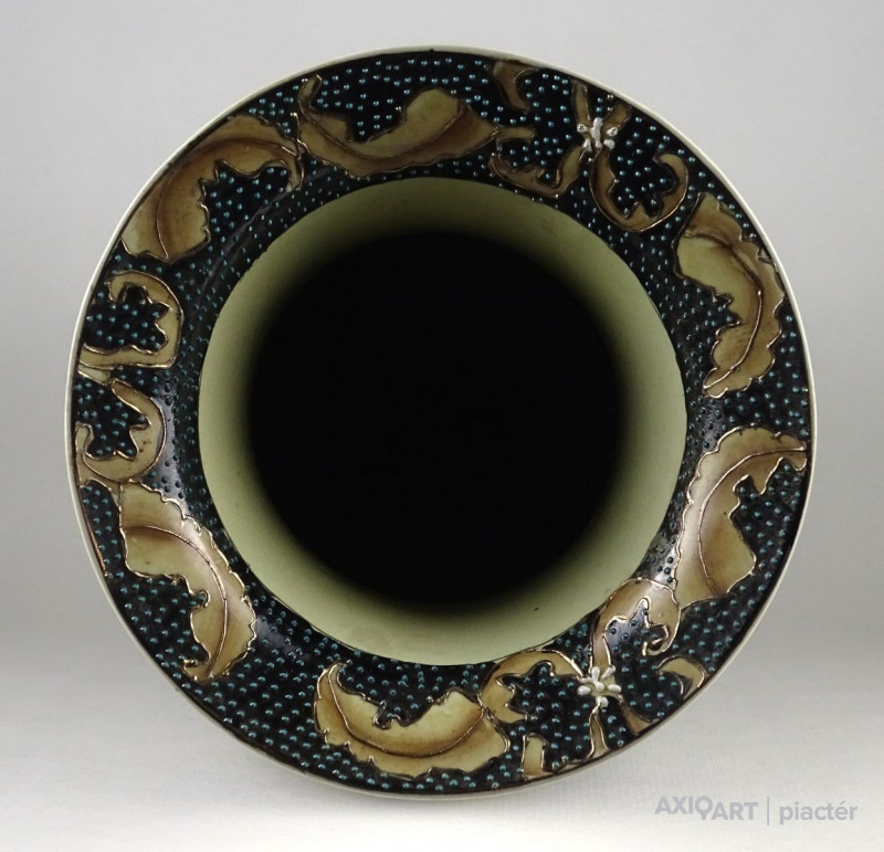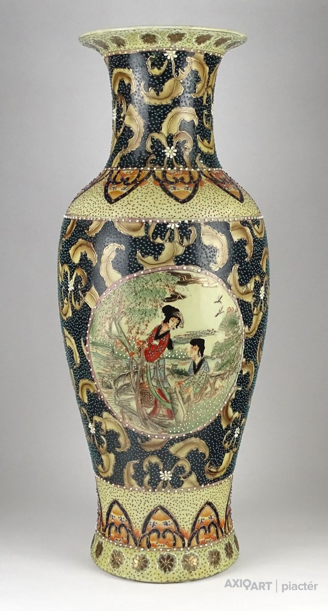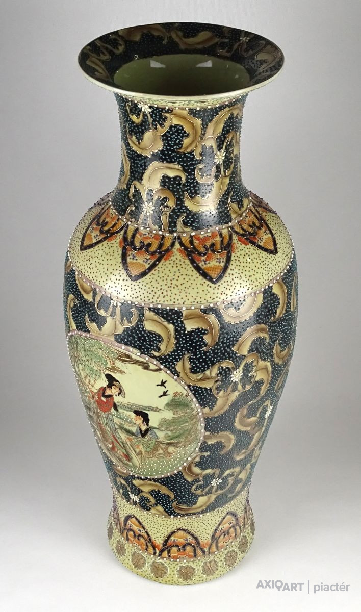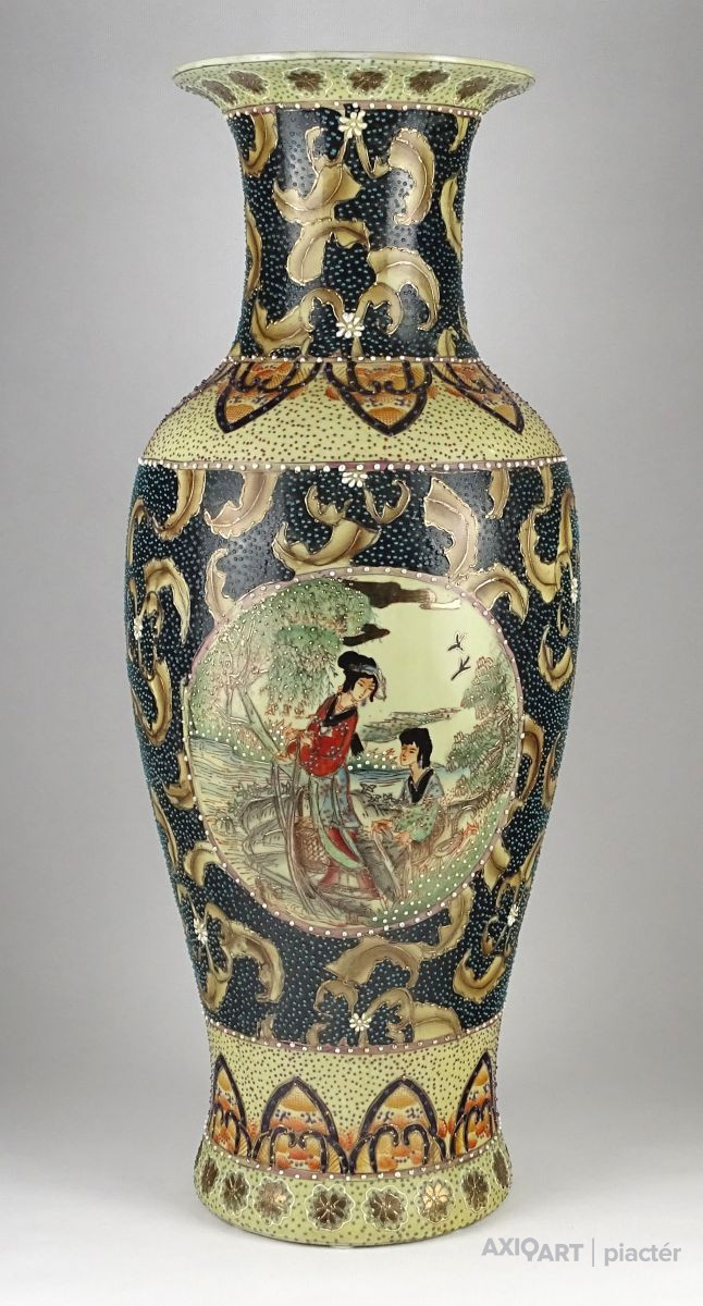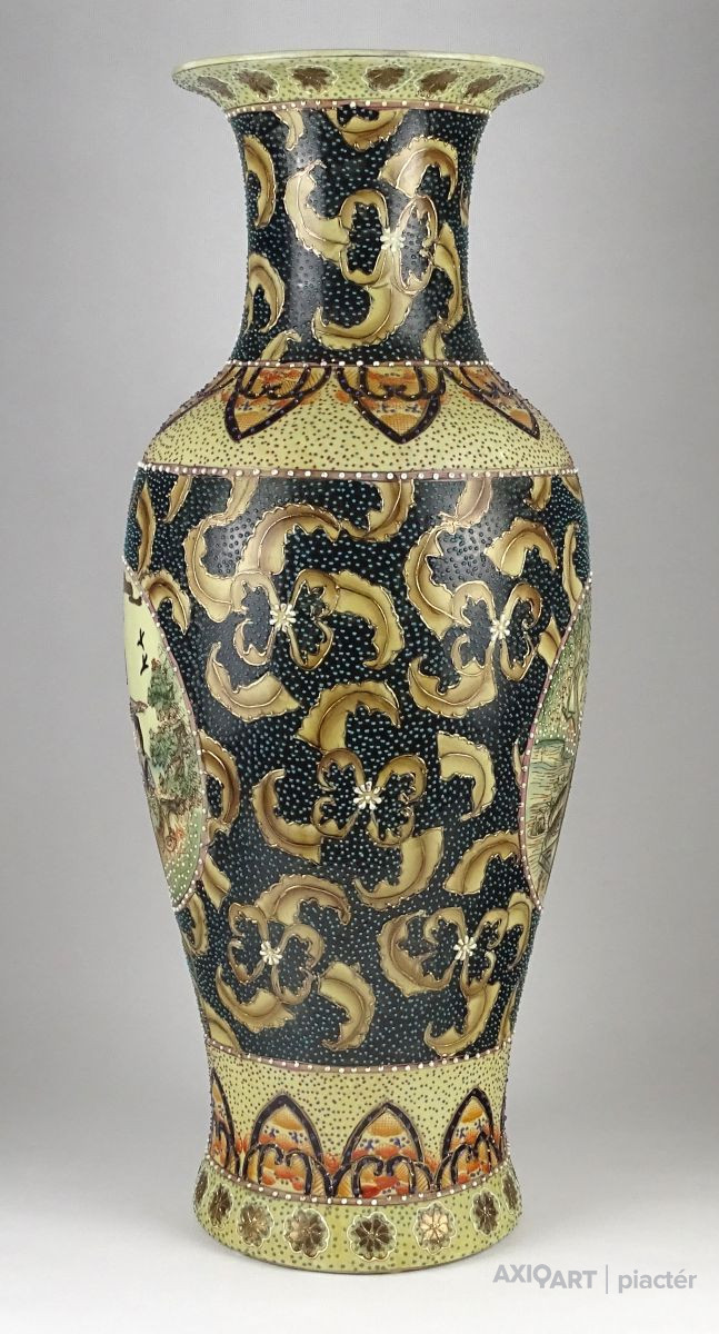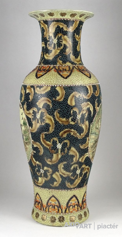 Hatalmas méretű, hibátlan állapotú, gazdagon aranyozott, keleti porcelán váza, padlóváza. Gyönyörű, kétalakos porcelán váza. A váza teljes felülete gyönyörűen írókázott, pöttyözött.