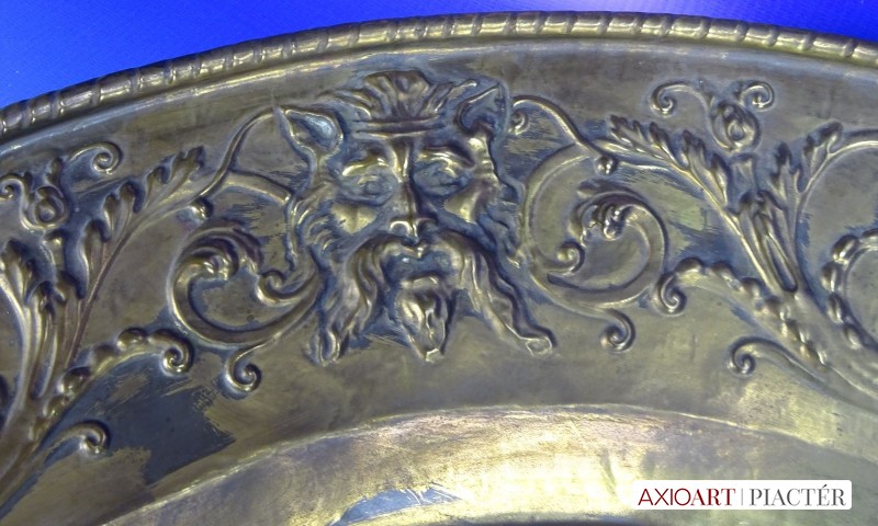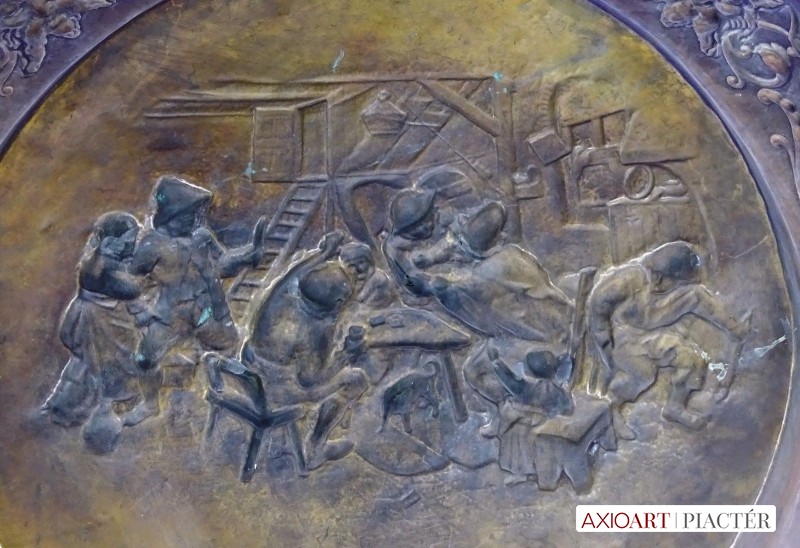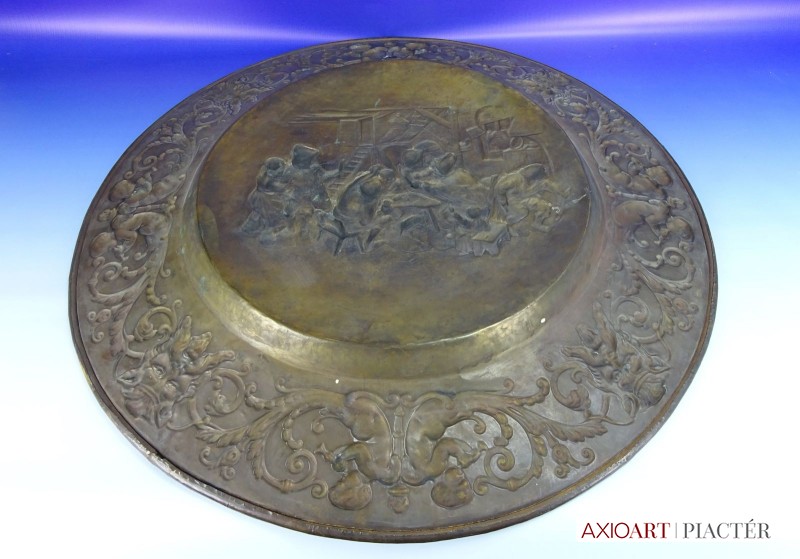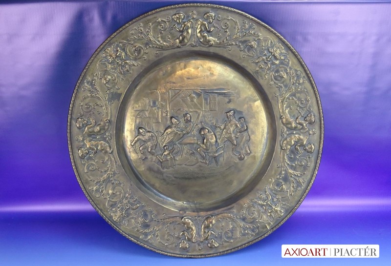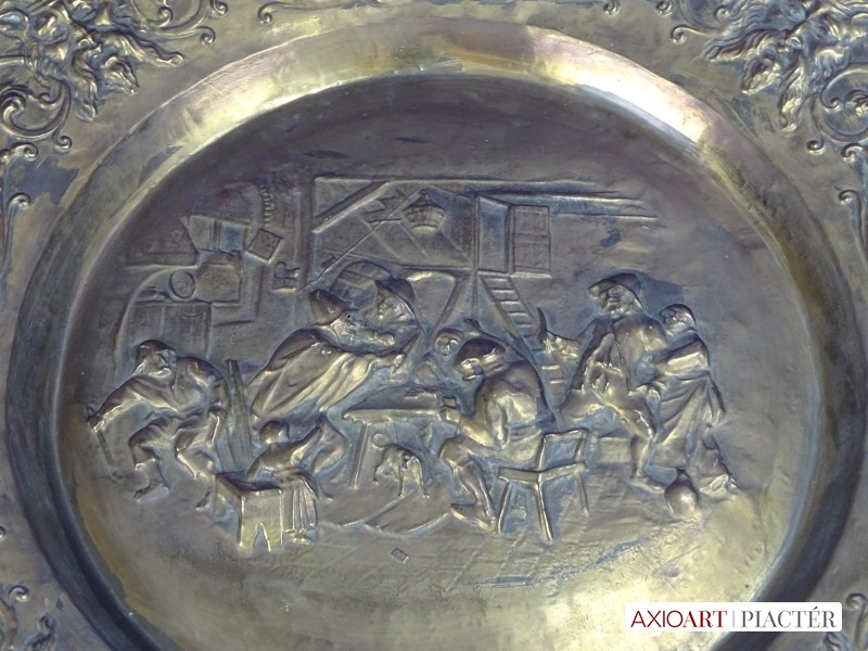 [0H251/X056] Régi XX. század eleji jelenetes fali sárgaréz kézimunka tál. Hajtott széllel, középen 6 alakos kocsmajelenet, faunfej és sok angyal, puttó díszítés látható. Gyönyörű, gyűjteménybe való darab. Szélesség: 63 cm Súly: 1.58 kg