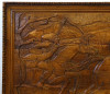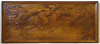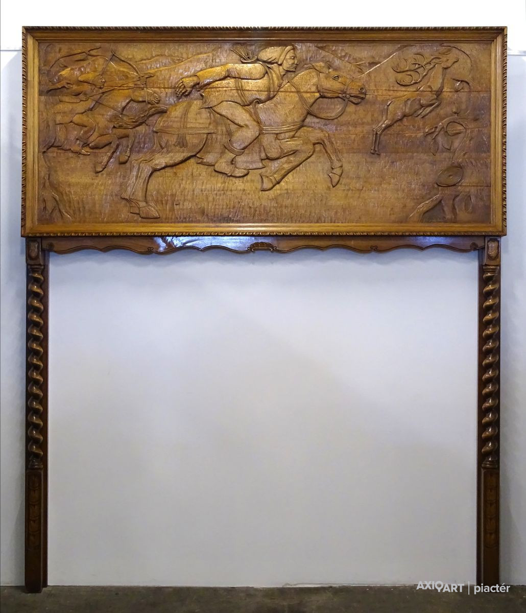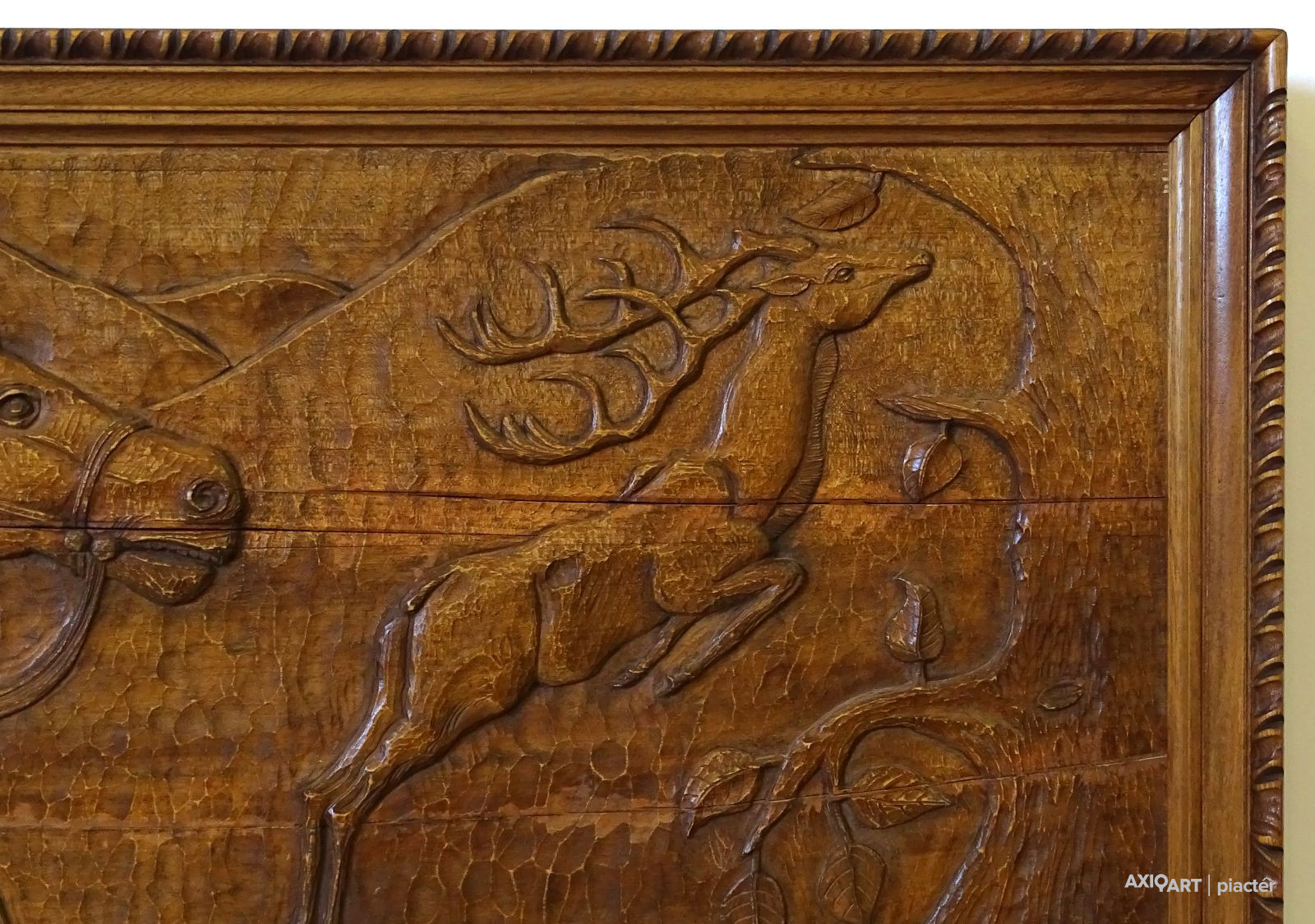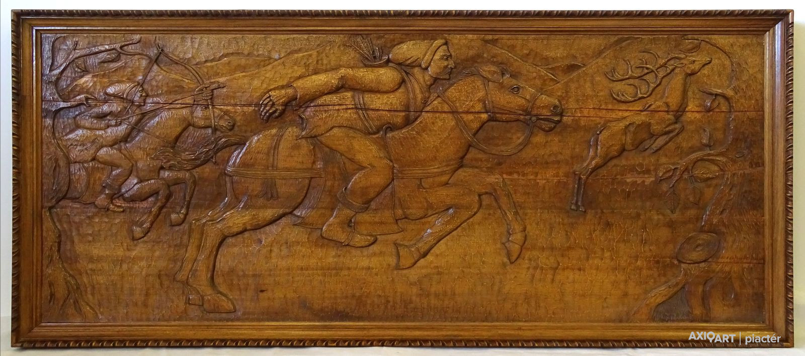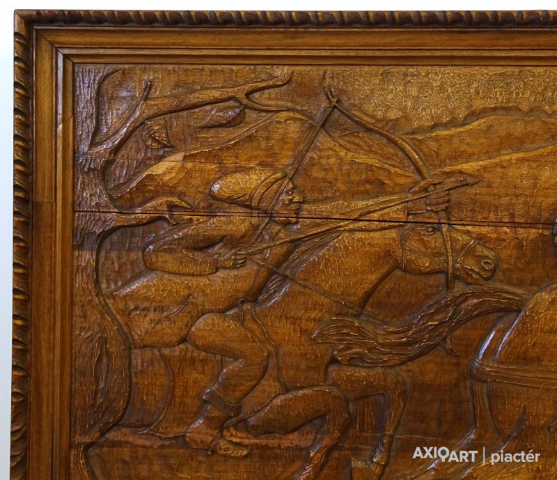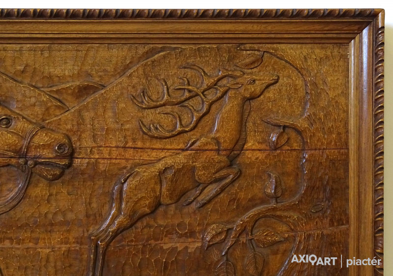Hatalmas méretű faragott ősmagyar mondai csodaszarvas űzése fafaragás falikép 305 x 262 cm