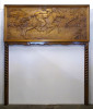 [1B110/BX-10] Hatalmas méretű, két darab csavart oszlopos, címerpajzsos faragott lábakon álló fafaragás. Vadászat a csodaszarvasra. Magasság: 305 cm Szélesség: 262 cm