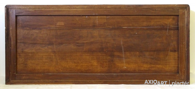 [1Y029/Z018] Olaj farost festmény, üveglap mögött, hibátlan képcsarnokos keretben. Hátoldalán Képcsarnok Vállalat papír címkéje: A művész neve: SCHÉNER MIHÁLY A kép címe: TÁJ Magasság: 66.5 cm Szélesség: 86 cm Súly: 6.54 kg Schéner Mihály festő, grafikus, szobrász, keramikus, bábtervező Medgyesegyháza, 1923-01-9 Elhalálozott: Budapest, 2009. május 11. Honlap: http://www.kormendigaleria.hu/kiadvany.html 1942-1947: Magyar Képzőművészeti Főiskola, tanára: Rudnay Gyula. 1978: Munkácsy-díj; 1984: érdemes művész; 1989: kiváló művész; 1995: Kossuth-díj. 1992-től a Magyar Művészeti Akadémia, 1993-tól a Széchenyi Irodalmi és Művészeti Akadémia tagja. 1956-ig tanított. 1982: Nagyatádi Faszobrász Alkotótelep, 1985: Nemzetközi Acélszobrász Alkotótelep, Dunaújváros. A stílusában felismerhető, mégis sokféle műtárgyat létrehozó ~ gazdag, állandóan alakuló életműve a folyton változó világban helyét kereső, az alkotói szabadságot megvalósító XX. századi képzőművész példázata lehetne. Magát expresszív-szürrealista alkotónak nevezi. Egyaránt dolgozik festékkel, textillel, fával, fémmel. Rajzol, szerkeszt, farag, épít, gyúr, varr és ragaszt, felhasználja a mézesbábok öntőformáit. Festő, rajzoló, textilszobor- és bábkészítő, fazekas, asztalos, esztergályos. Háromlépcsős folyamatban gondolkozik: rajzban tervez, majd fest, szobrot készít, “formába önt”, mindig a végső plasztikai megoldást keresi. Ami állandó és mégis játékosan változékony megjelenésű Schéner művészetében, az a gyermekkori emlékek által meghatározott népi mesterségek iránti tiszteletet kifejező motívumkincs, a tárgyi folklór formakészlete, amely már-már kézjegyként ismétlődik munkáin. Mitologikussá nőtt képzelete új lényeket teremt, pl: a Pigulát, amely disznótestű, emberfejű teremtmény. Schéner festményein a szürrealista motívumokat konstruktív szerkezetbe rendezi, a geometriát és az organikus természeti motívumokat egyaránt beépíti műveibe. A népi, népművészeti formakincsből merített lovas huszárok, betyárok, szegénylegények cifra szűr mentéje, piros csákója, fekete csizmája, az önálló életet élő zsinórdíszek és mézeskalács bábok, a kiskocsik a gyermekkori vásárok, búcsúk színes forgatagába vezet. A primér motívumokat aztán felváltják a vastagon felhordott felületbe karcolt jelek, vonalhálózatok, amelyek a játszó gyermek homokba rajzolt ábráit, a pásztorember fába vésett üzeneteit, az ősember barlang falába rótt mágikus jeleneteit idézik meg. A művész pillanatnyi érdeklődésének megfelelően a színek búvópatakként tűnnek el és jelennek meg ismét. A 60-as években leginkább a formákkal való játék érdekelte, a festmények felülete egyre gazdagodott: a táblaképek felületén applikációk jelentek meg, vagy lemállasztott rétegek hagyták maguk után hiányukat, motívumok nélküli ősformák, archetipikus képzetek bukkantak fel művészetében. A véletlenszerűnek látszó rétegekkel való játék azonban tudatos komponálás eredménye, amely később nyilvánvaló ritmusnak és formai szerkesztettségnek adja át a helyét, mint a Törvénytáblák c. sorozaton. A különböző művészi kifejezési formák egymásra termékenyítő hatással vannak, át- meg áthatják egymást. Textilszobrai, amelyekkel új műfajt teremtett, ugyanazzal az automatikus, expresszív-szürrealista módszerrel készülnek, mint festményei. A hagyományosan a népművészetben alkalmazott anyag, a filc lehetőséget ad a népi formakincs felelevenítésére, amely azonban a művész különös szürrealista átiratában jelenik meg. A szívekkel kivarrt, zsinórdíszes Posztókotlós c. művén mézesbábok lógnak, hátán huszárok lovagolnak. Egész sor textilből készült kéz-plasztikát alkot, amelyeket az ujjakra rávarrt díszekkel öltöztet, személyesít meg. A színes-különös világból aztán ~ újra puritán képi és formai rendbe juttatja el a nézőt, majd nemsokára tépett, gyűrt, vágott, csorgatott, repedezni hagyott szenvedélyesen vonagló képi felületeket hagy hátra. Schéner készített apró gyermekjátékokat, térstruktúra-tereket, mászókákat is. A magyar népi formák mellett szürreális játékaiban gyakran alkalmaz görög mitológiai alakokat, “elkentaurosodott” lovakat, Gorgó-fejeket, sellőket, hárpiákat, Pán-ábrázolásokat. Schéner nemcsak saját művészetéről publikál, hanem művésztársairól is számos írása jelenik meg, elsősorban az Új Auróra c. folyóiratban, amelynek egy ideig főmunkatársa volt. Irodalom kiállítása, Magyar Építőművészet, 1962/4. Húsz év után, Művészet, 1965/4. BOZÓKY M.: ~, Tiszatáj, 1968/5. PERNECZKY G.: Nincs uborkaszezon, Élet és Irodalom, 1969. augusztus 8. BARÁNSZKY-JÓB L.: ~, Művészet, 1969/9. LÁSZLÓ GY.: ~ kaposvári kiállítása, Jelenkor, 1969/4. MAJOR M.: Pásztorok, betyárok, huszárok - kezek, Tükör, 1970. szeptember 15. FRANK J.: Bemutatjuk ~t, Élet és Irodalom, 1972. május 6. ról kiállítása ürügyén, Képzőművészeti Almanach, Budapest, 1972 Sötétkék kokasok, Élet és Irodalom, 1973. szeptember 9. MAJOR M.: ~ játékai, Élet és Irodalom, 1974. július 27. BARTA J.: Egy különös művész, Alföld, 1974/6. VADAS J.: Szárnykészítők, Élet és Irodalom, 1975. október 4. JUHÁSZ F.: A halál ellen játszani, Élet és Irodalom, 1975. május 17. PAP G.: Kincsek és műkincsek, Művészet, 1975/6. P. SZŰCS J.: Az utak kettéválnak, Művészet, 1978/3. Békési művészet, Művészet, 1978/7. SZAMOSI F.: ~ [kismonográfia], Budapest, 1978 VADAS J.: Játék a játékkal, Élet és Irodalom, 1979. augusztus 18. NÉMETH L.: ~ műveiről, Művészet, 1979/4. MIKLÓS P.: Mit akar ez a múzeum?, Művésze