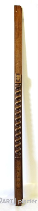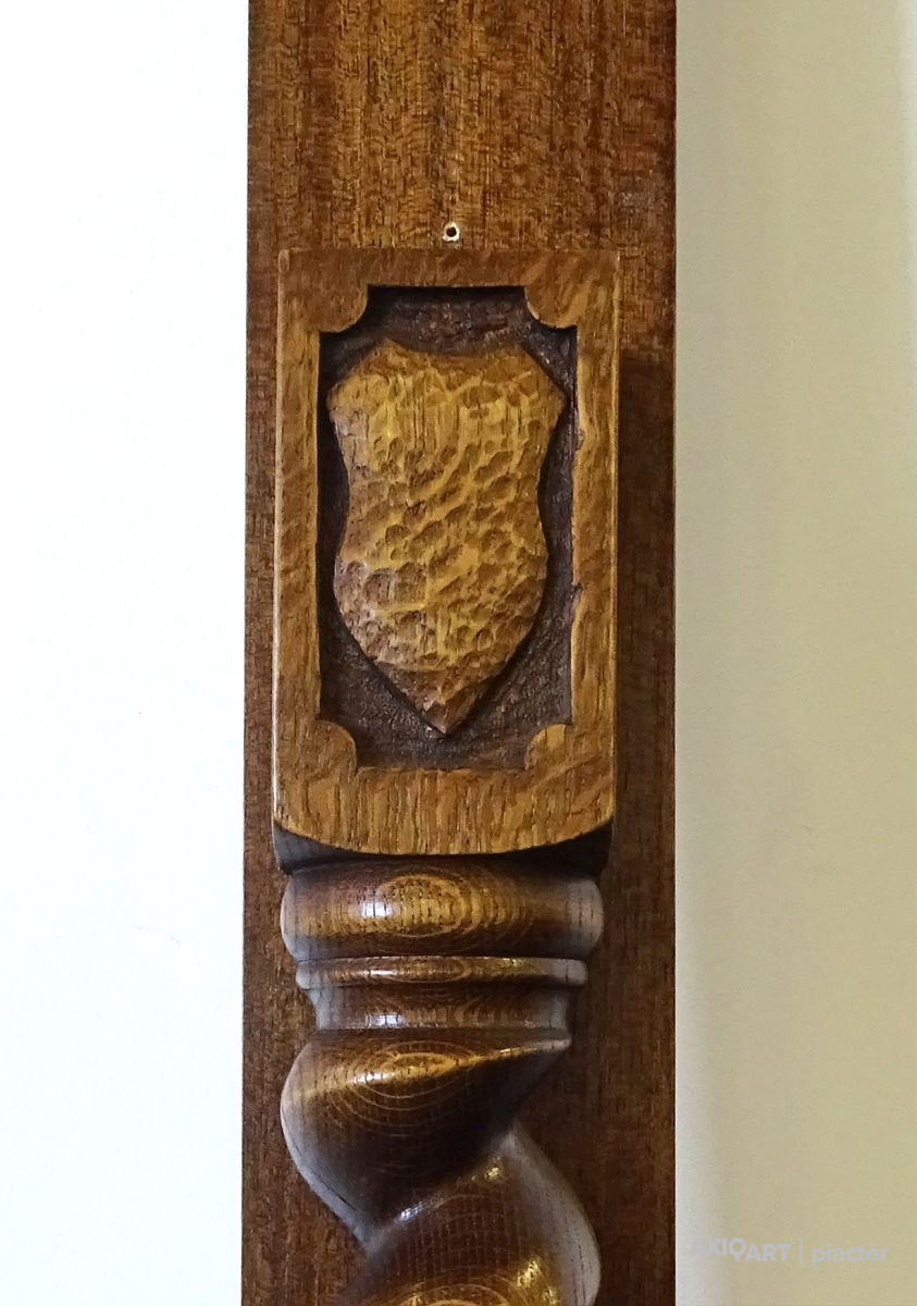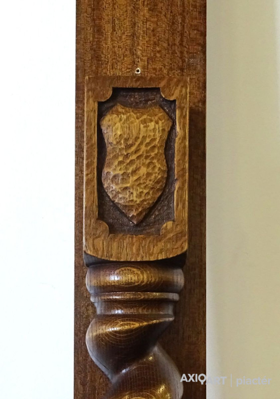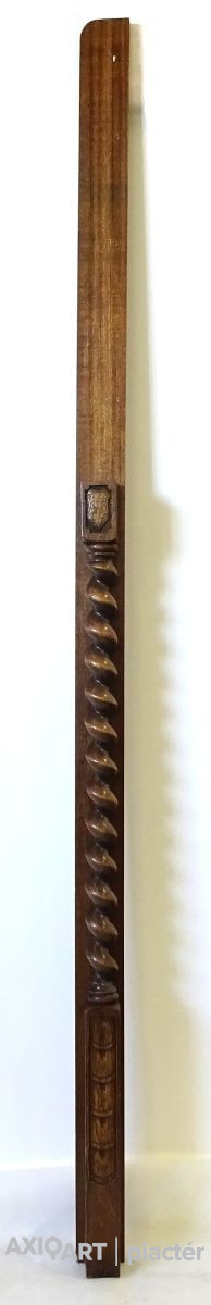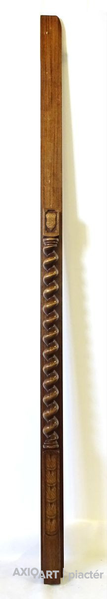 Hatalmas méretű, két darab csavart oszlopos, címerpajzsos faragott lábakon álló fafaragás. Vadászat a csodaszarvasra.