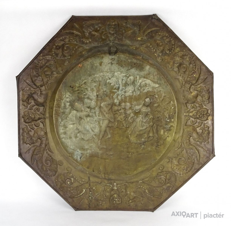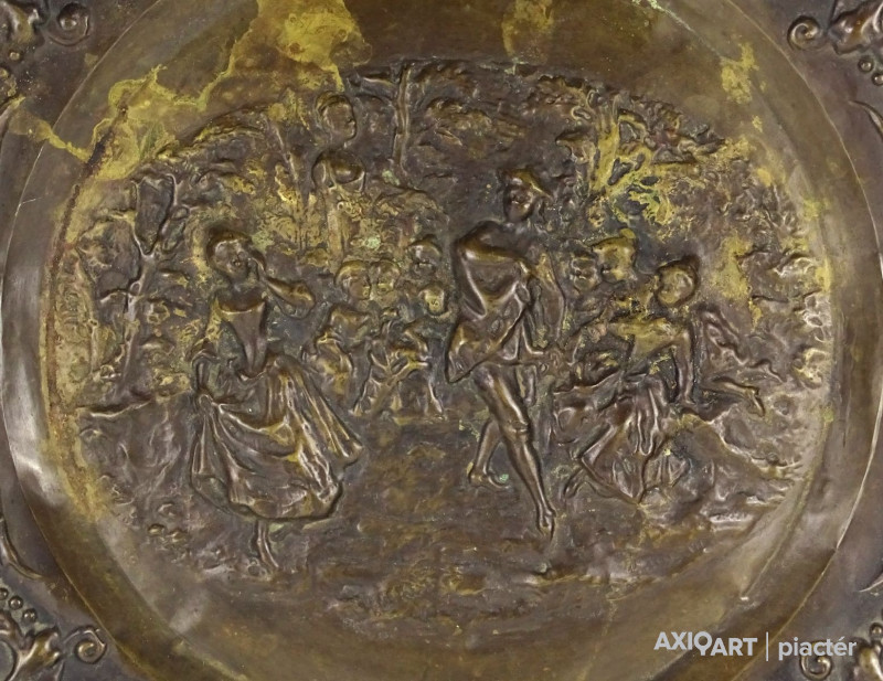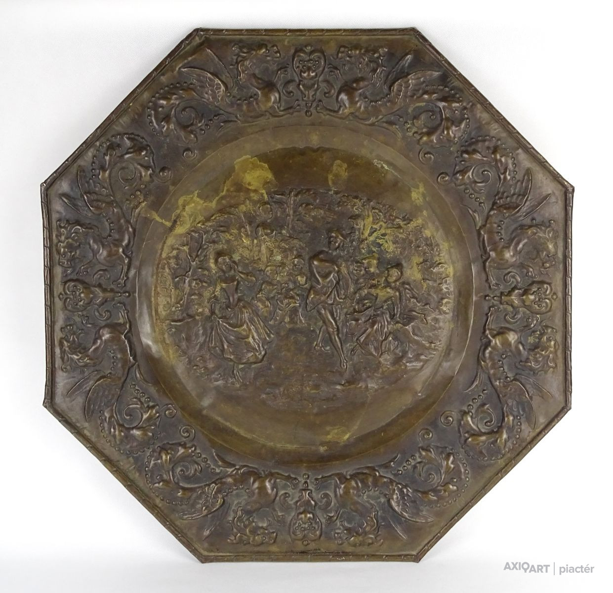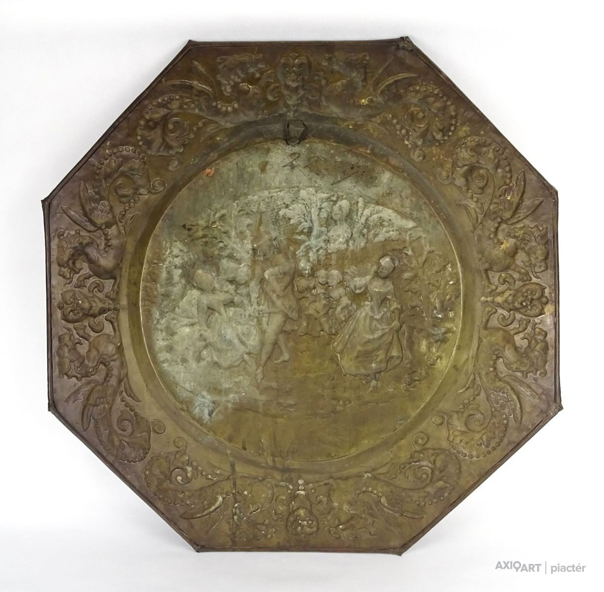 Régi XX. század eleji jelenetes fali réz kézimunka tál. Hajtott széllel, középen 10 alakos jelenet, körben nagy méretű nyolc sárkánydíszítés látható.