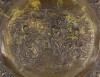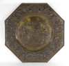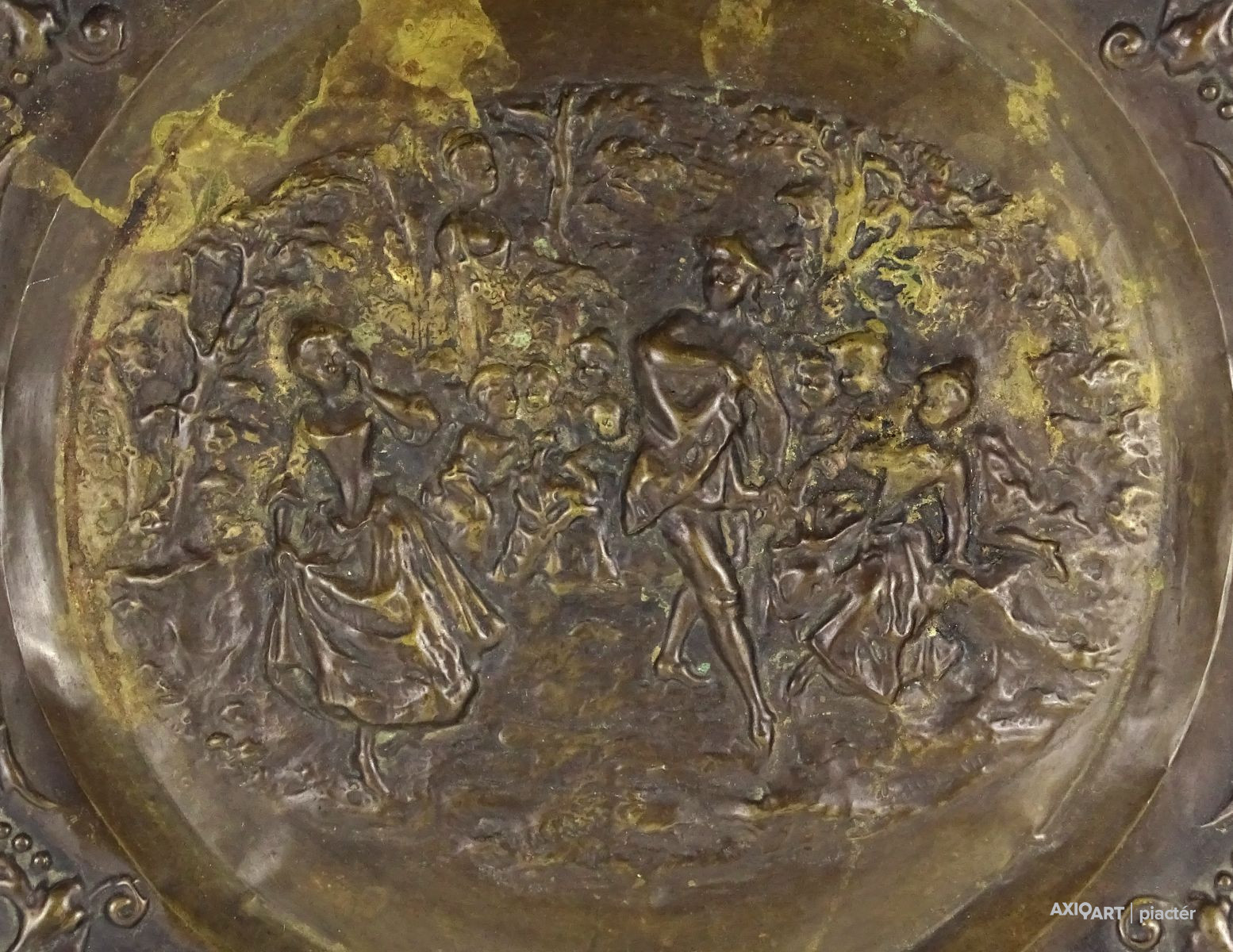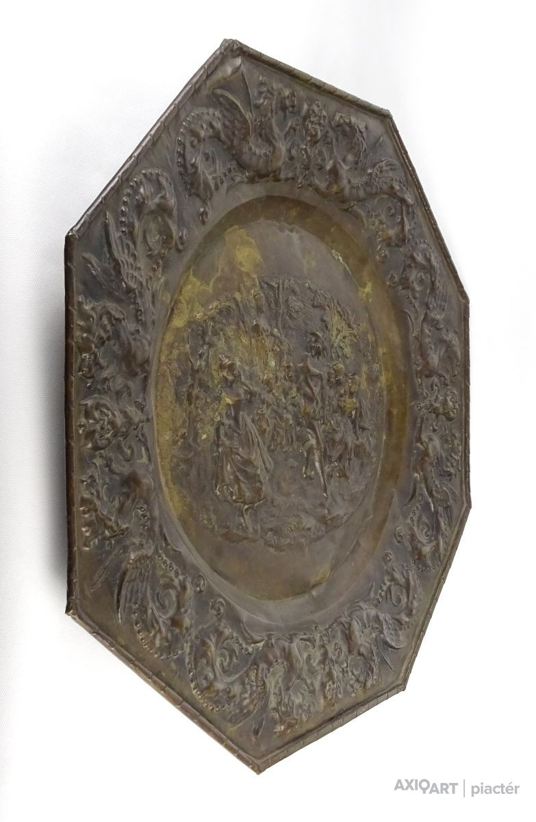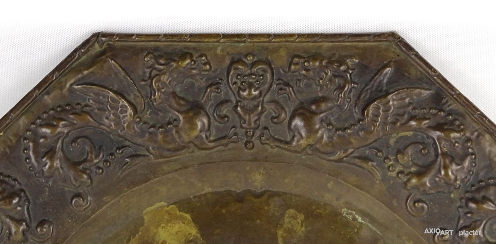 Régi XX. század eleji jelenetes fali réz kézimunka tál. Hajtott széllel, középen 10 alakos jelenet, körben nagy méretű nyolc sárkánydíszítés látható.