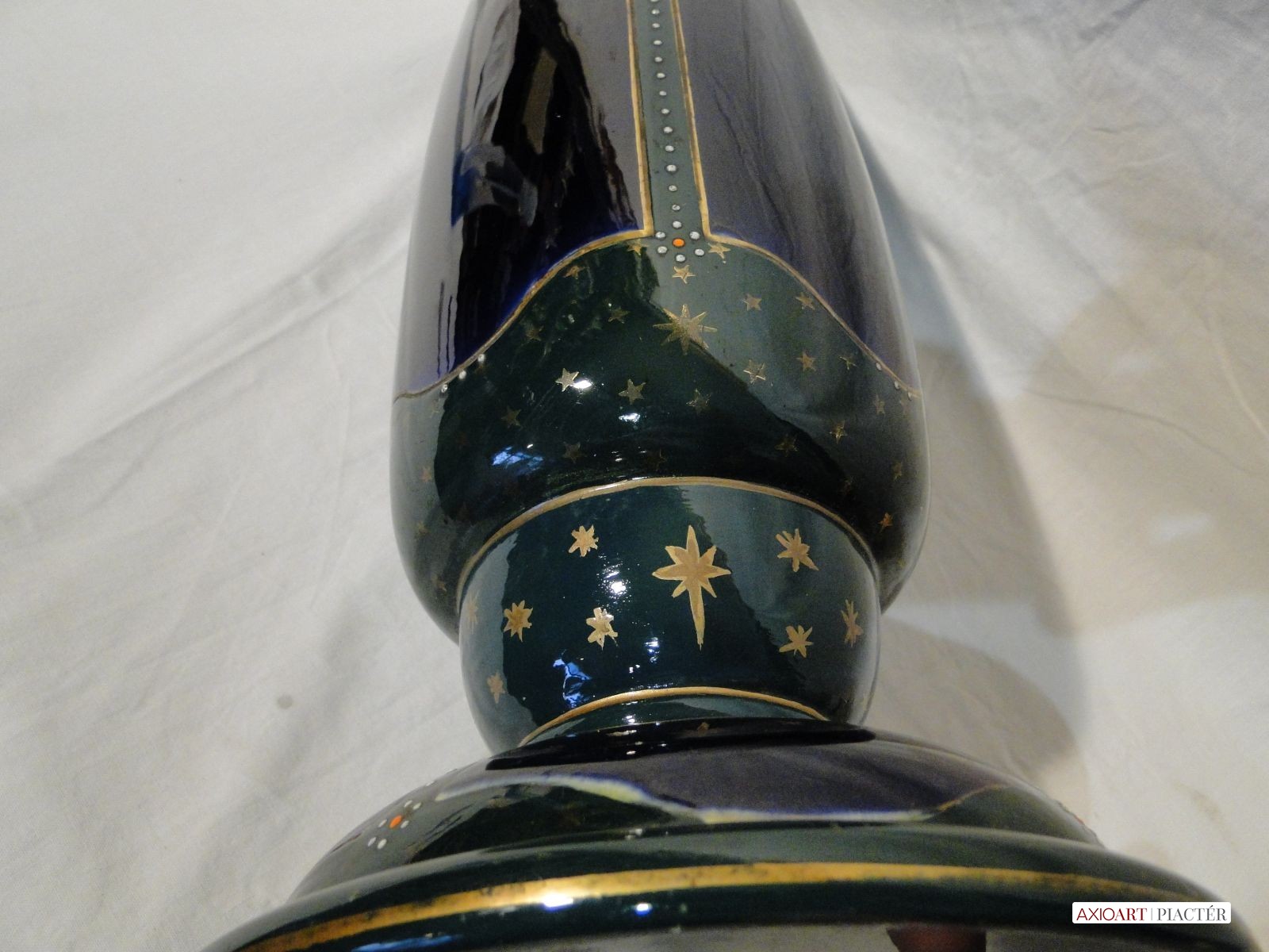 [5217/BX-3] Gyönyörű, kobaltkék, méregzöld antik majolika váza, cca. 1900-as évek elejéről származik. Nyakánál és a szűkítésnél javításnyomok, gyönyörűen megcsinált példány. Gyűjteménybe való darab, restaurált. Jelzés nincs a darabon. Magasság: 55 cm Szélesség: 21 cm Súly: 3.968 kg Száj átmérője: 7,5 cm