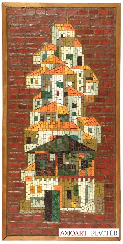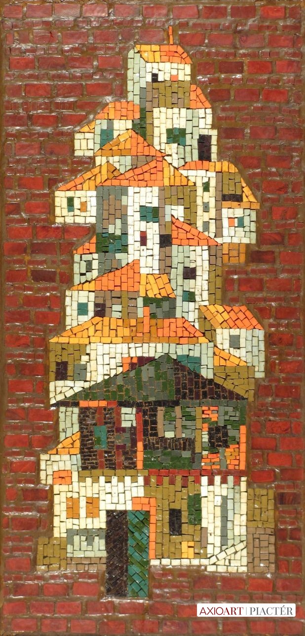 [FKA386/Z006] A kép mérete: 100 x 49 cm keret nélkül. Készült: mozaik, mozaik A kép Hegyi György (Budapest, 1922) alkotása. Jelezve hátul "Hegyi: Trnovo" A festmény jó állapotban van. Keret: Ép A festmény hátoldalán Képcsarnok vállalat raglapja látható. Magyar festők és grafikusok életrajzi lexikona I-II. Festő. A budapesti Képzőművészeti Főiskolán Berény Róbert, Barcsay Jenő és Fónyi Géza tanítványa volt. Tanulmányúton járt Itáliában, Izraelben, Francia- és Görögországban. Korán kapcsolatba került Szentendrével, s a szentendrei festészettel. Első önálló kiállítása 1946-ban Kolozsvárott volt. Ezután több itthoni bemutatón vett részt. 1954-ben és 1962-ben Budapesten a Fényes Adolf Teremben szerepelt önálló tárlaton. Németországban és Izraelben is bemutatta alkotásait. Első ismert festményein és grafikáin - Vajda és Barcsay nyomán - a konstruktivizmus és a szürrealizmus hatása tapasztalható (Redőny és fia, Hajó 1947). Egyre jobban eltávolodva a naturális előadásmódtól, az ötvenes évek során alakította ki - először csak kísérletképpen - a táblakép mozaikot. Ezt később mozaik-kollázzsá fejlesztette tovább. Monumentális munkákat (mozaik) is alkotott. (L.S.: Új Műv. 1992/3, MÉ) Magyar festők és grafikusok életrajzi lexikona I-II. Műgyűjtők és kereskedők kézikönyve Festő. A budapesti Képzőművészeti Főiskolán Berény Róbert, Barcsay Jenő és Fónyi Géza tanítványa volt. Tanulmányúton járt Olasz-, Francia- és Görögországban, val. Izráelben. Első önálló kiállítása 1946-ban Kolozsváron volt. Ezt követően több hazai bemutatón vett részt. 1954-ben és 1962-ben a Fényes Adolf Teremben volt önálló kiállítása. Németországban és Izráelben is szerepelt műveivel. Festői formanyelve erősen magán viseli a mozaiktechnika iránti vonzódását. Stílusát architektonikus megjelenítés jellemzi. (MÉ) Magyar festők és grafikusok adattára 1946-1951 között Berény Róbert, Barcsay Jenő és Fónyi Géza növendéke a Képzőművészeti Főiskolán. Tanulmányúton Francia-, Olasz- és Görögországban, valamint Izraelben járt. Első önálló tárlata 1946-ban volt Kolozsvárott. A Fényes Adolf Teremben (1954, 1962), Izraelben (1967), Szentendrén (1972), Zalaegerszegen (1974), a Kulturális Kapcsolatok Intézetében (1975), Hajdúböszörményben és az NDK-ban (1976) állított ki. - Festői formanyelve erősen magán viseli a mozaiktechnika iránti vonzódását. Stílusát architektonikus megjelenés jellemzi. - Irod.: P. Sz. T.: Művész életrajzok. Bp. 1985. Művészeti lexikon I-IV. Festő. Tanulmányait a Képzőművészeti Főiskolán Berény Róbert, Barcsay Jenő és Fónyi Géza növendékeként 1951-ben fejezte be. 1946 óta kiállító művész. 1954-ben és 1962-ben a Fényes Adolf-teremben önálló kiállítása volt. Főként mozaikokat készít. (Táncolók, 1951, Egészségügyi Szakszervezet; A város építése, 1952, Dunaújváros; Női figura, 1960, Madách Színház; Pécsváros-Mecsek, 1962, Pécs-Mecsekalja; Felvonulók, 1965, Pápa, MSZMP Székház). Művész életrajzok kortárs magyar képzőművészek Festő, grafikus. 1951-ben fejezte be a főiskolát Berény Róbert, Barcsay Jenő és Fónyi Géza irányításával. Tanulmányúton járt Olasz-, Francia- és Görögországban, megfordult Izraelben, az NDK-ban és Bulgáriában. Első önálló tárlata 1946-ban Kolozsvárott volt, ezt követően a Fényes Adolf Teremben (1954, 1962), a Csók Galériában (1967), Szentendrén (1972, 1982), a Kulturális Kapcsolatok Intézetében (1975), Dunaújvárosban (1980), a Nemzeti Galériában (1981), Győrött és Salgótarjában (1982) állított ki. Önálló anyaggal szerepelt Izraelben (1964), az NDK-ban (1976), Nyugat-Berlinben (1977) és az NSZK-ban (1981). - Festői formanyelve erősen magán viseli a mozaiktechnika iránti vonzódását; stílusát architektonikus megjelenítés, a látvány dekoratív átírása jellemzi. Témái főként a tájjal, a városképpel kapcsolatosak. Kisméretű mozaikjaiban találóan ötvöződik a játékosság és a monumentalitás iránti érzék. Több murális munkája került kivitelezésre. Kortárs magyar művészeti lexikon I-III. Festő, mozaikművész. 1946-50: MKF, mesterei: Berény Róbert, Barcsay Jenő, Fónyi Géza. Az Európai Iskola fiataljai közé tartozik. Csehországban, Franciaországban, Olaszországban, Bulgáriában, a Szovjetunióban és Izraelben járt tanulmányúton. 1964-től tagja a régi Szentendrei Művésztelepnek. Habár táblaképei és grafikái egész életművén keresztül folyamatosan készülnek, a művészt leginkább mozaikjaik és újabb üvegablakai tették híressé. A korábban monumentális műfajként elkönyvelt mozaikművészetet átértelmezve sorozatban készíti táblaképméretű mozaikjait. Üveg ablakainak formarendje nagyvonalú. Muráliái, melyeken közérthető szimbolikára törekszik, igényesen közvetítik humanista meggyőződését. Ek: 1945: Vasas Szakszervezet Székh., Kolozsvár; 1954: Fényes A. T.; 1962: Fényes A. T.; 1964: Bet. Sokolov, Tel-Aviv; 1967: Csók G.; 1972: Művésztelepi G., Szentendre (kat.); 1975: Képcsarnok, Zalaegerszeg; KKI Dorottya u. G.; 1976: Magyar Kultúra H., Berlin (NDK); 1977: Tv-székh., Nyugat-Berlin; 1980: KPVDSZ Műv. H., Tatabánya; 1981: Vegyipari Művek, Sajószentpéter; MNG Műhely Kiállítás; Plevisast G., Hamburg; 1982: Művésztelepi G., Szentendre (kat.); Képcsarnok, Salgótarján; Xantus J. M., Győr; 1984: Iskolag., Csepel; 1985: Városháza M., Nahariya (IZR); Műhely G., Szentendre; 1986: II. kerületi Népfront (Végh Andrással); 1988: Szőnyi I. T., Miskolc, 1990: Vizualart Alkotóközösség G.; 1992: Ferenczy M., Szentendre (gyűjt. kat.); 1995: Újlipótvárosi Klubg.; 1996: Thermal Hotel Aquincum G.; 1997: Körmendi G.; 1999: Újlipótvárosi Kl