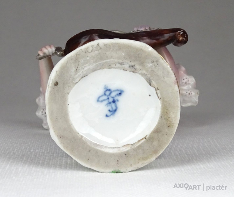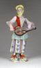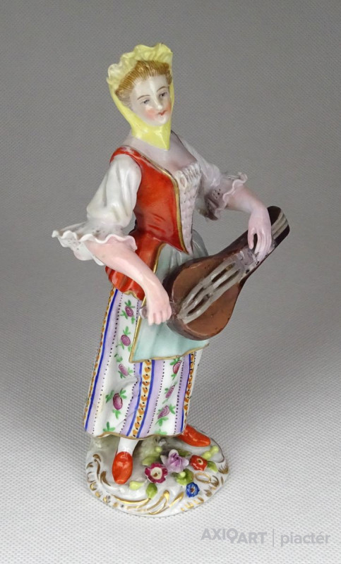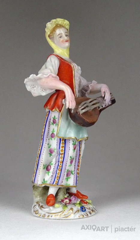 Antik szép állapotú barokk porcelán figura talapzaton. Kézzel festett részeltgazdag XVIII. század végi darab. Nyaka kezei és a hangszer is restaurált.