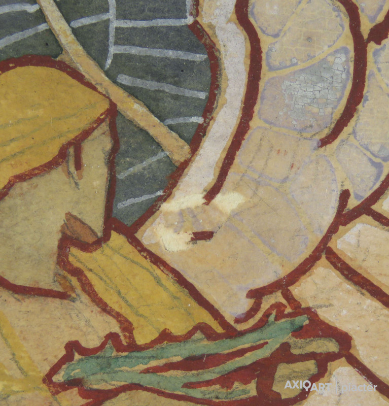 [FKD030/Bp90/35] A kép mérete: 126 x 100 cm keret nélkül. Készült: Szén, tempera, Papír A kép Szabó Zoltán Angyalföldi (Budapest, 1929) alkotása. Jelezve jobbra fent "Szabó Z 72" A festmény jó állapotban van. Keret: Ép A festmény hátoldalán kiállítási címke: Műcsarnoki törzslap 1973. X. Magyar festők és grafikusok életrajzi lexikona I-II. Festő. Rajkai György beszélte rá, hogy jelentkezzék felvételre a Képzőművészeti Főiskolára. 1948-49-ben a Dési Huber-szakkörben rajzolt, festett Gráber Margit vezetésével. 1950-ben jelentkezett a Képzőművészeti Főiskolára, ahol 1951-ben kezdte meg tanulmányait Fónyi Géza, Barcsay Jenő és Domanovszky Endre keze alatt. 1953-54-ben a főiskola megvált tőle, lekerült Tatabányára, ahol a művésznövendékek számára művésztelepet létesítettek. Számos műve kapcsolódik a tatabányai periódushoz, amelynek élményéből még évek múlva is bőven merít. 1955-ben visszakerült a főiskolára, ahol 1958-ban fejezete be tanulmányait. Ezt követően két évig - a Fiatal Művészek Stúdiójának tagjaként - a stúdió műtermében dolgozott. 1960-63 között Derkovits-ösztöndíjban részesült. Kiállító művészként első ízben 1958-ban a VII. Magyar Képzőművészeti Tárlaton szerepelt jelentősebb anyaggal. Ettől kezdve minden nemzeti tárlaton, a Fiatal Képzőművészek Stúdiójának bemutatóin, jelentősebb hazai és külföldön rendezett magyar seregszemléken részt vett alkotásaival (Ernst Múzeum, Műcsarnok, Tiszti Klub Budapest, Veszprém, Szolnok, Tatabánya, Vác, Győr, Kecskemét, Tallin, Berlin, Varsó, Belgrád, Párizs, Moszkva, stb.). Erőteljes formákkal komponált figurális kompozíciókat, portrékat, városképeket, csendéleteket alkotott olajban, pasztellben, szénnel és temperával. A Nyolcak, Nemes Lampért József és a korai Uitz Béla alkotások formai örökségének legrangosabb mai folytatója. A külföldiek közül Siqueiros és D. Rivera gyakoroltak rá nagy hatást, akik leginkább lehetnek expresszív stílusának mintaképei. Szabó végtelen humanizmusa, őszinte hite az alkotásban, a tiszta emberi kapcsolatokban és a szeretetben, az emberi lét himnuszává fokozódik vásznain. Monumentális, óriási lendület jellemzi alakjait, akár táblaképről, szénrajzról, akár monumentális munkáról van szó. Díjak: a Stúdió pályázatának I. díja; Munkácsy-díj; a Szolnoki Festészeti Triennále II. díja; Érdemes Művész. Sok murális alkotást is készített (Sátoraljaújhely, Csongrád, Baja, Bácsalmás, stb.). Alkotásai helyet kaptak a Magyar Nemzeti Galériában, a Legújabbkori Történeti Múzeumban és több vidéki képtárban. (Egri Mária: Szabó Zoltán, MÉ, H.J.: Műv. 1970/8, Műv. 1976/5, A.J.: Műv. 1985/2) Magyar festők és grafikusok életrajzi lexikona I-II. Műgyűjtők és kereskedők kézikönyve Festő. Művészeti tanulmányait a Dési Huber István szakkörben kezdte, ahol Gráber Margit korrigálta. 1950-ben jelentkezett Budapesten, a Képzőművészeti Főiskolára. Fónyi Géza, Barcsay Jenő és Domanovszky Endre voltak a mesterei. Siqueiros és Diego Rivera is nagy hatást gyakoroltak rá, akik leginkább lehetnek expresszív stílusának mintaképei. 1958 óta szerepel hazai és külhoni tárlatokon (Műcsarnok, Ernst Múzeum, stb.). 1960-63 k. Derkovits-ösztöndíjas volt. 1969-ben Munkácsy-díjjal tüntették ki. 1977-ben érdemes művész címet kapott. Végtelen humanizmusa, őszinte hite a munkában, a tiszta emberi kapcsolatokban, a szeretetben, az emberi lét himnuszává fokozódik vásznain. Monumentális, hatalmas lendület jellemzi figuráit, akár táblaképről, szénrajzról akár monumentális műről van szó. Sok murális munkát is készített (Sátoraljaújhely, Csongrád, Baja, Bácsalmás, stb.). A NYOLCAK, Nemes Lampért és a korai Uitz munkák formai örökösének legrangosabb mai folytatója. (MÉ, H.J.: Műv.-1970/8, Műv.-1976/5, A.J.: Műv.-1985/2) Magyar festők és grafikusok adattára Művészeti tanulmányait a Dési Huber szakkörben kezdte, majd 1951-1958-ban Fónyi Géza, Barcsay Jenő és Domanovszky Endre növendéke a főiskolán. 1958-tól minden fontosabb hazai és számos külföldi tárlaton részt vett. Kiállított többek között a Szovjetunióban, Bulgáriában, Jugoszláviában, az NDK-ban, Lengyelországban és Franciaországban. Több vidéki bemutató (Dunaújváros, Szeged, Kecskemét, Szolnok, Győr stb.) mellett 1970-ben az Ernst Múzeumban, 1976-ban a Műcsarnokban jelentkezett gyűjteményes anyaggal. 1976-ban önálló kiállítása volt Tallinban. 1978-ban az Ernst Múzeumban. A Kilencek alapító tagja, és valamennyi kiállításuk résztvevője. 1960-1963-ban a Derkovits-ösztöndíjat, 1969-ben Munkácsy-díjat, 1977-ben érdemes művészi címet kapott. - Művészetében központi helyet foglal el az ember. Végtelen humanizmus, őszinte hite a munkában, a tiszta emberi kapcsolatokban, a szeretetben az emberi lét himnuszává fokozódik vásznain. A Nyolcak formai örökségének legrangosabb mai folytatója. - Irod.: P.Sz.T.: Művész életrajzok. Bp. 1985.; Acsay Judit: Legszívesebben az eget festeném be. Beszélgetés Szabó Zoltánnal. Művészet, 1985. 2. Művészeti lexikon I-IV. Festő. 1951-58 között a Képzőművészeti Főiskolán Fónyi Géza, Barcsay Jenő és Domanovszky Endre tanítványa volt. 1958-tól állítja ki erőteljes formákkal komponált figurális kompozícióit (Almahámozók, Kesztyűs női portré stb.). 1965-ben sgraffitót készített egy sátoraljaújhelyi lakóházra. Művész életrajzok kortárs magyar képzőművészek 1958-ban kapott diplomát Fónyi Géza, Barcsay Jenő és Domanovszky Endre tanítványaként. Azóta minden fontosabb hazai rendezvény résztvevője, gyakorta kiállít külföldön is. Számos vidéki bemutató mellett 1970-ben az Ernst Múzeumban, 1976-ban a Mű