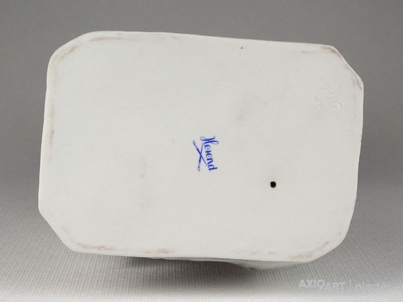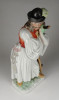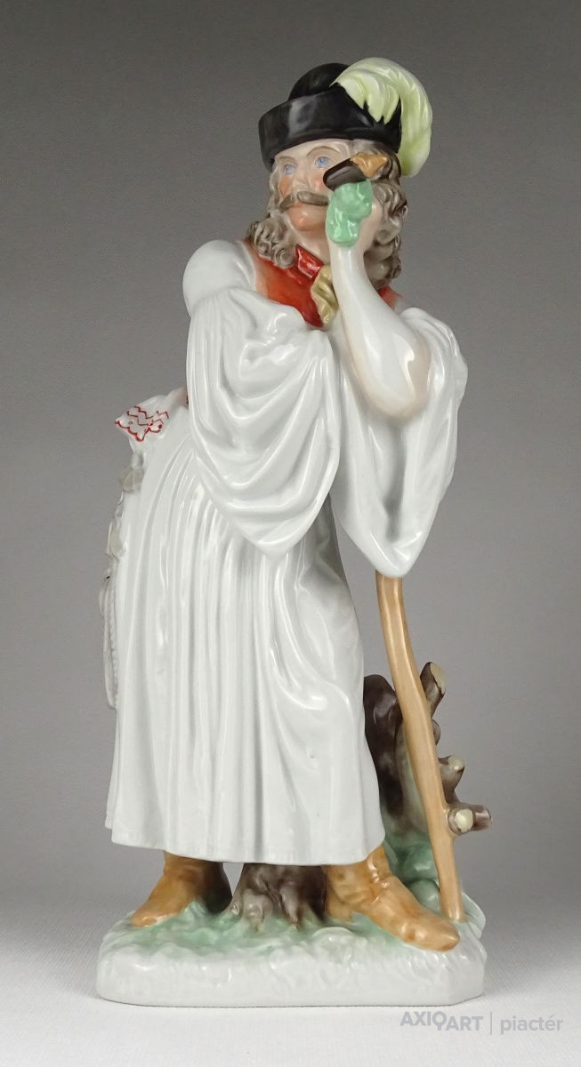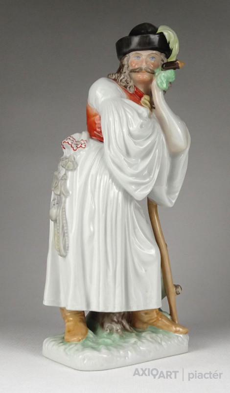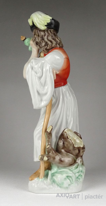 Hibátlan állapotú, talapzaton álló botján támaszkodó, búsuló juhász Herendi figura, kezében pipa.