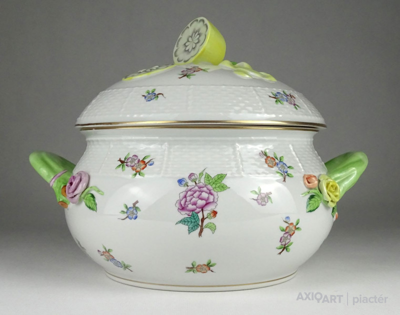[1Q693/UZ-K] Hibátlan állapotú, 35 darabos Eton mintás, Herendi porcelán készlet, étkészlet. A készlet darabjai: - 1 darab citromos levesestál fedővel (21 x 21 x 26.7 cm) - 12 darab mélytányér, levesestányér (24.5 cm) - 12 darab lapostányér (25 cm) - 1 darab szószos tál, mártásos tál (7.5 x 16 x 23.8 cm) - 1 darab mártásos kanál (5.8 x 23.5 cm) - 1 darab mártásos tál alátét tányér (14.7 x 19.7 cm) - 1 darab ovális alakú kínáló tál (21 x 26.5 cm) - 1 darab kis méretű kerek kínáló tál (4.5 x 20.5 cm) - 2 darab egyforma kerek kínáló tál, zöldséges és tésztás burgonyás kínáló tál (5 x 25 cm) - 1 darab nagy méretű lapos kerek kínáló tál, húsos tál (29.5 cm) - 1 darab nagy méretű ovális alakú pecsenyés tál (28 x 37 cm) - 1 darab asztali fűszertartó (7.2 x 14.7 x 4.8 cm) Alján többféle kék Herendi jelzés: - HEREND HUNGARY - HEREND HUNGARY HANDPAINTED 524/ETON - HP 1839 Mélynyomással: HEREND Súly: 17.1 kg   Súly: 1352 g