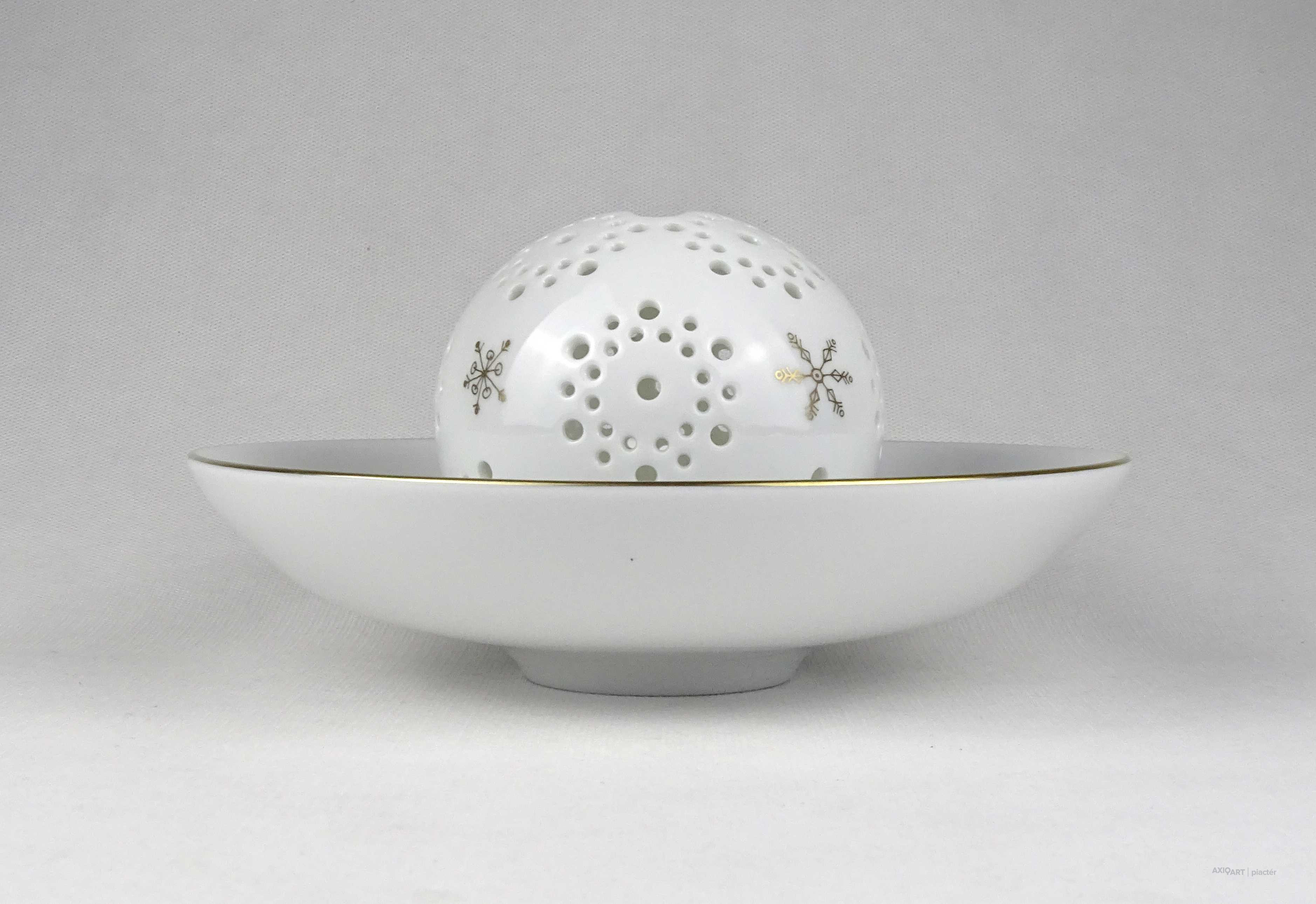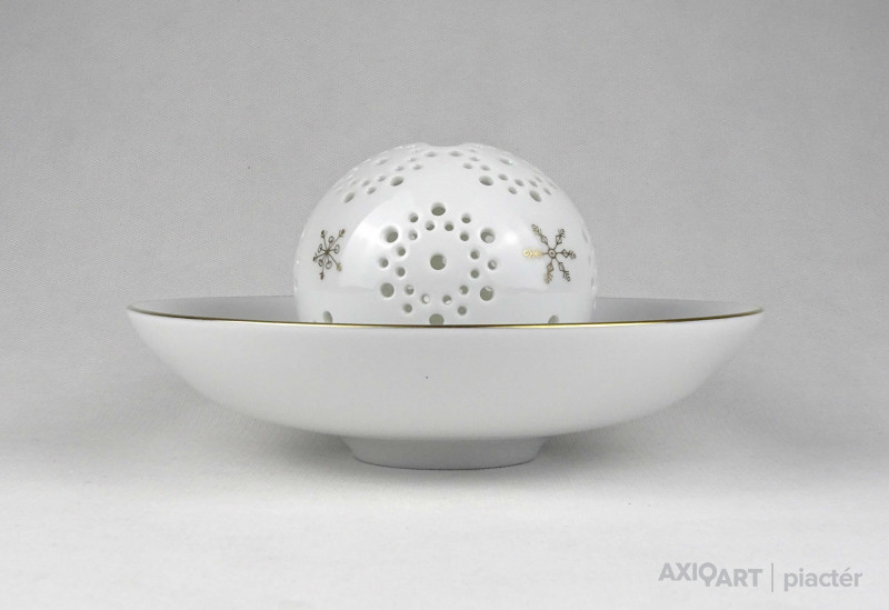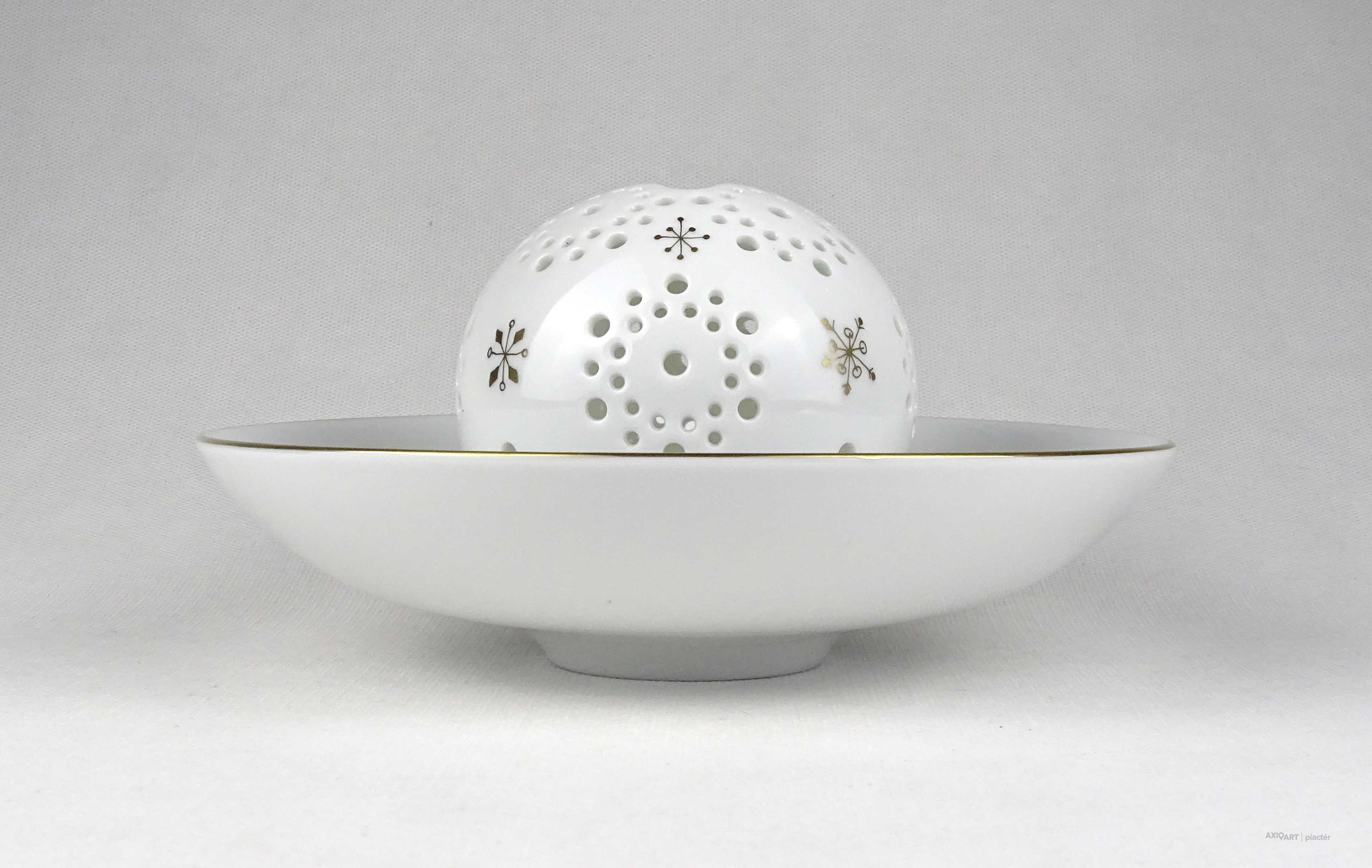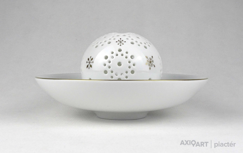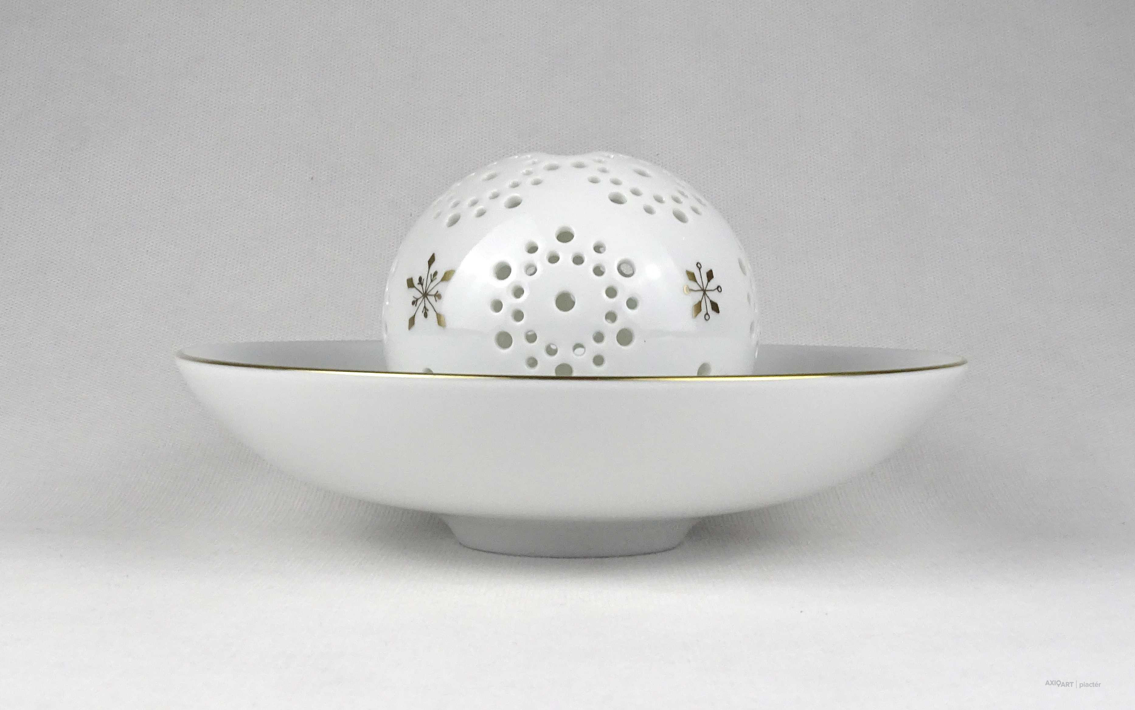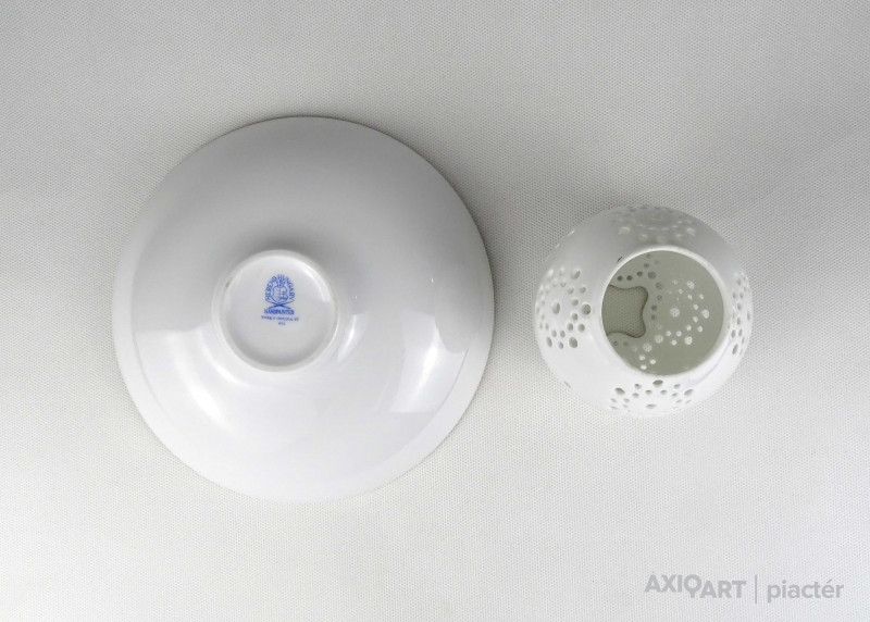 Hibátlan állapotú fehér Herendi porcelán mécsestartó, áttört mintákkal és aranyozással díszített porcelán gömb hozzá illő alátét tányérral. A gömb és a tányér is külön jelzett.