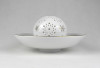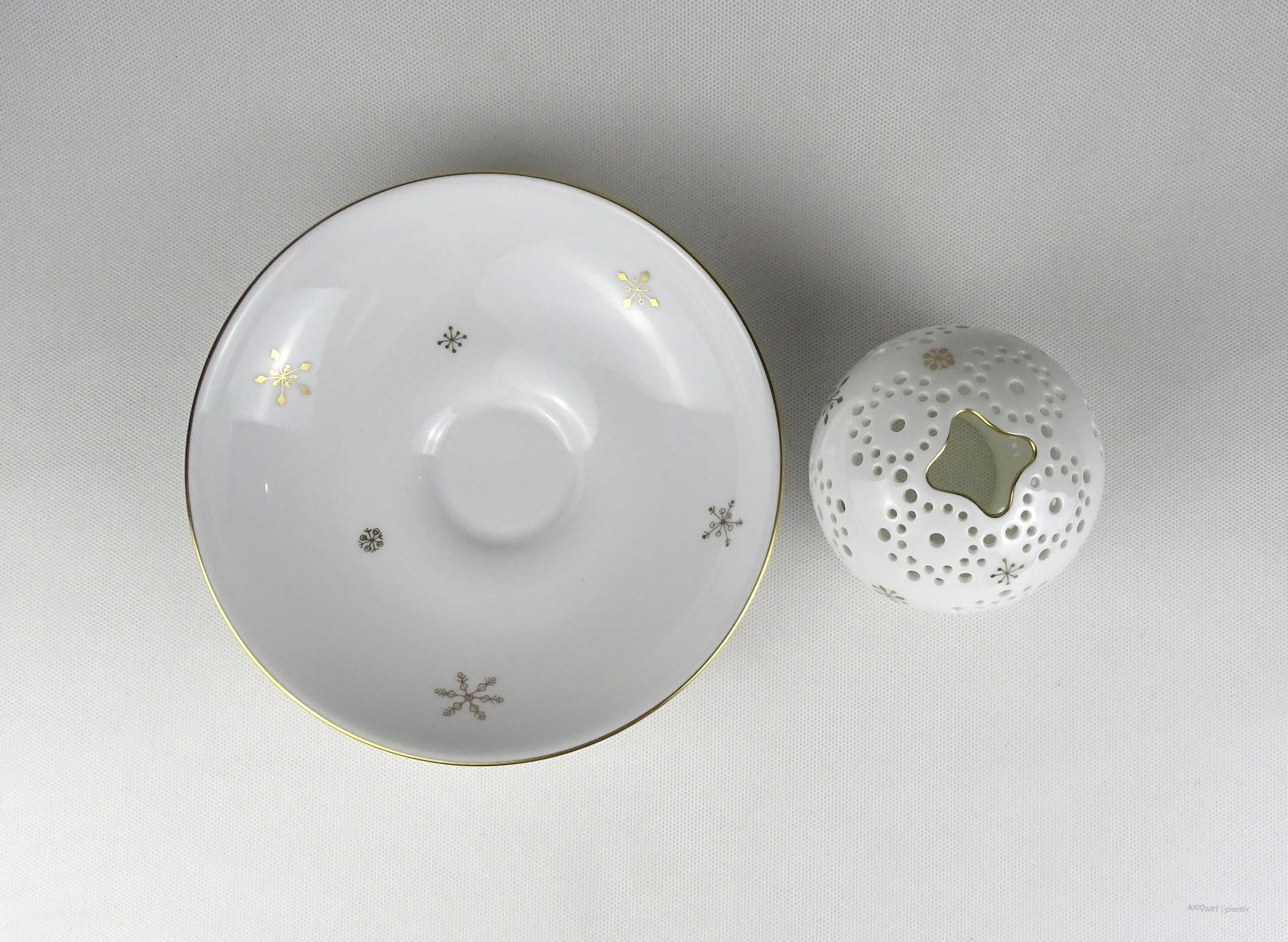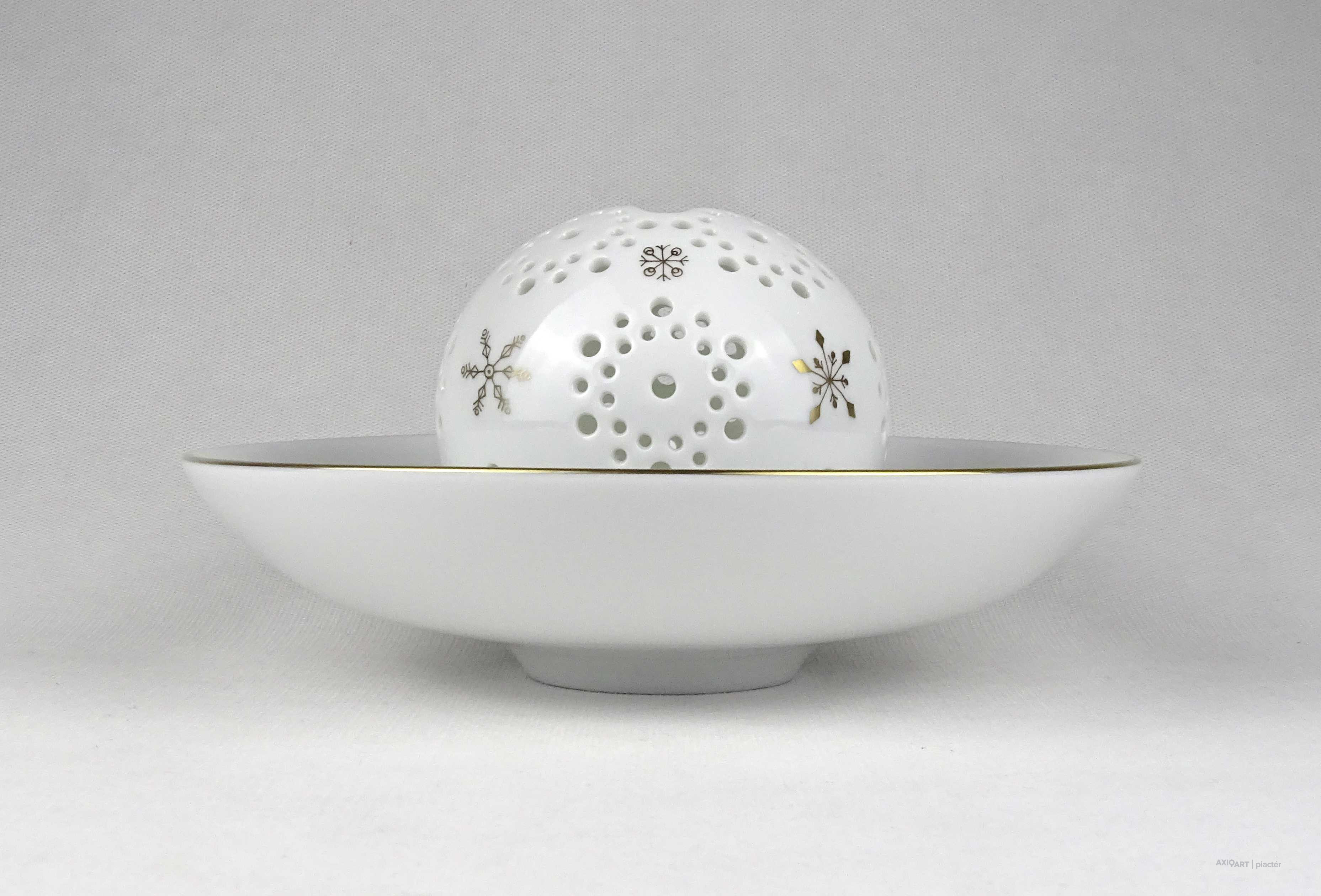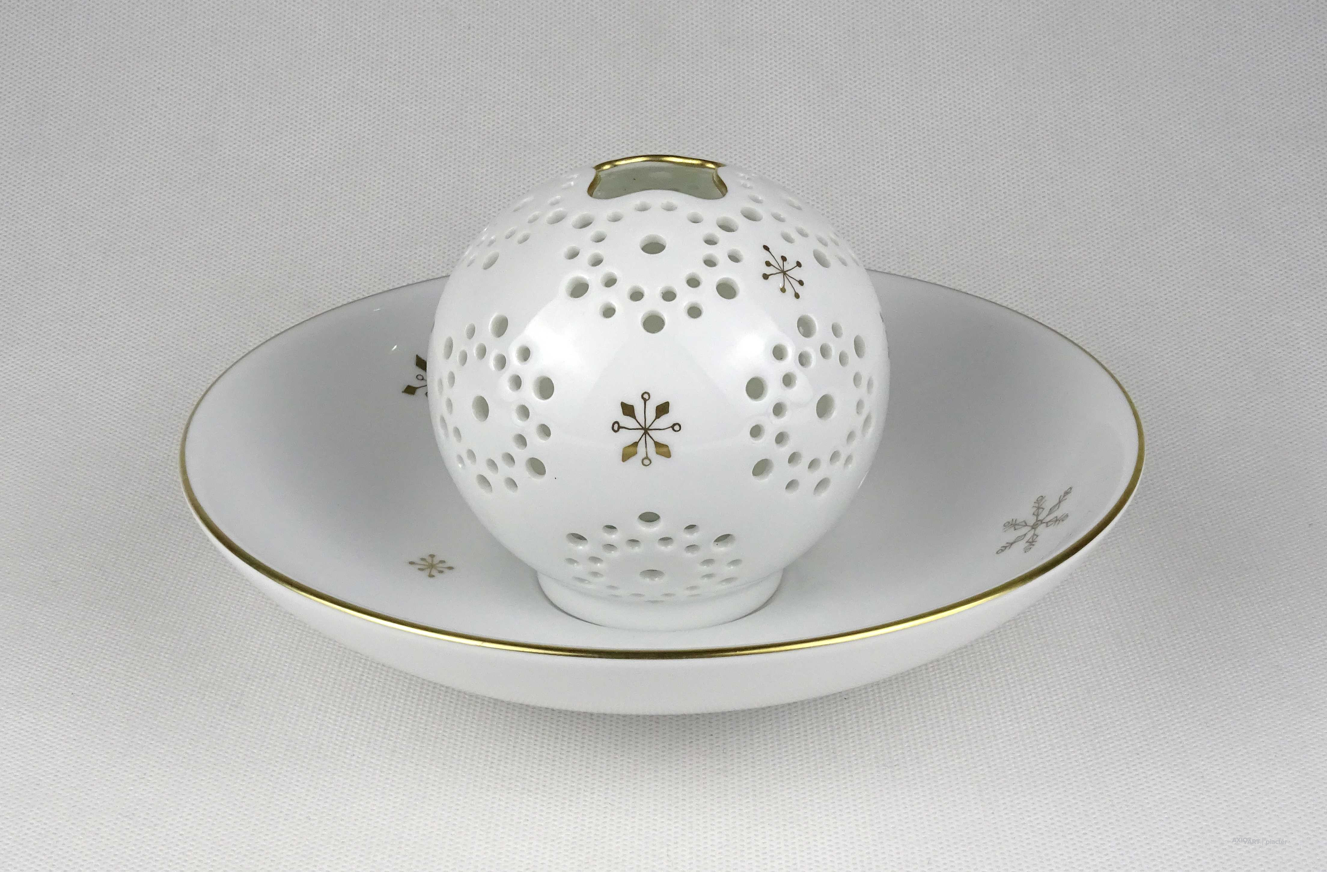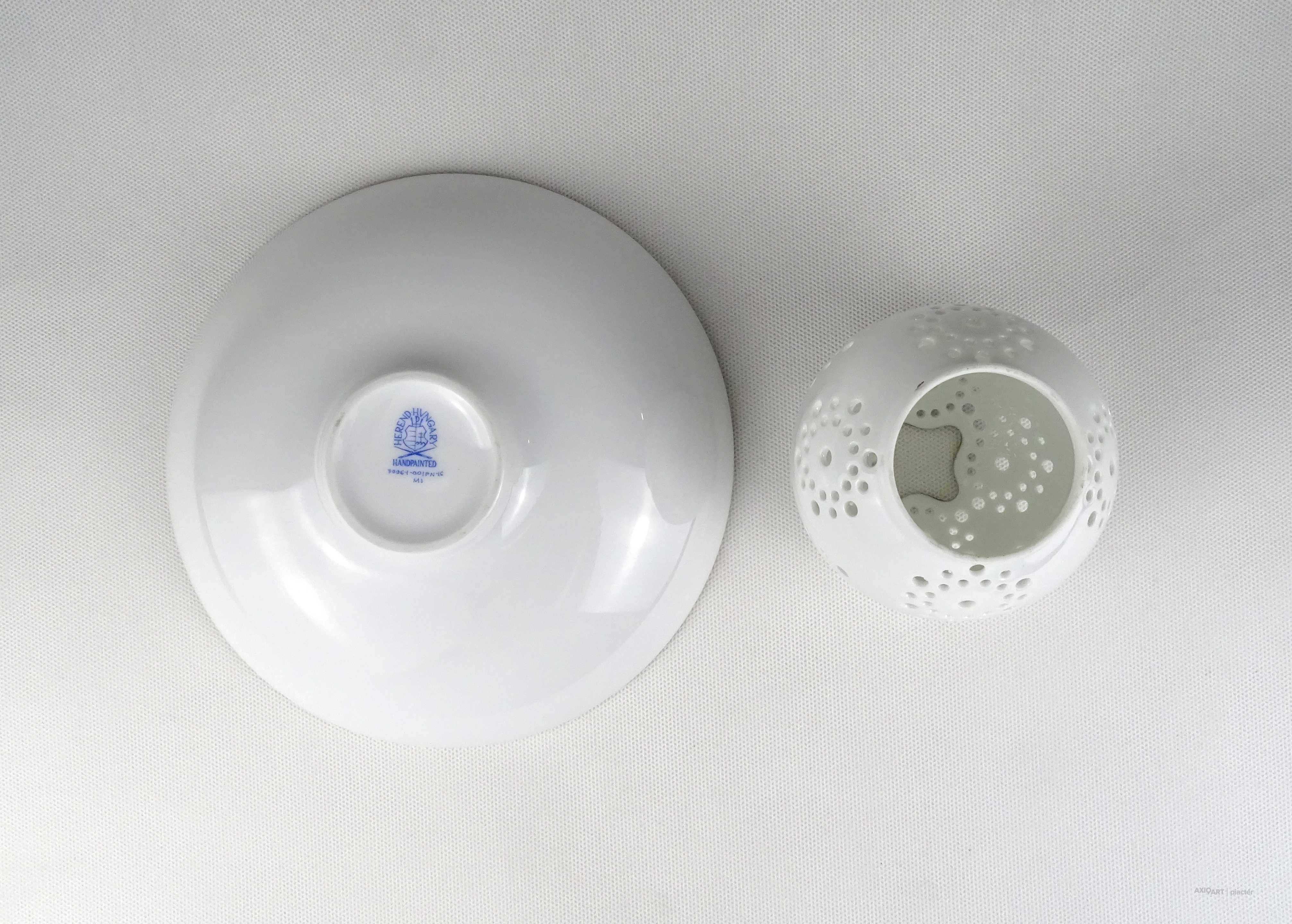 Hibátlan állapotú fehér Herendi porcelán mécsestartó, áttört mintákkal és aranyozással díszített porcelán gömb hozzá illő alátét tányérral. A gömb és a tányér is külön jelzett.