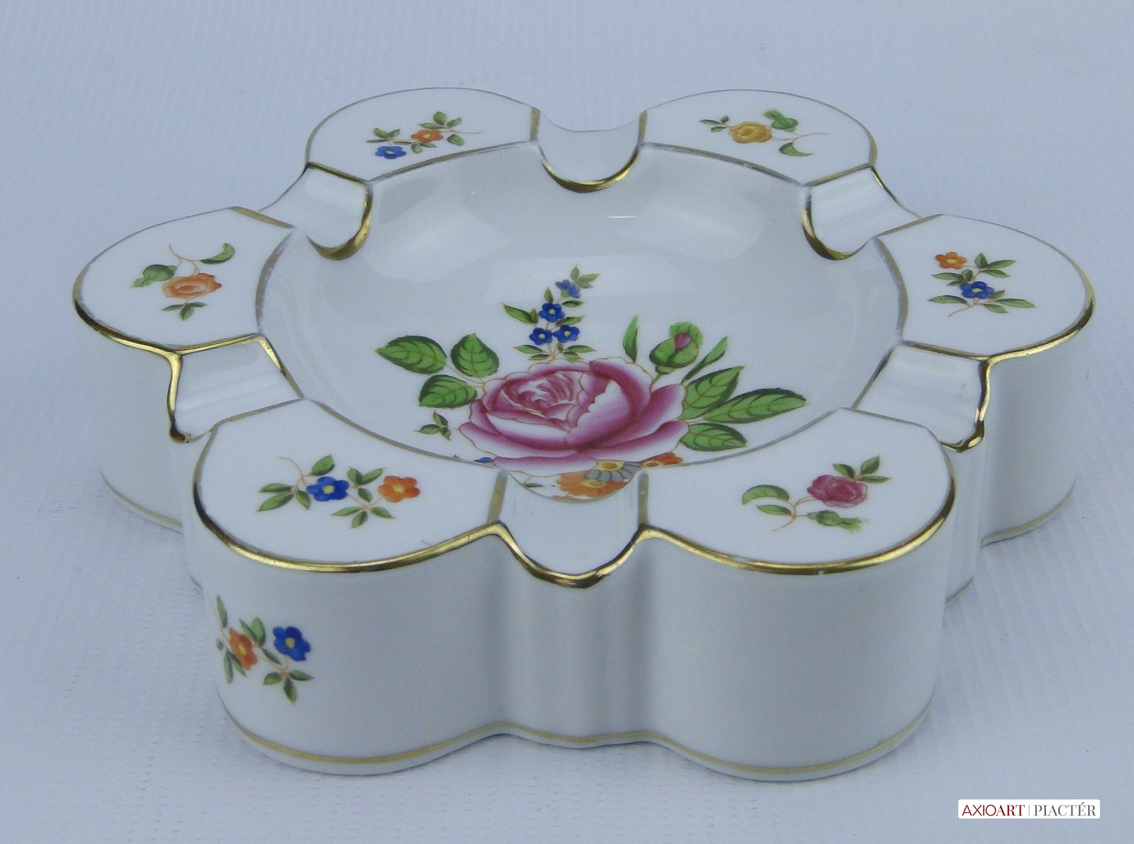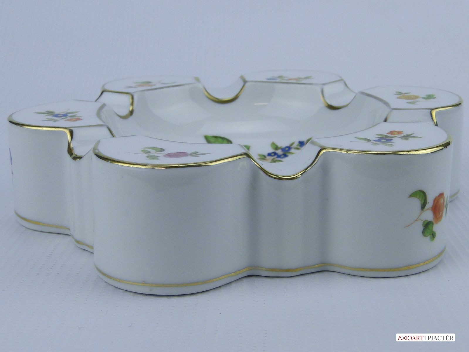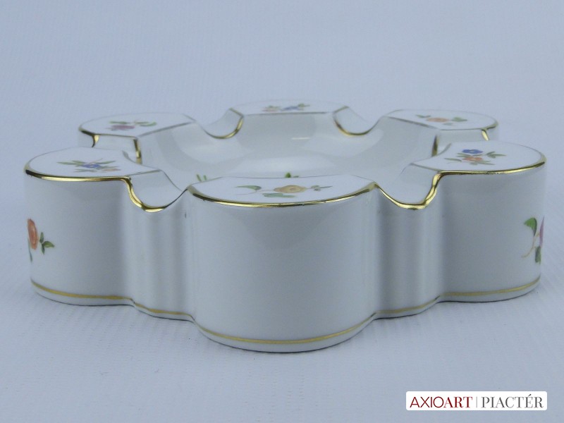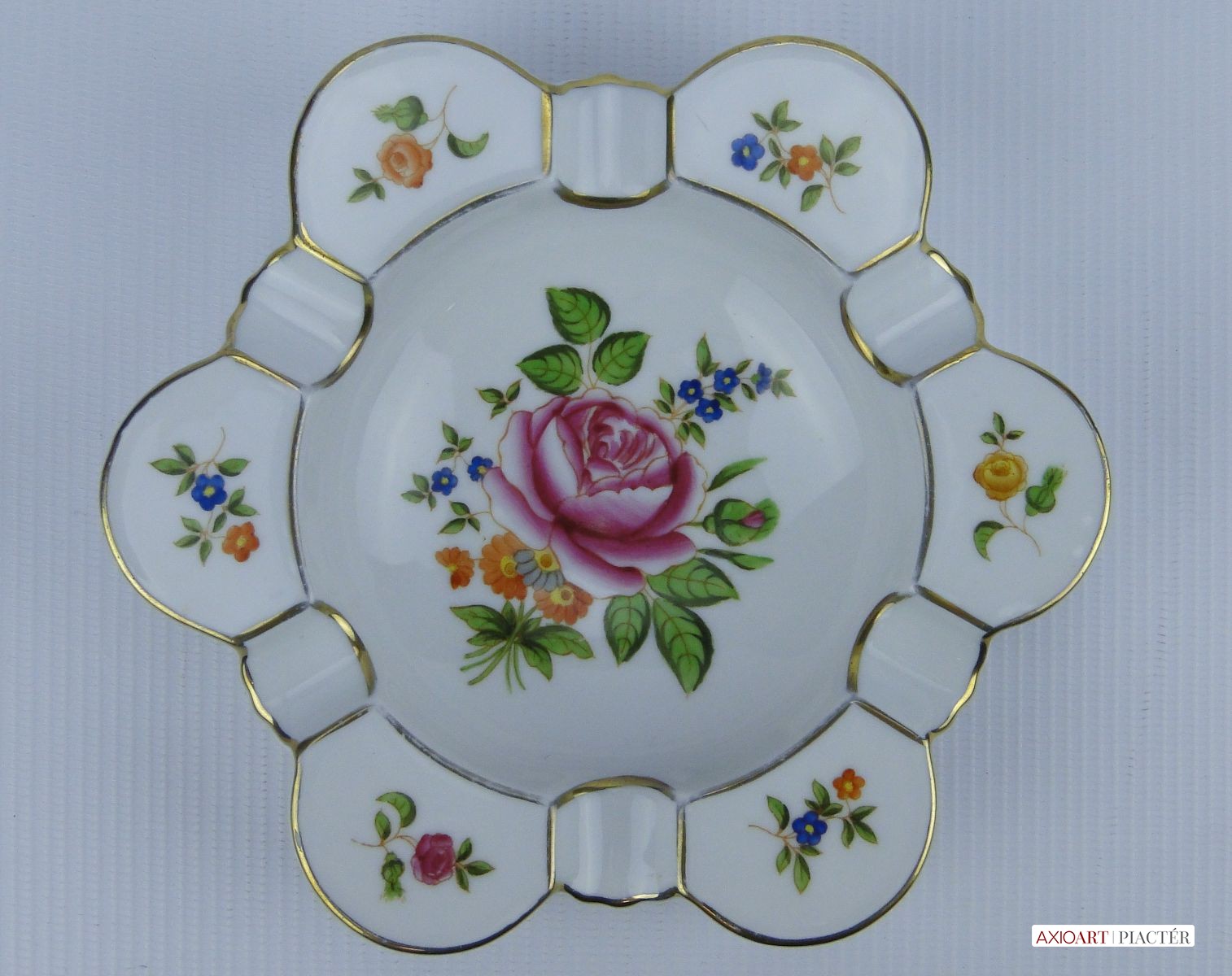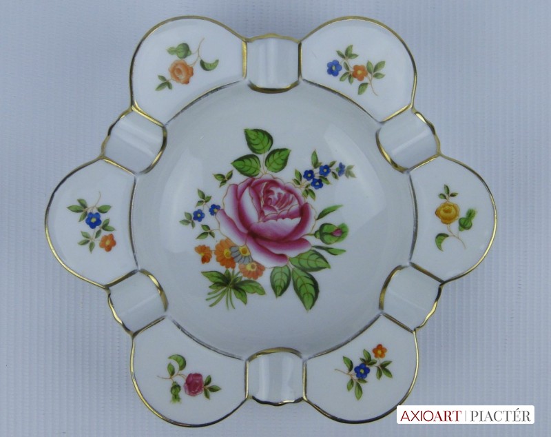 [0E050/VTR-15] Hibátlan állapotú, herendi porcelán, 6 állásos hamutál, gyönyörű kézi festésű sárga rózsa díszítéssel. Alján I. osztályú kék herendi jelzés: HEREND HUNGARY HANDPAINTED Vörössel formaszám: 7700/PBR Mélynyomással: 7700 55 HEREND Aranyozása kissé kopottas. Szélesség: 15 cm Súly: 0.34 kg   A dekor leírása: Az európai csendéletfestészet fél évszázados hagyományait éleszti fel a Petit bouquet de rose dekor. Középen élethűen megfestett, dús hatású virágcsokor kapott helyet. A szemet gyönyörködtető bokréta központi motívuma a rózsaszínű, feslő szirmú rózsa, amelynek harmatos kelyhét élénkzöld levelek és nyiladozó bimbók vesznek körbe. Mögötte sárga, narancs és kék szirmú árvácskák, nefelejcsek és margaréták kicsiny virágai bukkannak elő. A buja csokor körül és a bordűrön elszórtan apró, tarka virágok helyezkednek el, a hullámos peremet pedig ragyogó aranycsík festi fényesre. A gyönyörű herendi dekor háromféle változatban készül. A Petit Bouquet de rose dekor leírása:   Az európai csendéletfestészet fél évszázados hagyományait éleszti fel a Petit bouquet de rose dekor. Középen élethűen megfestett, dús hatású virágcsokor kapott helyet. A szemet gyönyörködtető bokréta központi motívuma a rózsaszínű, feslő szirmú rózsa, amelynek harmatos kelyhét élénkzöld levelek és nyiladozó bimbók vesznek körbe. Mögötte sárga, narancs és kék szirmú árvácskák, nefelejcsek és margaréták kicsiny virágai bukkannak elő. A buja csokor körül és a bordűrön elszórtan apró, tarka virágok helyezkednek el, a hullámos peremet pedig ragyogó aranycsík festi fényesre. A gyönyörű herendi dekor háromféle változatban készül.
