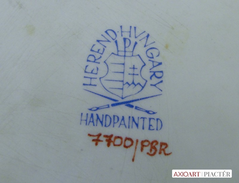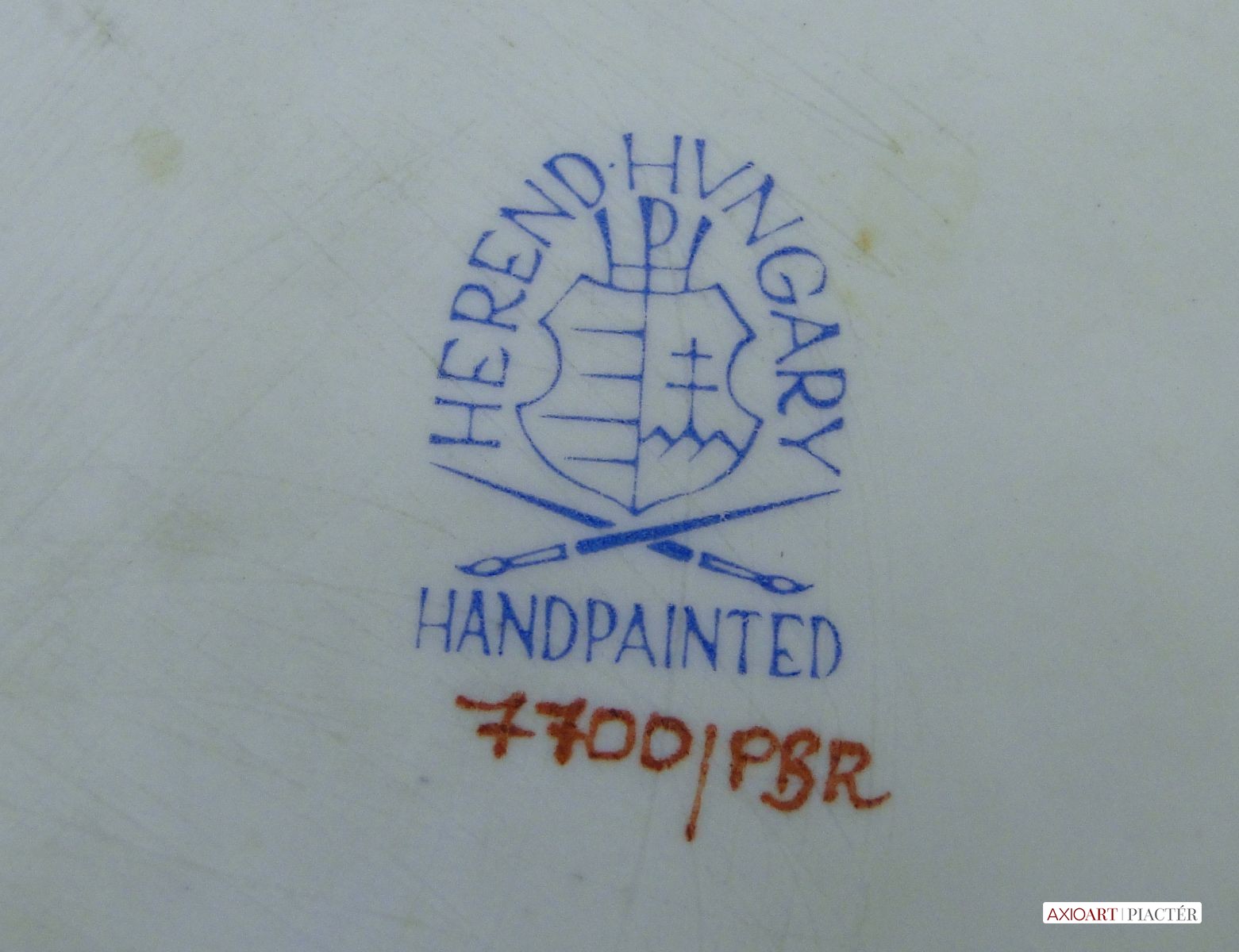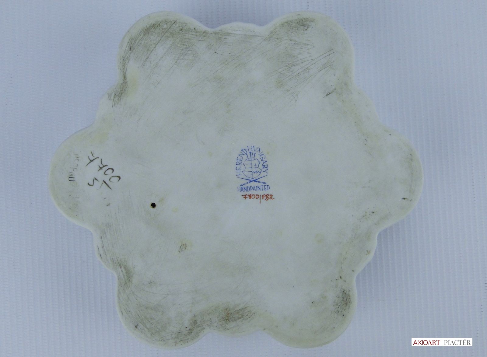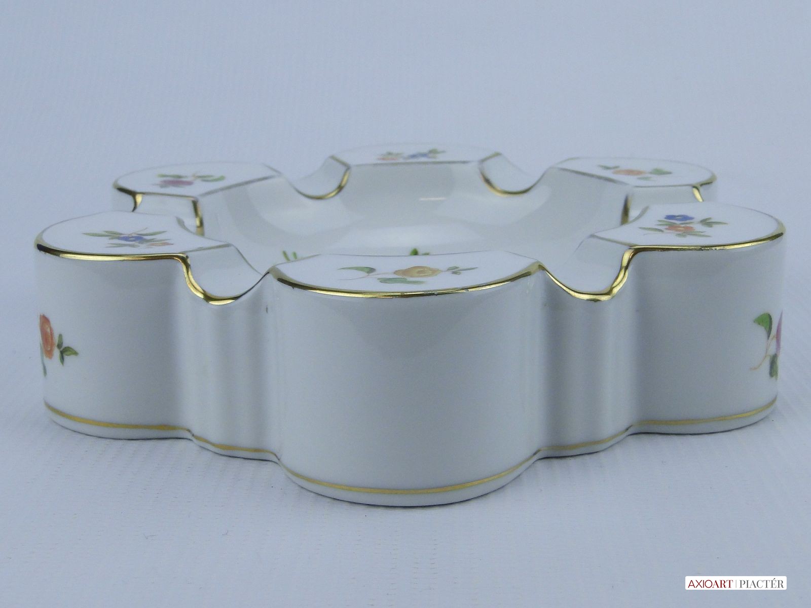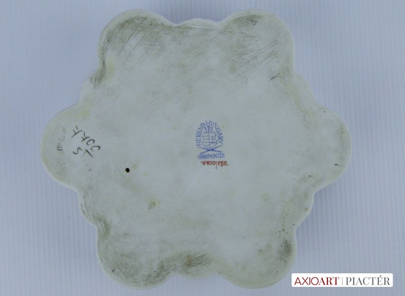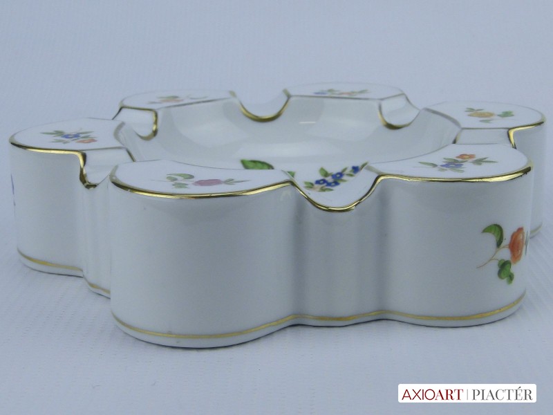 [0E050/VTR-15] Hibátlan állapotú, herendi porcelán, 6 állásos hamutál, gyönyörű kézi festésű sárga rózsa díszítéssel. Alján I. osztályú kék herendi jelzés: HEREND HUNGARY HANDPAINTED Vörössel formaszám: 7700/PBR Mélynyomással: 7700 55 HEREND Aranyozása kissé kopottas. Szélesség: 15 cm Súly: 0.34 kg   A dekor leírása: Az európai csendéletfestészet fél évszázados hagyományait éleszti fel a Petit bouquet de rose dekor. Középen élethűen megfestett, dús hatású virágcsokor kapott helyet. A szemet gyönyörködtető bokréta központi motívuma a rózsaszínű, feslő szirmú rózsa, amelynek harmatos kelyhét élénkzöld levelek és nyiladozó bimbók vesznek körbe. Mögötte sárga, narancs és kék szirmú árvácskák, nefelejcsek és margaréták kicsiny virágai bukkannak elő. A buja csokor körül és a bordűrön elszórtan apró, tarka virágok helyezkednek el, a hullámos peremet pedig ragyogó aranycsík festi fényesre. A gyönyörű herendi dekor háromféle változatban készül. A Petit Bouquet de rose dekor leírása:   Az európai csendéletfestészet fél évszázados hagyományait éleszti fel a Petit bouquet de rose dekor. Középen élethűen megfestett, dús hatású virágcsokor kapott helyet. A szemet gyönyörködtető bokréta központi motívuma a rózsaszínű, feslő szirmú rózsa, amelynek harmatos kelyhét élénkzöld levelek és nyiladozó bimbók vesznek körbe. Mögötte sárga, narancs és kék szirmú árvácskák, nefelejcsek és margaréták kicsiny virágai bukkannak elő. A buja csokor körül és a bordűrön elszórtan apró, tarka virágok helyezkednek el, a hullámos peremet pedig ragyogó aranycsík festi fényesre. A gyönyörű herendi dekor háromféle változatban készül.
