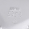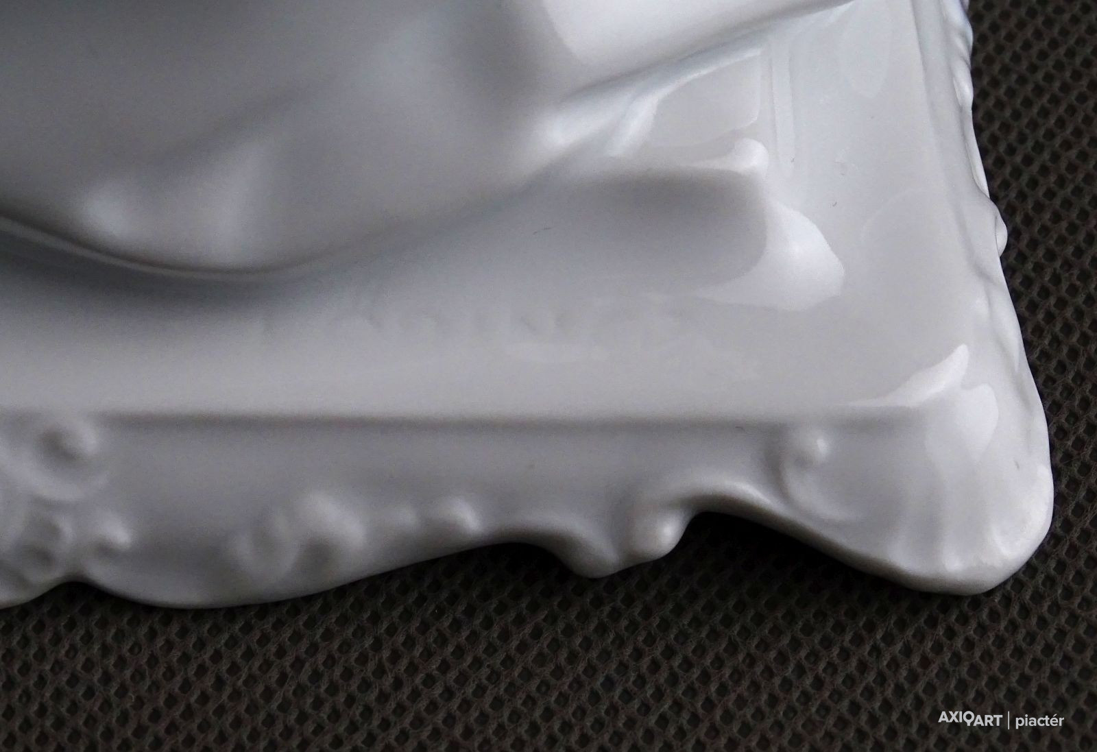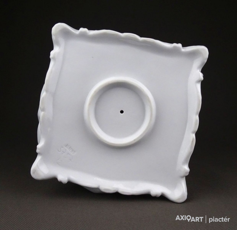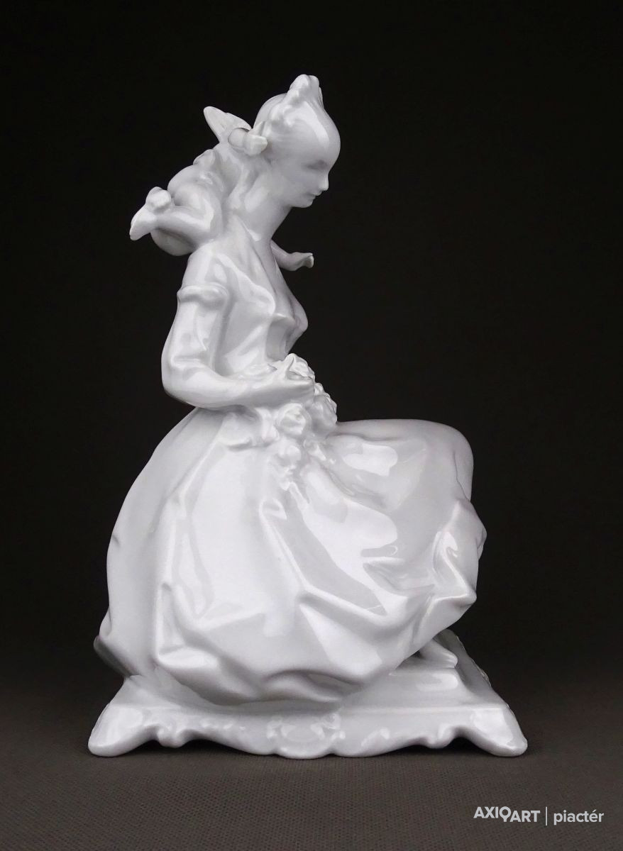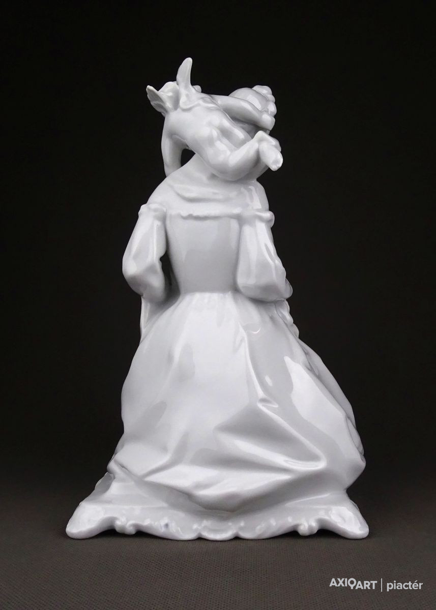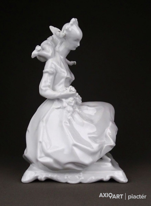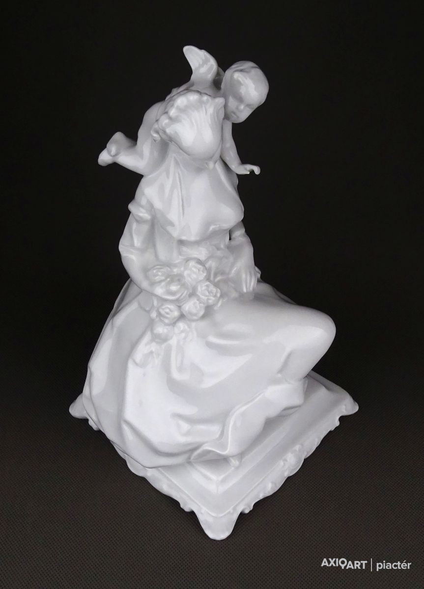 [1D574/UZ-K] Nagy méretű, hibátlan állapotú, hófehér Herendi porcelán figura. Fiatal nő puttóval, barokkos talapzaton. Alján mélynyomású jelzés: HEREND Formaszám: 5757 A szobor talapzatán formatervezőjének neve: LŐRINCZ (Lőrincz István) Magasság: 23.5 cm Szélesség: 15 cm Súly: 0.97 kg Lőrincz István szobrász Születési hely: Lickóvadamos Születési dátum: 1901 Honlap: Kiállítások az adatbázisban: Mesterei: Mátrai Lajos, Zala György. 1918: Proletár Képzőművészeti Tanműhely; 1919-22: Magyar Iparművészeti Főiskola, mesterei: Mátrai Lajos, Zala György. 1937: Szinyei Merse Társaság kitüntető elismerése, 1938: Magyar Iparművészek Országos Egyesülete szakmai ezüstérem; 1940: Fővárosi Iparművészeti Aranyérem. 1942: Budapest Székesfőváros iparművészeti aranyérme. 1938-tól a Herendi Porcelángyár műteremvezetője volt, 1949-56: a Magyar Iparművészeti Főiskola porcelántervező tanszékének volt a vezetője. 1957-től szabadfoglalkozású művészként alkotott. Műtermében fémoxidokkal és fehér fedőmázzal égetett porcelán dísztárgyakat hozott létre, anyag és mázkísérleteket folytatott. Fémmel kombinált félporcelán tárgyai a 60-as években technikai ritkaságnak számítottak. Egyéni kiállítások 1966 • Fényes Adolf Terem, Budapest Válogatott csoportos kiállítások Képzőművészeti és Iparművészeti kiállítások, Nemzeti Szalon, Budapest • Műcsarnok, Budapest 1939 • Herend 100 éves, jubileumi kiállítás, Herend 1941, 1943 • Művészet az iparban, karácsonyi kiállítás, OMIT 1942 • I. Országos Keramikai kiállítás, OMIT 1943 • Magyar országos iparművészeti kiállítás, Kassa 1952 • Tavaszi Tárlat, Műcsarnok, Budapest • I. Iparművészeti Kiállítás, Ernst Múzeum, Budapest 1953 • Népművészeti és Iparművészeti kiállítás, Műcsarnok, Budapest 1956 • Iparművészeti kiállítás, Iparművészeti Múzeum, Budapest 1965 • V. Országos Iparművészeti kiállítás, Műcsarnok, Budapest Mai magyar kerámia, Vár, Siklós 1968 • I. Országos Kerámia Biennálé, Pécs 1995 • XX. századi magyar keramikusok. Válogatás az Iparművészeti Múzeum gyűjteményéből, Iparművészeti Múzeum, Budapest. Művek közgyűjteményekben Köztéri művei  (dombormű, 1945, Komló, szálloda).