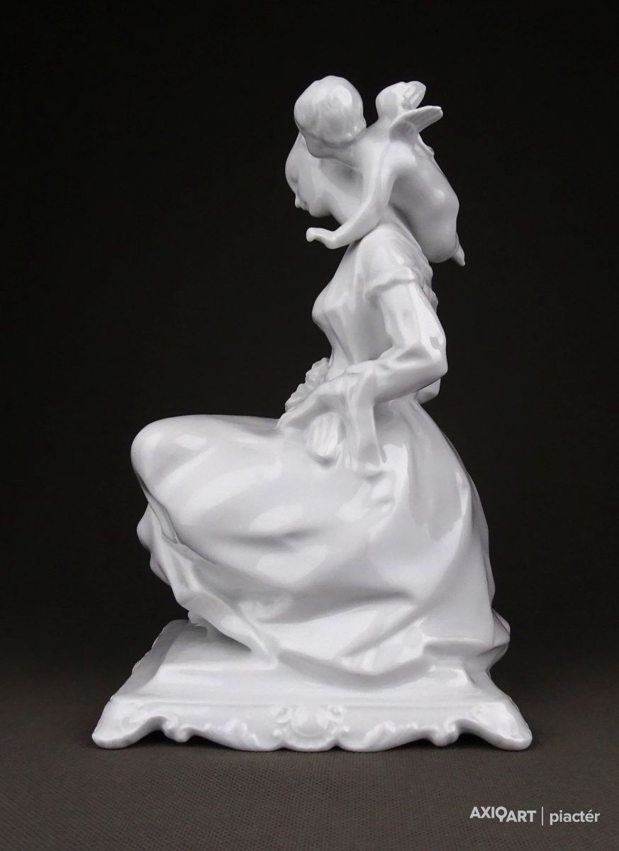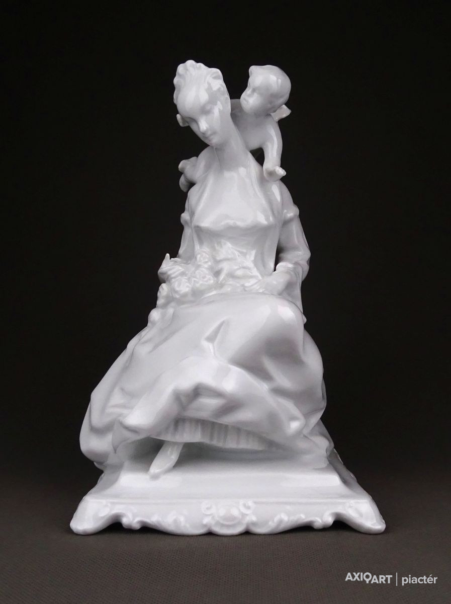 Nagy méretű, hibátlan állapotú, hófehér Herendi porcelán figura. Fiatal nő puttóval, barokkos talapzaton.