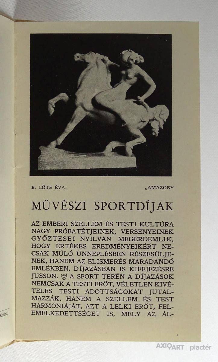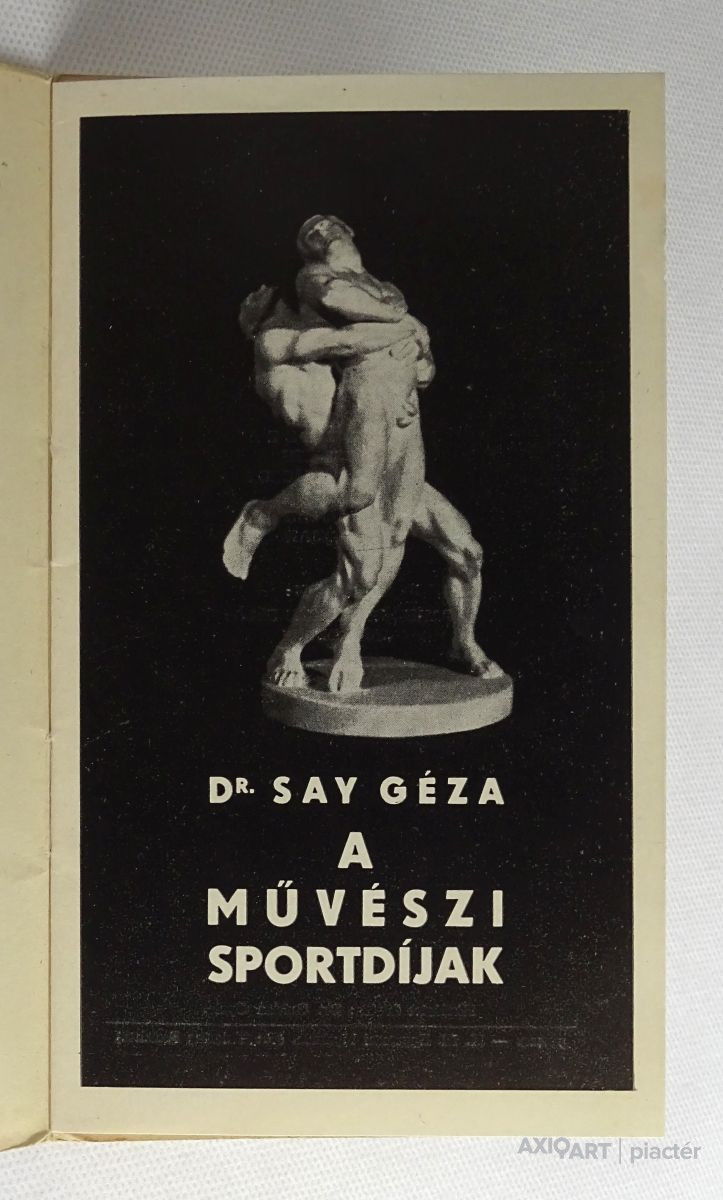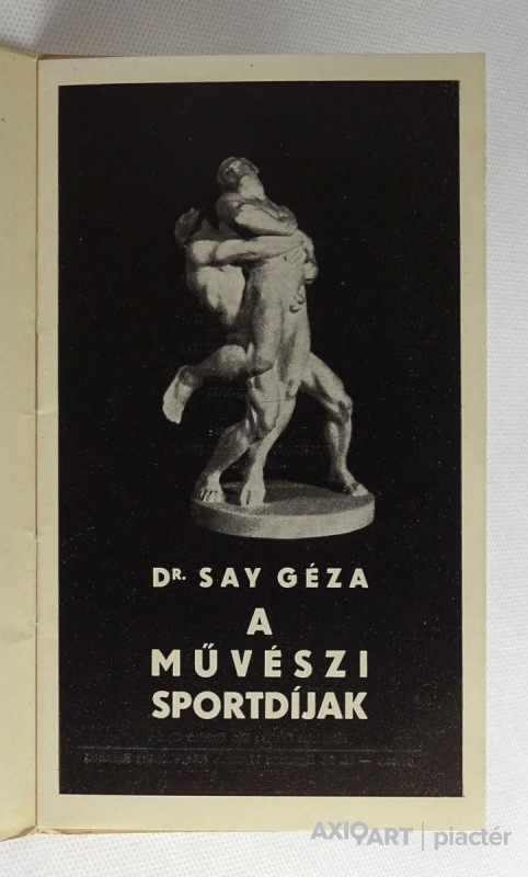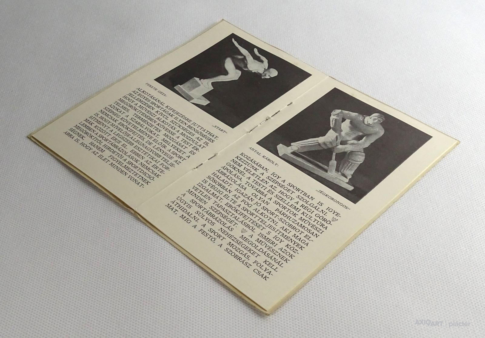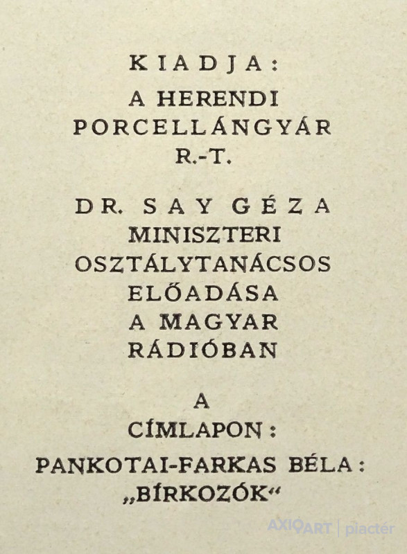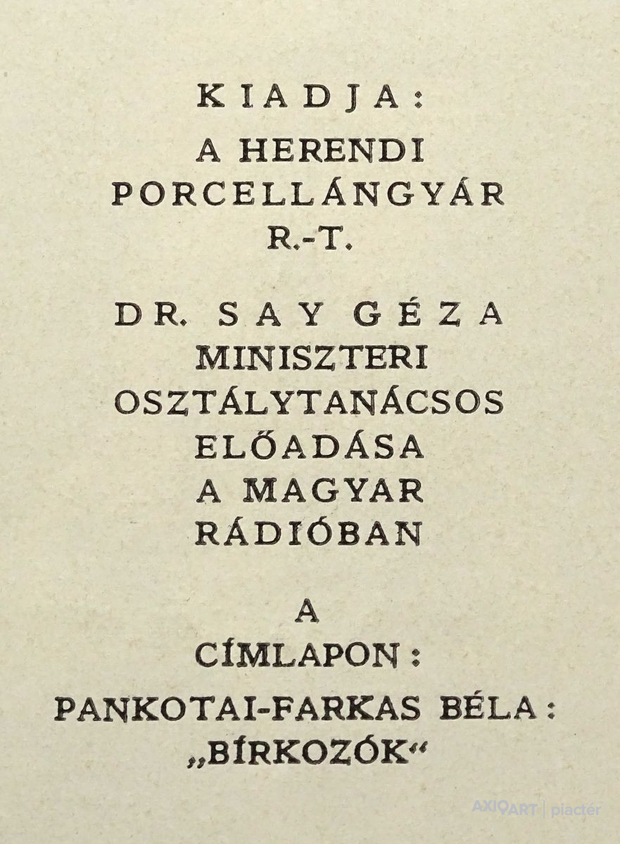 [1S374/X319] Dr. Say Géza : A művészi sportdíjak KIADJA A HERENDI PORCELLÁNGYÁR R.T. DR. SAY GÉZA MINISZTERI OSZTÁLYTANÁCSOS ELŐADÁSA A MAGYAR RÁDIÓBAN A CÍMLAPON: PANKOTAI-FARKAS BÉLA: "BÍRKÓZÓK" KIADÁSÉRT FELELŐS: DR. GULDEN GYULA HEREND HUNGARIA 1941 Benne: - B. LŐTE ÉVA: "AMAZON" - GÁDY LAJOS : "LOVASPÓLÓ" - B. LŐTE ÉVA: "VIKTÓRIA VÍZICSIKÓN" - FEKETE GÉZA : "DISZKOSZVETŐ" - GÁDY LAJOS : "KORCSOLYÁZÓK" - FEKETE GÉZA : "START" - ANTAL KÁROLY : "JÉGKORONGOS" - PANKOTAI-FARKAS BÉLA : "SÚLYDOBÓ" - PANKOTAI-FARKAS BÉLA : "ÖKÖLVÍVÓ" - GONDOS JÓZSEF : "OLYMPIAI TŰZ" - GONDOS JÓZSEF : "HÓDOLAT A GYŐZTESNEK" - KISFALUDI-STRÓBL ZS. : "HADIK-HUSZÁR" - VASTAGH GYÖRGY : "AGÁR" - Magasság: 16.5 cm Szélesség: 9.5 cm Súly: 0.02 kg