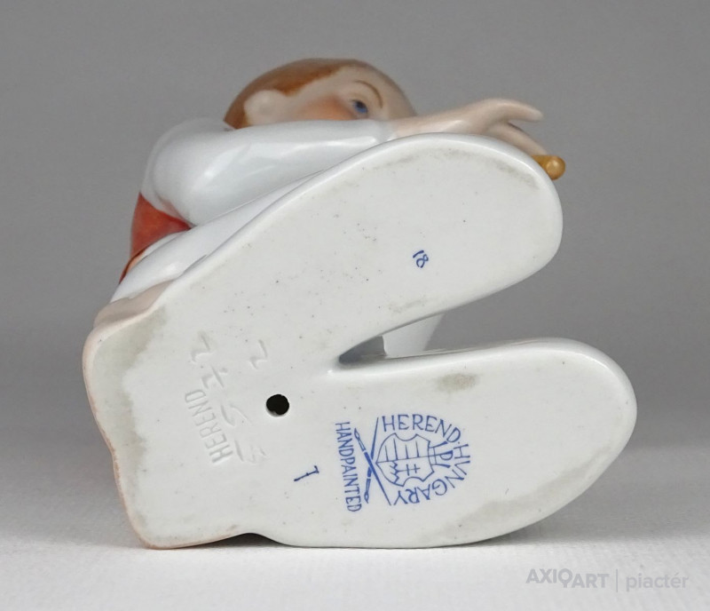 [1N664/BX-8] Hibátlan állapotú térdelő fiú, furulyázó legény Herendi porcelán figura. Alján kék Herendi jelzés: HEREND HUNGARY HANDPAINTED Mélynyomású jelzés: HEREND Formaszám: 5572 Magasság: 16.5 cm Súly: 0.25 kg