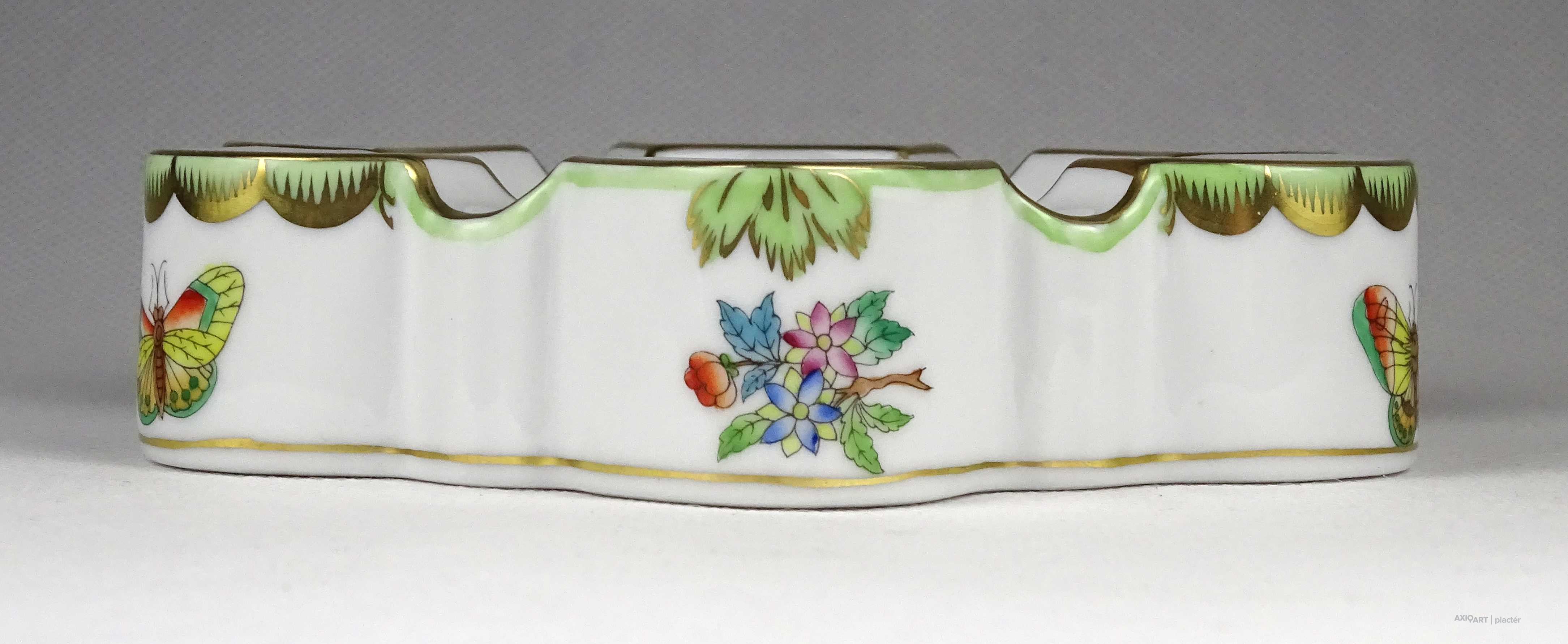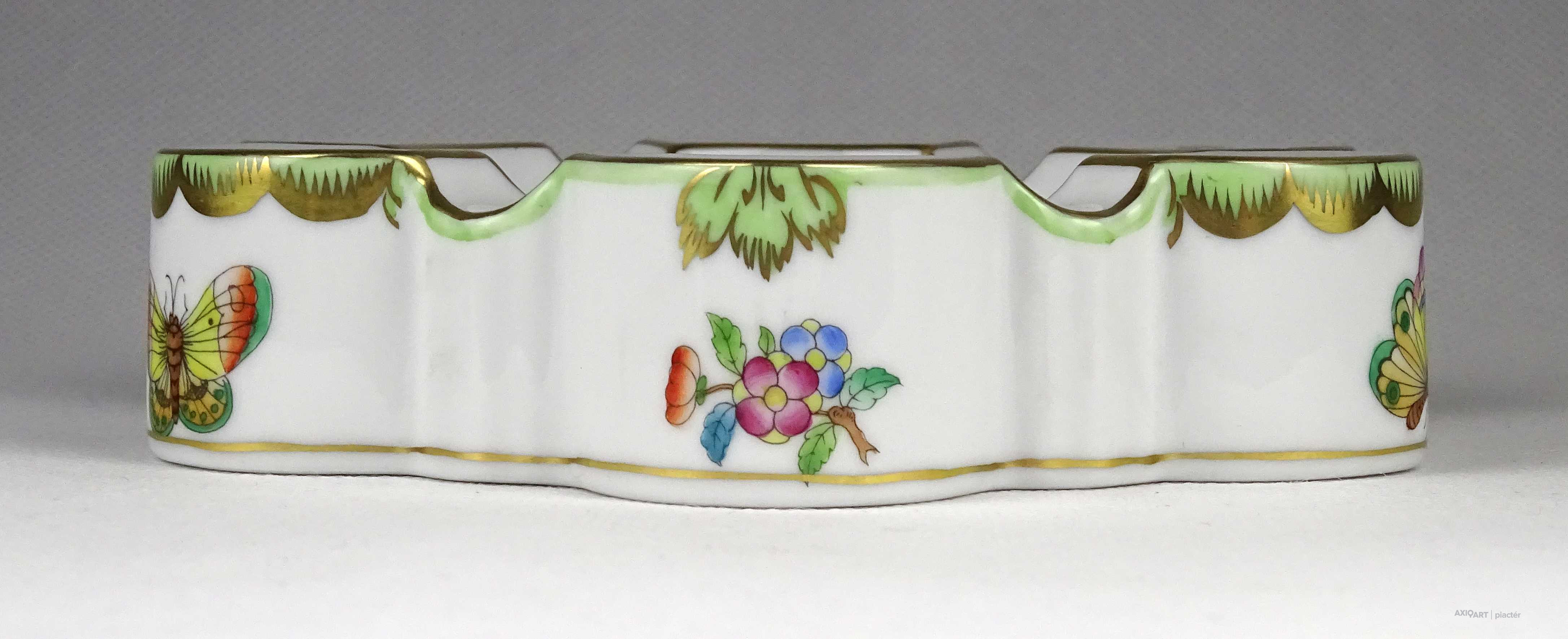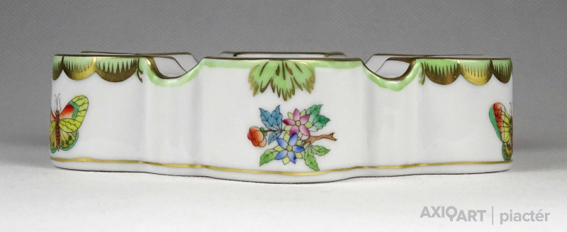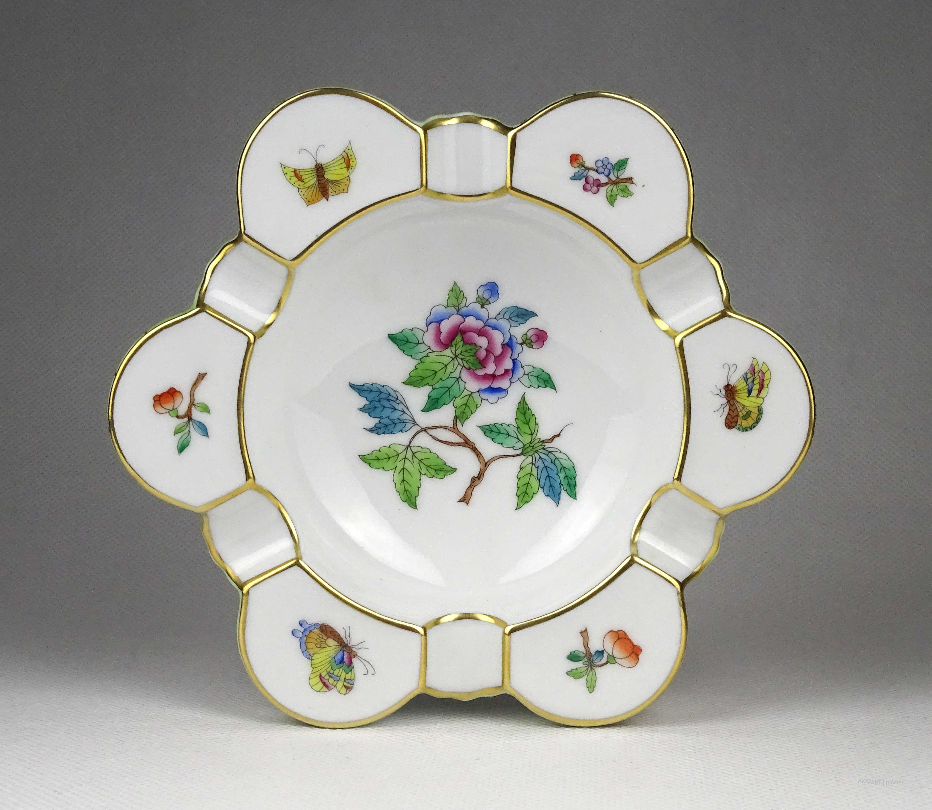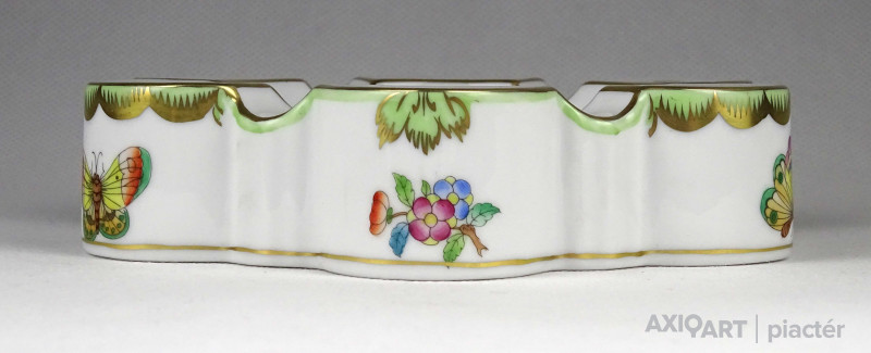 [1Y235/Z008] Hibátlan állapotú, Herendi porcelán, 6 állásos hamutál, gyönyörű kézi festésű Viktória mintás, lepkés díszítéssel. Alján I. osztályú kék Herendi jelzés: HEREND HUNGARY HANDPAINTED Formaszám kékkel: 7700-0-00/VBA Mélynyomással: HEREND Magasság: 3.5 cm Szélesség: 15.5 cm Súly: 0.35 kg