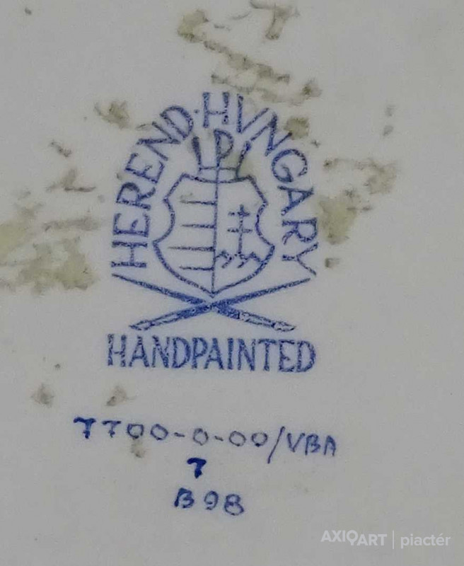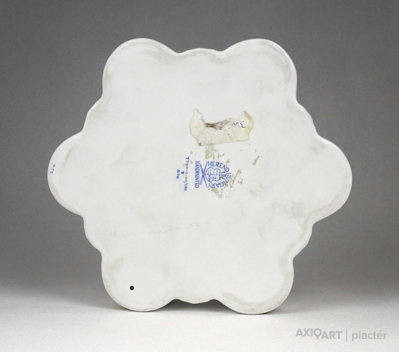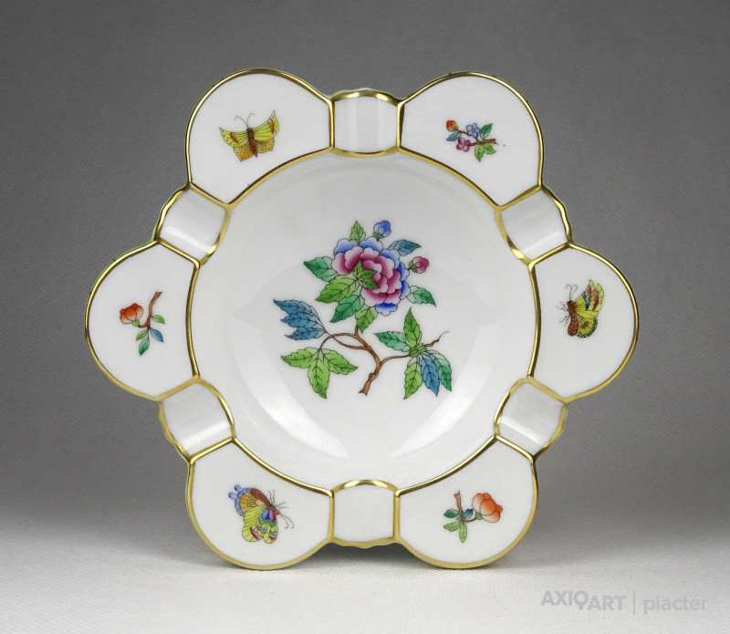 [1O695/BX-8] Hibátlan állapotú, Herendi porcelán, 6 állásos hamutál, gyönyörű kézi festésű Viktória mintás, lepkés díszítéssel. Aranyozása kopottas. Alján I. osztályú kék Herendi jelzés: HEREND HUNGARY Formaszám: 7700 Mélynyomással: HEREND Magasság: 3.3 cm Szélesség: 15.3 cm Súly: 0.335 kg   A dekor leírása: Az európai csendéletfestészet fél évszázados hagyományait éleszti fel a Petit bouquet de rose dekor. Középen élethűen megfestett, dús hatású virágcsokor kapott helyet. A szemet gyönyörködtető bokréta központi motívuma a rózsaszínű, feslő szirmú rózsa, amelynek harmatos kelyhét élénkzöld levelek és nyiladozó bimbók vesznek körbe. Mögötte sárga, narancs és kék szirmú árvácskák, nefelejcsek és margaréták kicsiny virágai bukkannak elő. A buja csokor körül és a bordűrön elszórtan apró, tarka virágok helyezkednek el, a hullámos peremet pedig ragyogó aranycsík festi fényesre. A gyönyörű herendi dekor háromféle változatban készül. A Petit Bouquet de rose dekor leírása:   Az európai csendéletfestészet fél évszázados hagyományait éleszti fel a Petit bouquet de rose dekor. Középen élethűen megfestett, dús hatású virágcsokor kapott helyet. A szemet gyönyörködtető bokréta központi motívuma a rózsaszínű, feslő szirmú rózsa, amelynek harmatos kelyhét élénkzöld levelek és nyiladozó bimbók vesznek körbe. Mögötte sárga, narancs és kék szirmú árvácskák, nefelejcsek és margaréták kicsiny virágai bukkannak elő. A buja csokor körül és a bordűrön elszórtan apró, tarka virágok helyezkednek el, a hullámos peremet pedig ragyogó aranycsík festi fényesre. A gyönyörű herendi dekor háromféle változatban készül.