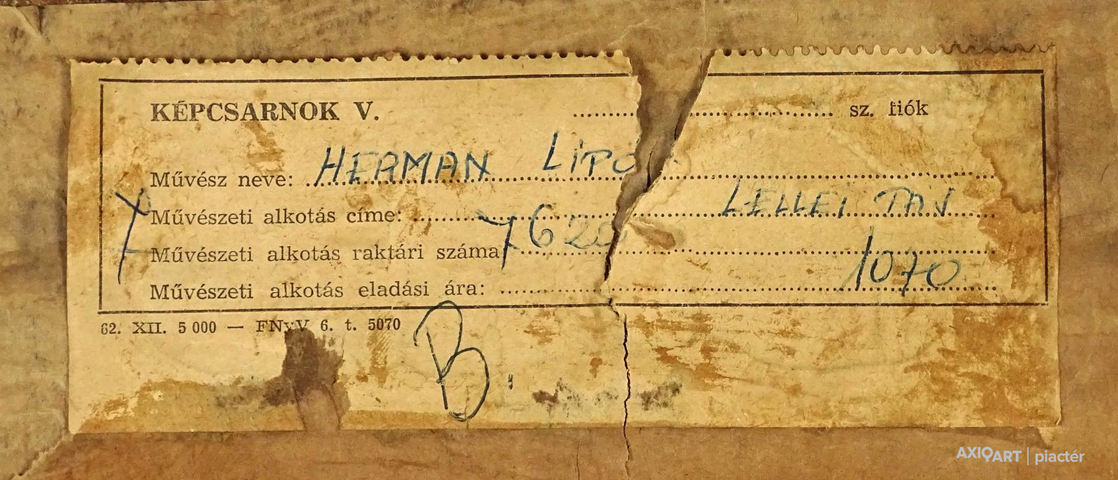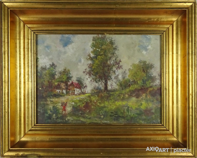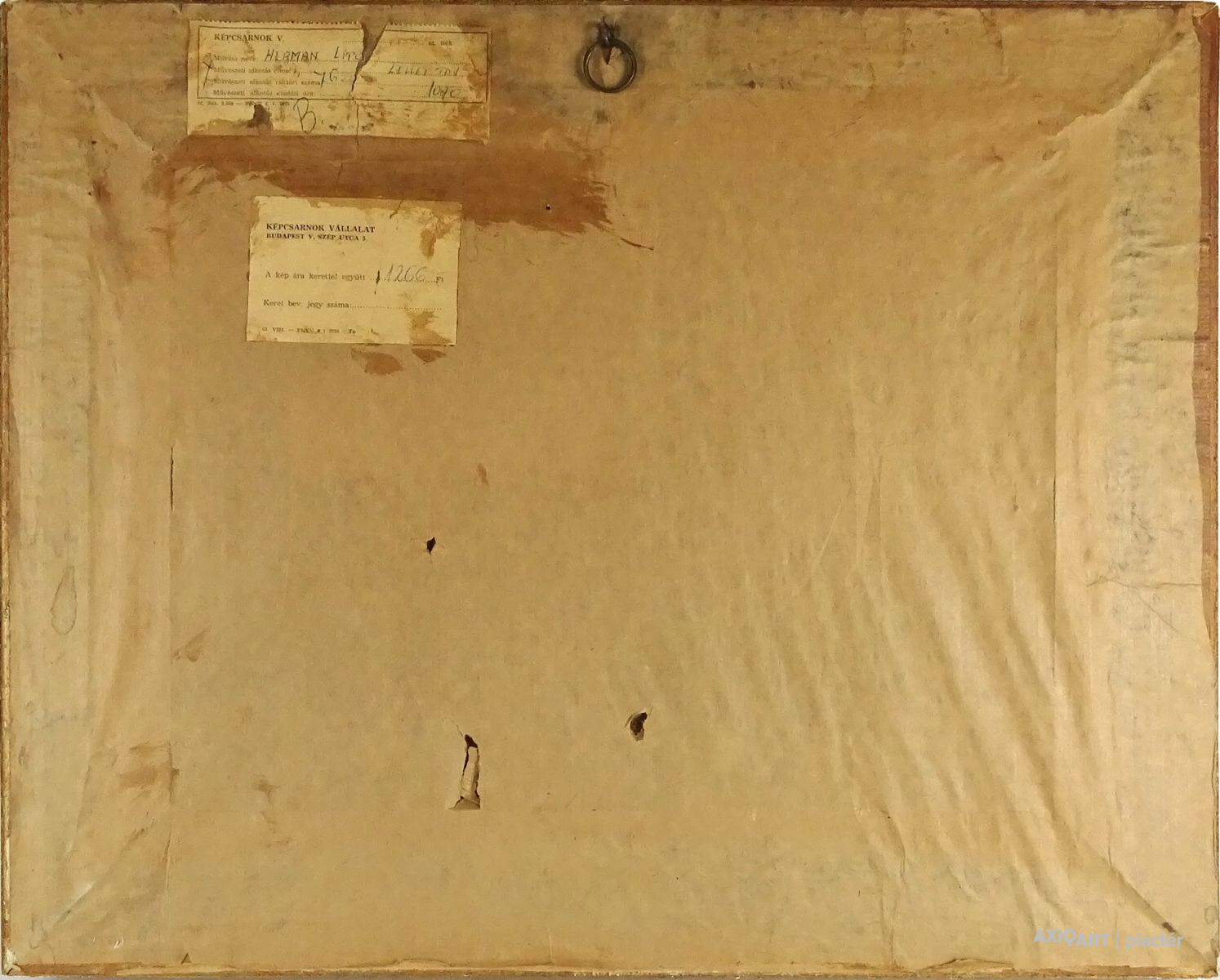 [1O312/122] Olaj farost festmény üveglap mögött, aranyozott keretben. Akasztási lehetőséggel rendelkezik. Jelezve jobbra lent: HERMAN LIPÓT Hátoldalán Képcsarnokos címkék: KÉPCSARNOK VÁLLALAT HERMAN LIPÓT LELLEI TÁJ Magasság: 44.5 cm Szélesség: 56 cm Súly: 3.525 kg Herman Lipót grafikus, festő Nagyszentmiklós, 1884-04-24 Névváltozat: Horog 1901-ben iratkozott be a Mintarajziskolába, ahol Balló Ede, Hegedűs László és Zemplényi Tivadar volt a tanára. 1905-ben Asbénél tanult Münchenben. 1908-tól ismét a Mintarajziskolában folytatta tanulmányait. 1918: Erzsébetvárosi Kaszinó díja, Műcsarnok, Budapest; 1929: Világkiállítás aranyérme, Barcelona; 1952: Munkácsy-díj; 1954: Szocialista Munkáért Érdemérem; 1969: Munka Érdemrend arany fokozata. A Magyar Arcképfestők Társasága, a Munkácsy Céh és a Szinyei Társaság tagja volt. Ez utóbbi ügyvezető igazgatói tisztét is betöltötte. 1919-ben a Képző- és Iparművészeti Szakszervezetek Szövetsége elnökévé választották. 1951-től a Művészeti Dolgozók Szakszervezete Képző- és Iparművészeti tagozatának elnöke volt. 1909-1910 között Berlinben dolgozott. Falus Elekkel plakátokat tervezett és könyvillusztrációkat készített. 1910-ben hazatért, s részt vett a kecskeméti művésztelep alapításában. 1911-ben Párizsba ment. 1912-ben Budapesten telepedett le. 1914-ben Olaszországban volt tanulmányúton, majd a kecskeméti művésztelepen dolgozott, ahonnan bevonult katonának. A Császári és Királyi Főhadiszállás festője lett, később ezred-festőként Prágába helyezték. 1920-ban a Szinyei Társaság egyik alapítója volt. 1921-ben Németországban volt tanulmányúton, főként Münchenben és Nürnbergben dolgozott. Ebben az évben jelent meg Budapesten rajzalbuma Lehel Ferenc bevezetőjével. 1923-tól rendszeresen festett a Balatonnál. 1925-ben Hollandiában, 1931-ben Olaszországban járt tanulmányúton. 1930-ban Párizsban és Münchenben tartózkodott. 1929-ben a szentendrei szabadiskolában tanított. A II. világháború után Zsennyén, Sárospatakon, Nagymaroson, Szolnokon alkotott. 1980-ban hagyatéka a gyöngyösi Mátra Múzeumba került. Alkotásai 1903-tól szerepeltek jelentős országos kiállításokon, a magyar művészetet bemutató reprezentatív külföldi tárlatokon. Portrékat, tájképeket, csendéleteket, mitológiai és allegorikus jeleneteket, tájképi környezetben ábrázolt aktokat festett. Kompozíciói barokkosak, színei sötétek. Kecskeméti tartózkodása után kezdett tájképeket festeni. A 20-as évek elejétől megváltozott stílusa. Festésmódja oldottabb, könnyedebb lett, a színek kivilágosodtak. Portréi, derűs hangulatú balatoni, szentendrei tájai, életörömtől duzzadó aktjai dekoratívabbak korábbi műveinél. A 30-as években romantikus tájképeket, idilli jeleneteket festett. 1945 után korábbi témái mellett számos arcképet alkotott művésztársairól, közéleti személyiségekről. Pályája kezdetétől sok karikatúrát rajzolt, melyek a XX. sz. első évtizedében a Borsszem Jankóban és a Kakas Mártonban, majd a 10-es években a Vasárnapi Ujságban, a 30-as években a Pesti Naplóban jelentek meg. Művészeti írásait a 20-as évek végétől a Pesti Napló, a Magyar Művészet és a Színházi Élet közölte. 1928-1946 között a Szinyei Társaság kiállításait, Ernst Lajos halála után az Ernst Múzeum tárlatait rendezte. Irodalom BÁLINT R.: ~, a KÉVE Könyve, Budapest, 1913 BÁLINT A.: ~ rajzai, Nyugat, 1921. december 1. LEHEL F.: ~ rajzai, Budapest, 1921 EISLER M. J.: ~ művészete, Magyar Művészet, 1929/4. FARKAS Z. : ~ kiállítása az Ernst Múzeumban, Nyugat, 1929. december 1. PÉRELY I.: Magyar Újságrajzoló Művészek Könyve, Budapest, 1930  művészete (kat., bev. tan., Ernst Múzeum, Budapest, 1954) LENGYEL G.: ~ról (kat., bev. tan., Csók Galéria, Budapest, 1959) LENGYEL G.: A nyolcvanéves ~nál, Művészet, 1964/6. PEREHÁZI G.: ~, Művészet, 1972/7. POGÁNY Ö. G.: ~ emlékkiállítása a Szolnoki Galériában, Jászkunság, 1974/10. DEMÉNY J.: Bartók "piktor" földije: ~, Dunatáj, 1984/1. Egyéni kiállítások Egyéni kiállítások 1913 • VI. kiállítás, Ernst Múzeum, Budapest 1949 • Fészek Klub, Budapest 1959 • Csók Galéria, Budapest (kat.) • Képcsarnok, Szeged 1975 • Herman Ottó Múzeum Képtára, Miskolc 1981, 1984 • Gyöngyösi Galéria, Gyöngyös. Válogatott csoportos kiállítások Válogatott csoportos kiállítások az Országos Magyar Képzőművészeti Társulat kiállításai, Műcsarnok, Budapest 1913 • XIII. kiállítás, Ernst Múzeum, Budapest 1920 • XLI. kiállítás, Ernst Múzeum, Budapest a Szinyei Társaság művésztagjainak kiállításai, Ernst Múzeum, Budapest és Nemzeti Szalon, Budapest Magyar művészeti kiállítás, Bécs 1925 • Magyar művészeti kiállítás, London a Munkácsy Céh kiállításai, Ernst Múzeum és Nemzeti Szalon, Budapest 1929 • CVII. kiállítás, Ernst Múzeum, Budapest • Magyar művészeti kiállítás, Nürnberg, Stockholm, Göteborg stb. 1930 • XVII. Velencei Biennálé, Velence; Szentendrei festők kiállítása, Nemzeti Szalon, Budapest 1932 • XVIII. Velencei Biennálé, Velence 1935 • A Szinyei Társaság reprezentatív kiállítása, Ernst Múzeum, Budapest 1936 • CLVII. kiállítás, Ernst Múzeum, Budapest Magyar Művészetért, Műcsarnok és régi Műcsarnok, Budapest 1947 • Ötven művész kiállítása, Nemzeti Szalon, Budapest 1948 • Kilencven művész kiállítása, Nemzeti Szalon, Budapest 1952 • Arckép kiállítás, Ernst Múzeum, Budapest • A szolnoki művésztelep jubileumi kiállítása,Ernst Múzeum, Budapest 1955 • Képzőművészetünk tíz éve, Műcsarnok, Budapest. Forrás: artportal.hu