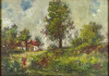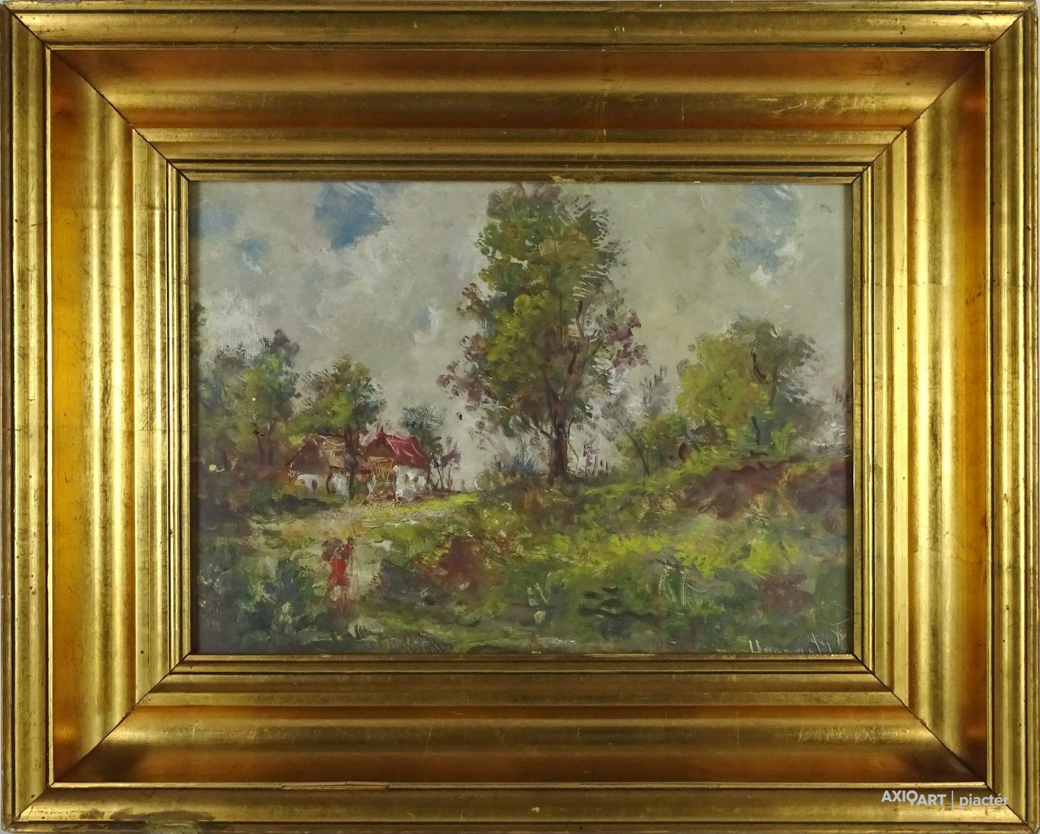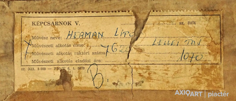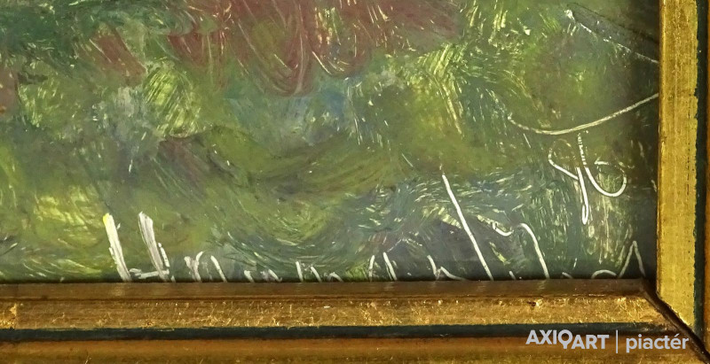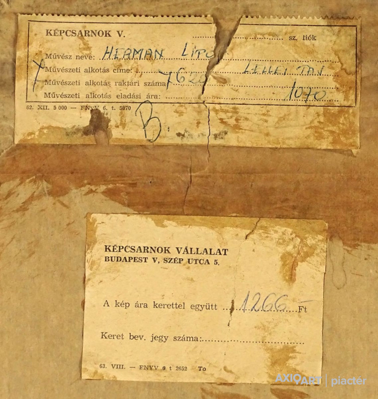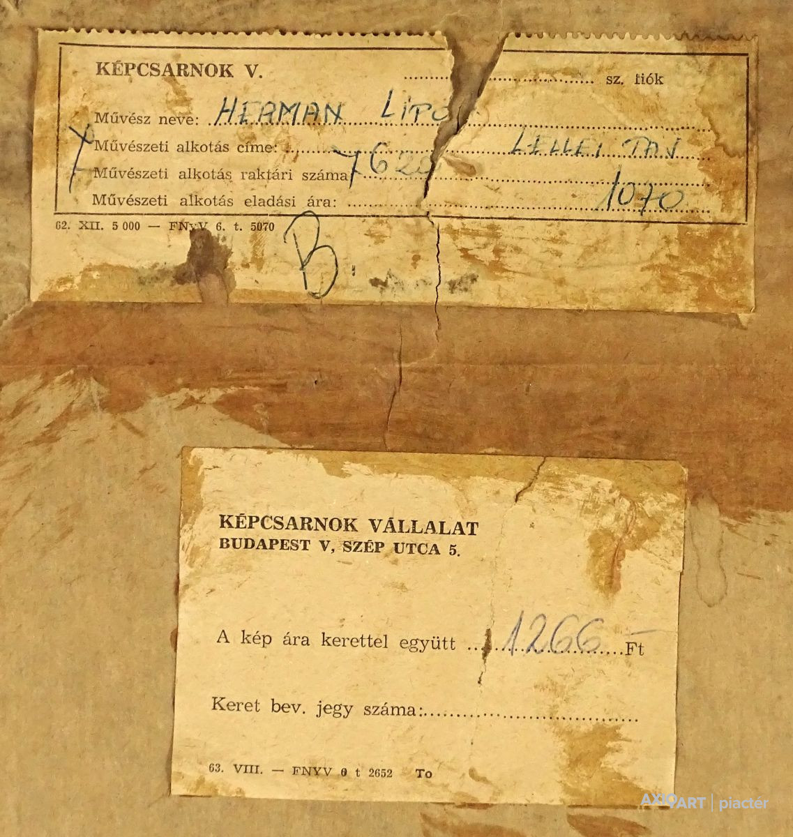 [1O312/122] Olaj farost festmény üveglap mögött, aranyozott keretben. Akasztási lehetőséggel rendelkezik. Jelezve jobbra lent: HERMAN LIPÓT Hátoldalán Képcsarnokos címkék: KÉPCSARNOK VÁLLALAT HERMAN LIPÓT LELLEI TÁJ Magasság: 44.5 cm Szélesség: 56 cm Súly: 3.525 kg Herman Lipót grafikus, festő Nagyszentmiklós, 1884-04-24 Névváltozat: Horog 1901-ben iratkozott be a Mintarajziskolába, ahol Balló Ede, Hegedűs László és Zemplényi Tivadar volt a tanára. 1905-ben Asbénél tanult Münchenben. 1908-tól ismét a Mintarajziskolában folytatta tanulmányait. 1918: Erzsébetvárosi Kaszinó díja, Műcsarnok, Budapest; 1929: Világkiállítás aranyérme, Barcelona; 1952: Munkácsy-díj; 1954: Szocialista Munkáért Érdemérem; 1969: Munka Érdemrend arany fokozata. A Magyar Arcképfestők Társasága, a Munkácsy Céh és a Szinyei Társaság tagja volt. Ez utóbbi ügyvezető igazgatói tisztét is betöltötte. 1919-ben a Képző- és Iparművészeti Szakszervezetek Szövetsége elnökévé választották. 1951-től a Művészeti Dolgozók Szakszervezete Képző- és Iparművészeti tagozatának elnöke volt. 1909-1910 között Berlinben dolgozott. Falus Elekkel plakátokat tervezett és könyvillusztrációkat készített. 1910-ben hazatért, s részt vett a kecskeméti művésztelep alapításában. 1911-ben Párizsba ment. 1912-ben Budapesten telepedett le. 1914-ben Olaszországban volt tanulmányúton, majd a kecskeméti művésztelepen dolgozott, ahonnan bevonult katonának. A Császári és Királyi Főhadiszállás festője lett, később ezred-festőként Prágába helyezték. 1920-ban a Szinyei Társaság egyik alapítója volt. 1921-ben Németországban volt tanulmányúton, főként Münchenben és Nürnbergben dolgozott. Ebben az évben jelent meg Budapesten rajzalbuma Lehel Ferenc bevezetőjével. 1923-tól rendszeresen festett a Balatonnál. 1925-ben Hollandiában, 1931-ben Olaszországban járt tanulmányúton. 1930-ban Párizsban és Münchenben tartózkodott. 1929-ben a szentendrei szabadiskolában tanított. A II. világháború után Zsennyén, Sárospatakon, Nagymaroson, Szolnokon alkotott. 1980-ban hagyatéka a gyöngyösi Mátra Múzeumba került. Alkotásai 1903-tól szerepeltek jelentős országos kiállításokon, a magyar művészetet bemutató reprezentatív külföldi tárlatokon. Portrékat, tájképeket, csendéleteket, mitológiai és allegorikus jeleneteket, tájképi környezetben ábrázolt aktokat festett. Kompozíciói barokkosak, színei sötétek. Kecskeméti tartózkodása után kezdett tájképeket festeni. A 20-as évek elejétől megváltozott stílusa. Festésmódja oldottabb, könnyedebb lett, a színek kivilágosodtak. Portréi, derűs hangulatú balatoni, szentendrei tájai, életörömtől duzzadó aktjai dekoratívabbak korábbi műveinél. A 30-as években romantikus tájképeket, idilli jeleneteket festett. 1945 után korábbi témái mellett számos arcképet alkotott művésztársairól, közéleti személyiségekről. Pályája kezdetétől sok karikatúrát rajzolt, melyek a XX. sz. első évtizedében a Borsszem Jankóban és a Kakas Mártonban, majd a 10-es években a Vasárnapi Ujságban, a 30-as években a Pesti Naplóban jelentek meg. Művészeti írásait a 20-as évek végétől a Pesti Napló, a Magyar Művészet és a Színházi Élet közölte. 1928-1946 között a Szinyei Társaság kiállításait, Ernst Lajos halála után az Ernst Múzeum tárlatait rendezte. Irodalom BÁLINT R.: ~, a KÉVE Könyve, Budapest, 1913 BÁLINT A.: ~ rajzai, Nyugat, 1921. december 1. LEHEL F.: ~ rajzai, Budapest, 1921 EISLER M. J.: ~ művészete, Magyar Művészet, 1929/4. FARKAS Z. : ~ kiállítása az Ernst Múzeumban, Nyugat, 1929. december 1. PÉRELY I.: Magyar Újságrajzoló Művészek Könyve, Budapest, 1930  művészete (kat., bev. tan., Ernst Múzeum, Budapest, 1954) LENGYEL G.: ~ról (kat., bev. tan., Csók Galéria, Budapest, 1959) LENGYEL G.: A nyolcvanéves ~nál, Művészet, 1964/6. PEREHÁZI G.: ~, Művészet, 1972/7. POGÁNY Ö. G.: ~ emlékkiállítása a Szolnoki Galériában, Jászkunság, 1974/10. DEMÉNY J.: Bartók "piktor" földije: ~, Dunatáj, 1984/1. Egyéni kiállítások Egyéni kiállítások 1913 • VI. kiállítás, Ernst Múzeum, Budapest 1949 • Fészek Klub, Budapest 1959 • Csók Galéria, Budapest (kat.) • Képcsarnok, Szeged 1975 • Herman Ottó Múzeum Képtára, Miskolc 1981, 1984 • Gyöngyösi Galéria, Gyöngyös. Válogatott csoportos kiállítások Válogatott csoportos kiállítások az Országos Magyar Képzőművészeti Társulat kiállításai, Műcsarnok, Budapest 1913 • XIII. kiállítás, Ernst Múzeum, Budapest 1920 • XLI. kiállítás, Ernst Múzeum, Budapest a Szinyei Társaság művésztagjainak kiállításai, Ernst Múzeum, Budapest és Nemzeti Szalon, Budapest Magyar művészeti kiállítás, Bécs 1925 • Magyar művészeti kiállítás, London a Munkácsy Céh kiállításai, Ernst Múzeum és Nemzeti Szalon, Budapest 1929 • CVII. kiállítás, Ernst Múzeum, Budapest • Magyar művészeti kiállítás, Nürnberg, Stockholm, Göteborg stb. 1930 • XVII. Velencei Biennálé, Velence; Szentendrei festők kiállítása, Nemzeti Szalon, Budapest 1932 • XVIII. Velencei Biennálé, Velence 1935 • A Szinyei Társaság reprezentatív kiállítása, Ernst Múzeum, Budapest 1936 • CLVII. kiállítás, Ernst Múzeum, Budapest Magyar Művészetért, Műcsarnok és régi Műcsarnok, Budapest 1947 • Ötven művész kiállítása, Nemzeti Szalon, Budapest 1948 • Kilencven művész kiállítása, Nemzeti Szalon, Budapest 1952 • Arckép kiállítás, Ernst Múzeum, Budapest • A szolnoki művésztelep jubileumi kiállítása,Ernst Múzeum, Budapest 1955 • Képzőművészetünk tíz éve, Műcsarnok, Budapest. Forrás: artportal.hu