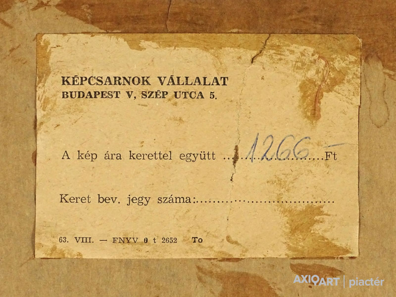 [FK3264/FL-4] A kép mérete: 31,5 x 70,5 cm keret nélkül. Készült: Olaj, tempera, Farostlemez A kép Kurucz D. István (Hódmezővásárhely, 1914, Budapest, 1996) alkotása. Jelezve Jobbra lent "Kurucz 977" A festmény jó állapotban van. Keret: Ép A festmény hátoldalán a Képcsarnokvállalat raglapja látható. Magyar festők és grafikusok életrajzi lexikona I-II. Festő, grafikus. Vásárhelyről, ahol Darvasy István festőművész figyelt fel tehetségére, került Szőnyi István magániskolájába. A fővárosi Képzőművészeti Főiskolának, ahol Rudnay Gyula, Réti István, Benkhard Ágost, Szőnyi István voltak a tanítómesterei 1940-ig volt a tanítványa. A monumentális festészetet Nagy Sándor tanította. Tanulmányúton járt több kelet- és nyugat-európai államban, Mongóliában, Japánban, Algériában. 1940-ben Hódmezővásárhelyen telepedett le, 1943-1947 között bekapcsolódott szülővárosa művészeti és közéletébe. A Vásárhely Népe c. lap munkatársa volt. 1949-59 között Szőnyi tanársegédjeként freskótechnikát tanított a főiskolán. 1951-52-ben megszervezte a Honvédségi Képzőművészeti Stúdiót, majd kinevezték a Honvéd Képzőművészeti Iskola igazgatójának. A vásárhelyi iskola reprezentáns egyéniségeként jelentős szerepe volt a Vásárhelyi Őszi Tárlatok elindításában. Megszervezete és vezette a Mednyánszky Társaságot, s haláláig művészeti vezetője volt a Hajdúböszörményi Nemzetközi Művésztelepnek. Évekig elnöke volt a Hortobágyi Alkotótábornak. Az alföldi parasztok életét megörökítő képei a falképek összefoglaló stílusában a népi realizmus és a dekoratív sommázás szellemében készültek. Számos falképet festett (Kossuth Akadémia, hódmezővásárhelyi iskola, stb.). 1941-től számos kisebb-nagyobb egyéni kiállítása volt, bemutatkozott több hazai és külhoni városban. 1941-től minden jelentősebb országos rendezvény és a magyar művészek külföldi bemutatóinak résztvevője. Rendszeresen szerepelt a Vásárhelyi Őszi Tárlatokon, a Hatvani Tájkép és Portrébiennálékon, a Szegedi Nyári Tárlatokon. Képei bemutatásra kerültek a vásárhelyi iskola jubileumi rendezvényein. 1962-ben több alkotásával szerepelt a Velencei Biennálén. Díjak: SZOT-díj, Munkácsy-díj, Érdemes és Kiváló Művész kitüntetés, Tornyai-plakett, római ösztöndíj, a Munka Érdemrend arany fokozata, Káplár Miklós-díj és emlékplakett, Kossuth-díj. Művei megtalálhatók minden jelentősebb hazai, több olasz és japán közgyűjteményben. (ML, D.J.: Műv. 1985/5, Tasnádi Attila adatközlése nyomán, L.L.: Műv. 1983/3) Magyar festők és grafikusok életrajzi lexikona I-II. Műgyűjtők és kereskedők kézikönyve Festő, grafikus. Vásárhelyről, ahol Darvasy István festőművész figyelt fel tehetségére, került Szőnyi István magániskolájába. A fővárosi Képzőművészeti Főiskolának, ahol Rudnay Gyula, Réti István, Benkhard Ágost, Szőnyi István voltak a tanítómesterei 1941-ig volt a növendéke. A monumentális festészetet Nagy Sándor tanította. Egy ideig tanársegédként működött Szőnyi mellett. Több ízben járt Itáliában tanulmányúton. Évekig művészeti vezetője volt a Hajdúböszörményi Nemzetközi Művésztelepnek. Az alföldi parasztok életét megörökítő képei a falképek összefoglaló stílusában a népi realizmus és a dekoratív sommázás szellemében készülnek. A II. világháború alatt szerepet vállalt a Szocialista Képzőművészek Csoportjának akcióiban. 1949-1960 k. a Képzőművészeti Főiskola falképtanszékének tanára volt. Több falképet festett (Kossuth Akadémia, hódmezővásárhelyi iskola, stb.). 1962-ben több alkotásával szerepelt a Velencei Biennálén, SZOT-díjas, Munkácsy-díjas, érdemes és kiváló művész kitüntető elismerésében részesült. (ML, D.J.: Műv.-1985/5, L.L: Műv.-1983/3) Magyar festők és grafikusok adattára Tanulmányait a Képzőművészeti Főiskolán végezte, ahol Rudnay Gyula és Réti István voltak a mesterei. 1941-1943-ban ösztöndíjas Rómában. 1943-1947 között Hódmezővásárhelyen dolgozik, egyidejűleg a Vásárhelyi Hétfő c. hetilap szerkesztője. 1949-1960 közötti években a budapesti Képzőművészeti Főiskola freskó tanszékének tanára. Az 1940-es évek eleje óta kiállító művész. 1962-ben a Velencei Biennálén állították ki műveit. 1970-ben Csók István Galériában volt kiállítása. A Vásárhelyi Őszi Tárlatok és a Szegedi Nyári Tárlatok rendszeres kiállító művésze. Az alföldi festészet egyéni hangú továbbfejlesztője. Táblaképeket, freskókat és kerámia falképeket alkot. Munkácsy-díjas, érdemes és kiváló művész kitüntető elismerésében részesült. A SZOT a legelső képzőművészek közt, 1962-ben tüntette ki díjával. A 70. születésnapját ünneplő művész 1984 decemberében életmű kiállítást rendezett műveiből a hódmezővásárhelyi Tornyai János Múzeumban. 1986-ban a budapesti Hollósy Galériában nyílt kiállítása. - Irod.: Szij Rezső: Kurucz Dezső István festőművész. Bp. 1967.; Kulcsár Ödön: SZOT-díjasok. Bp., 1981.; Lóska Lajos: Mindig freskót szerettem volna festeni. Beszélgetés Kurucz Dezső Istvánnal. Művészet, 1984. 3. Művészeti lexikon I-IV. Festő, Munkácsy-díjas. A Képzőművészeti Főiskolán Rudnay Gyula, Réti István, Benkhard Ágost, Szőnyi István növendéke volt 1934-40 között. Több ízben járt külföldi tanulmányúton. Az alföldi parasztok életét megörökítő képei a falképek összefoglaló stílusában a népi realizmus és a dekoratív sommázás szellemében készülnek. 1949-60 között a Képzőművészeti Főiskola falképtanszékének tanára volt. Több falképet festett (Kossuth Akadémia; Hódmezővásárhely, iskola, pápai pártház, 1965). Legutóbb 195
