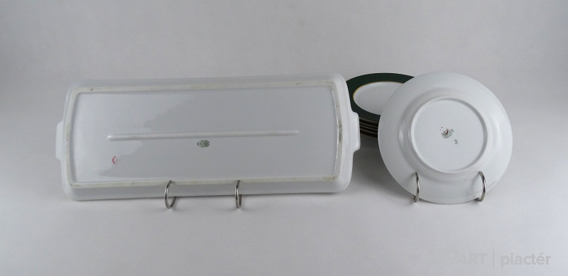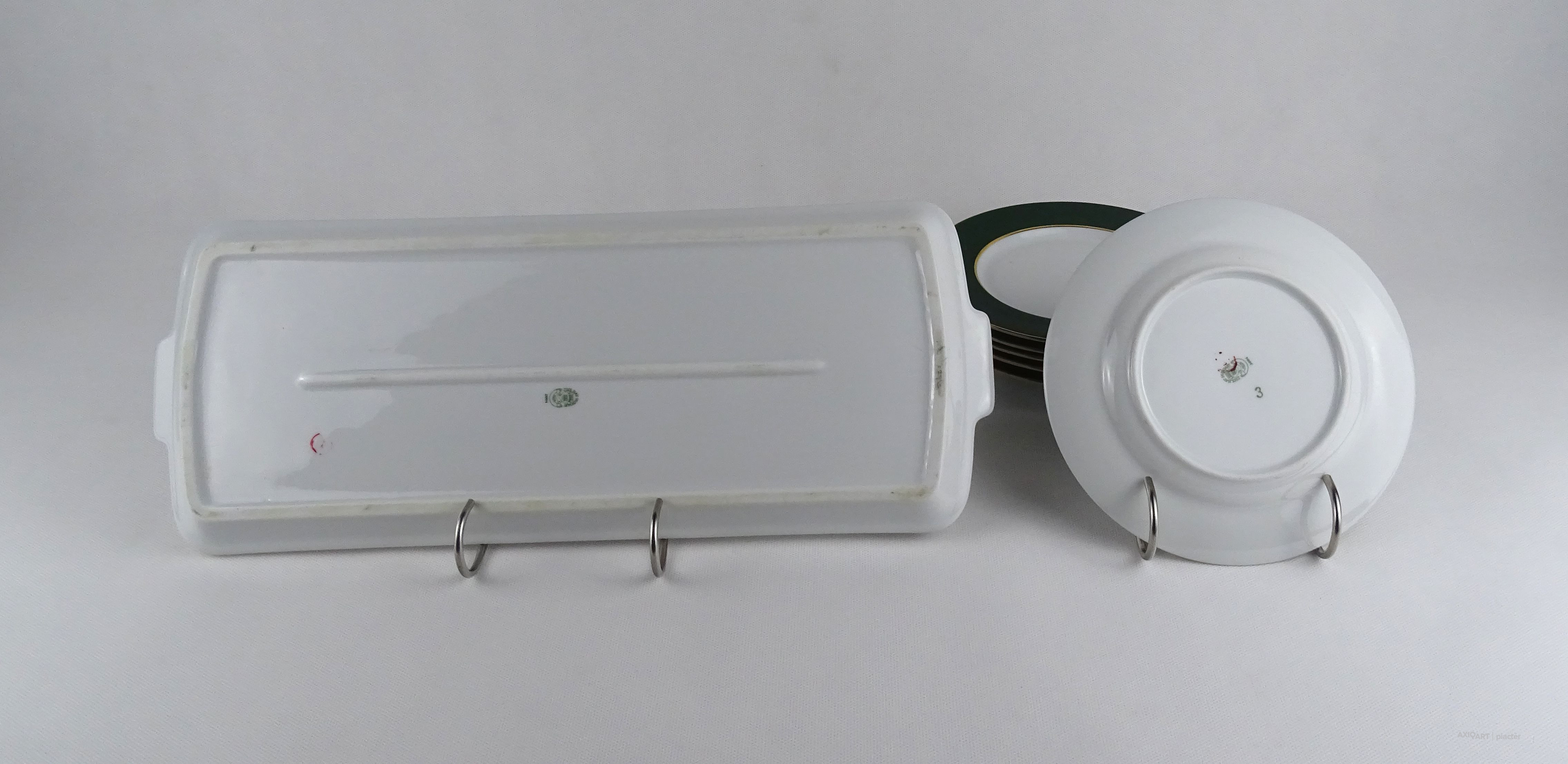[1T841/X327] Hibátlan állapotú Zsolnay Olíva porcelán süteményes készlet, zöld színű, aranyozott szegéllyel. A készlet darabjai: - 1 darab szögletes süteményestál (40.8 x 15.9 cm) - 6 darab kistányér (17.5 cm) Alján zöld Zsolnay öttornyú márkajelzés: ZSOLNAY HUNGARY PÉCS 2004 Súly: 2.38 kg