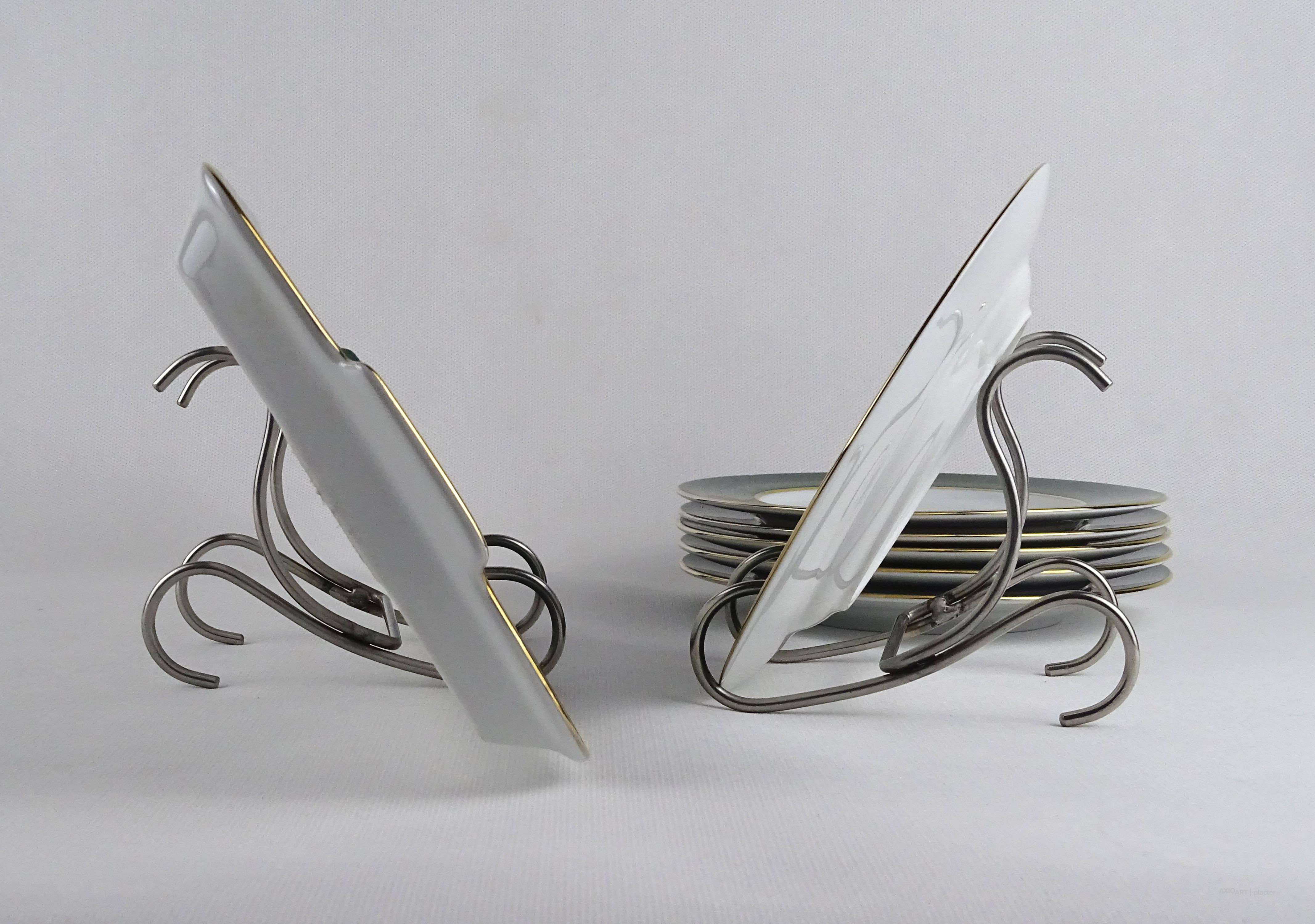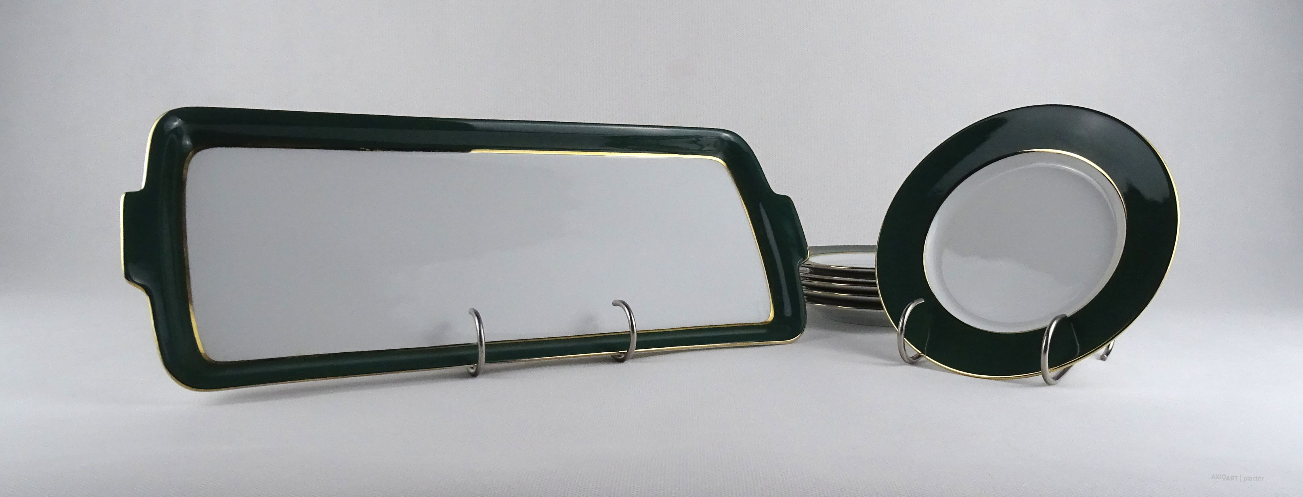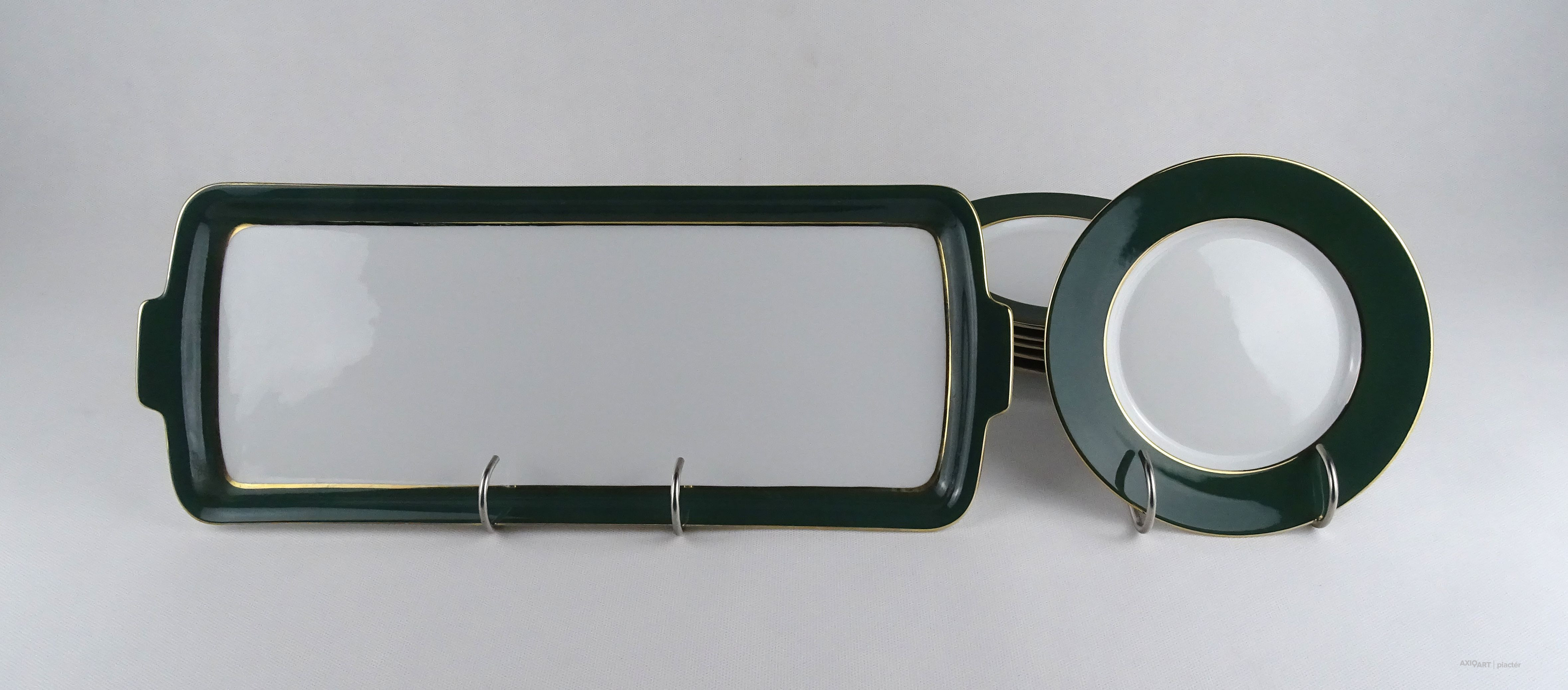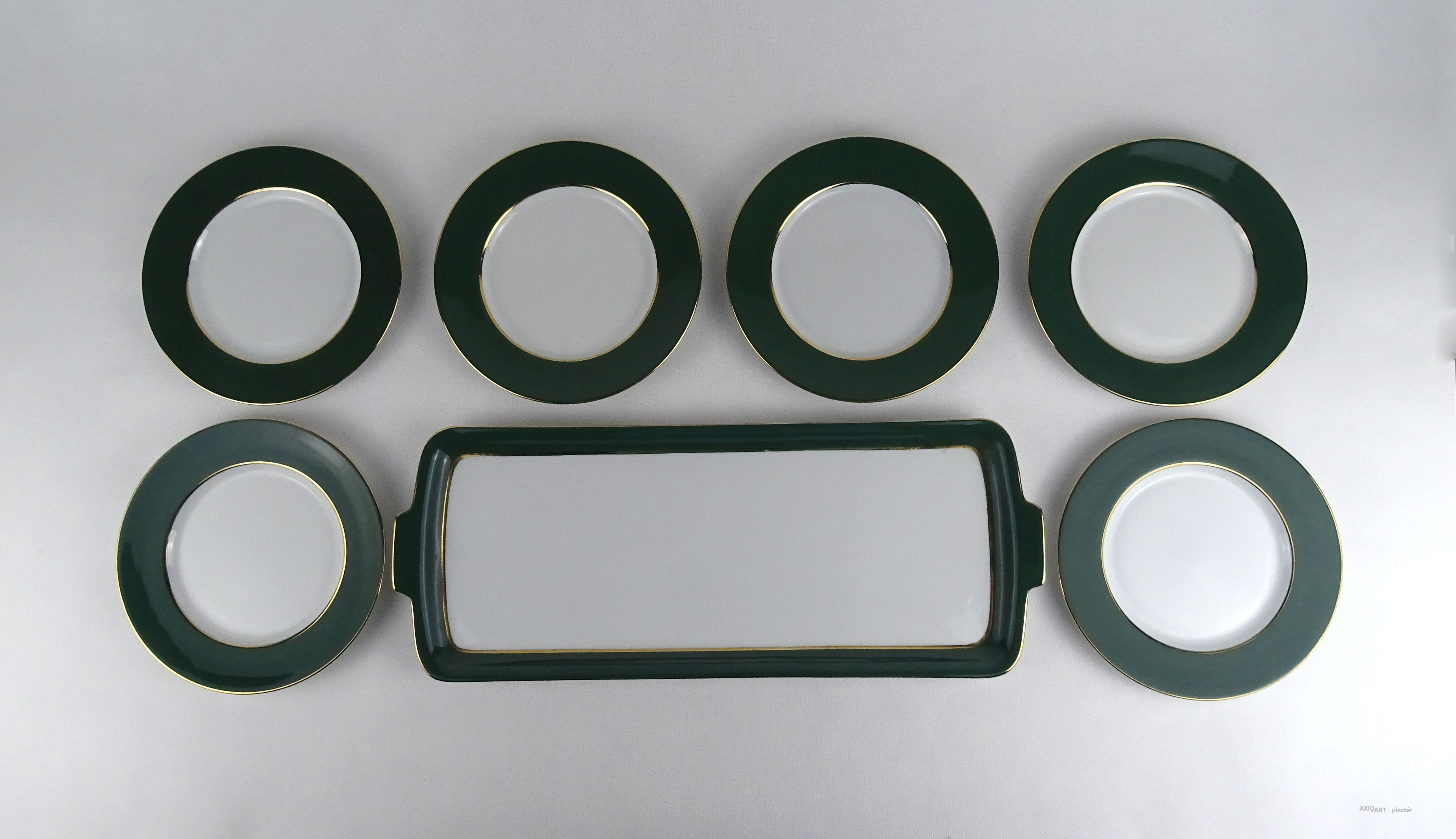 Hibátlan állapotú Zsolnay Olíva porcelán süteményes készlet, zöld színű, aranyozott szegéllyel.