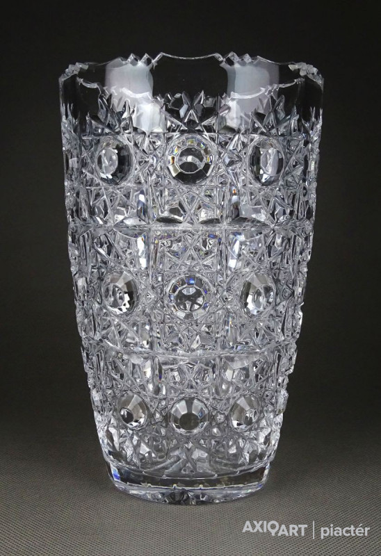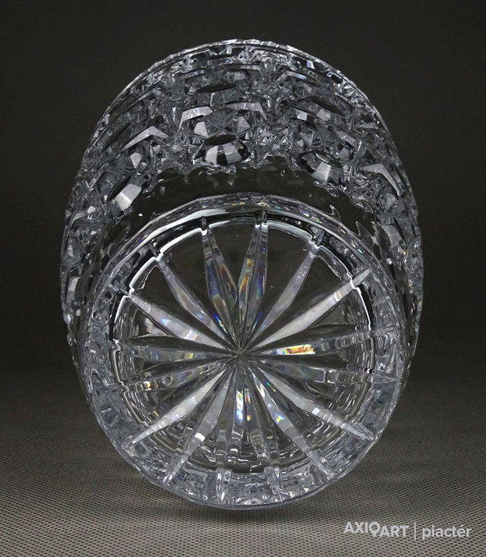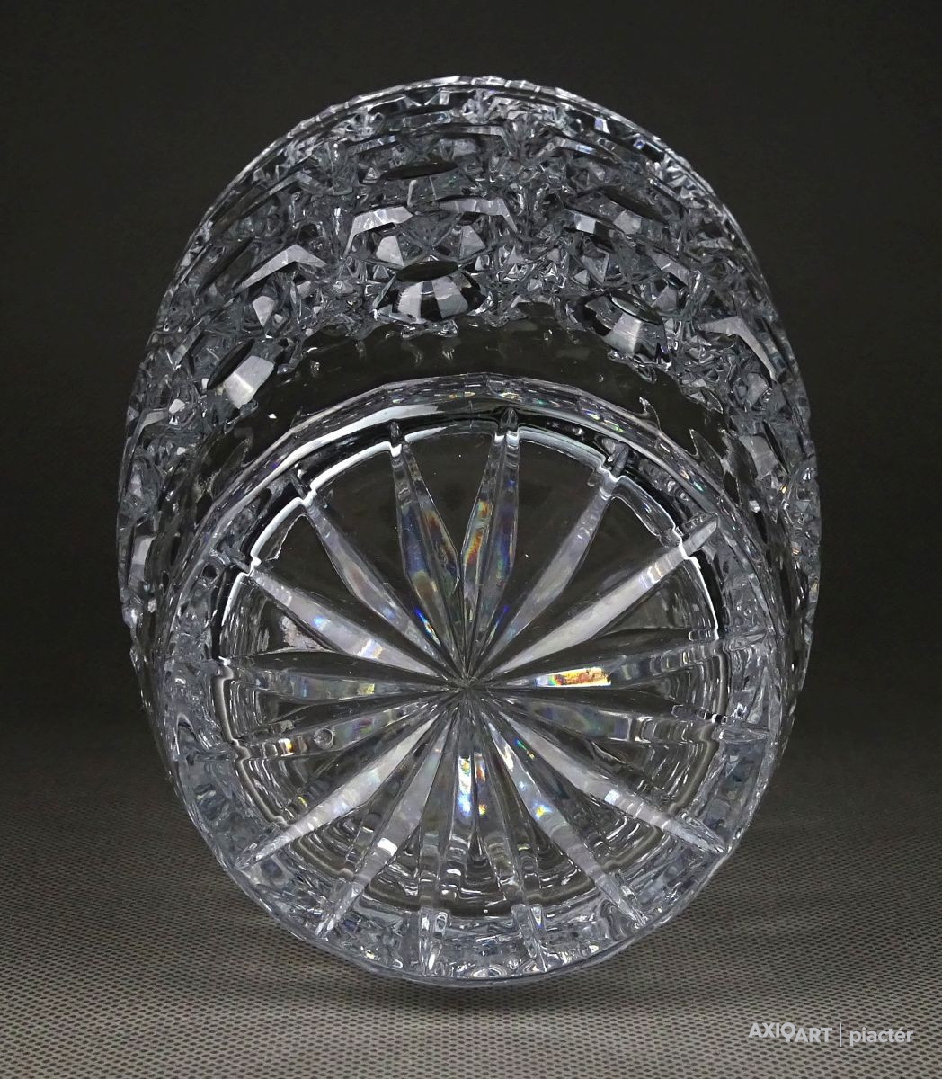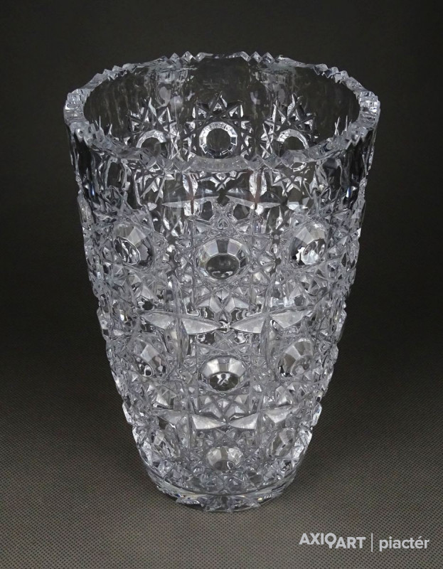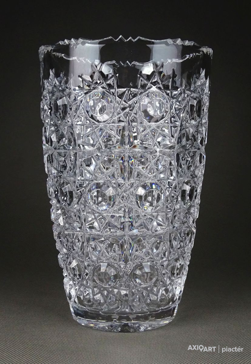 Gyönyörű, hibátlan állapotú, csiszolatokkal gazdagon díszített vastag falú kristály váza, díszváza, virágváza.