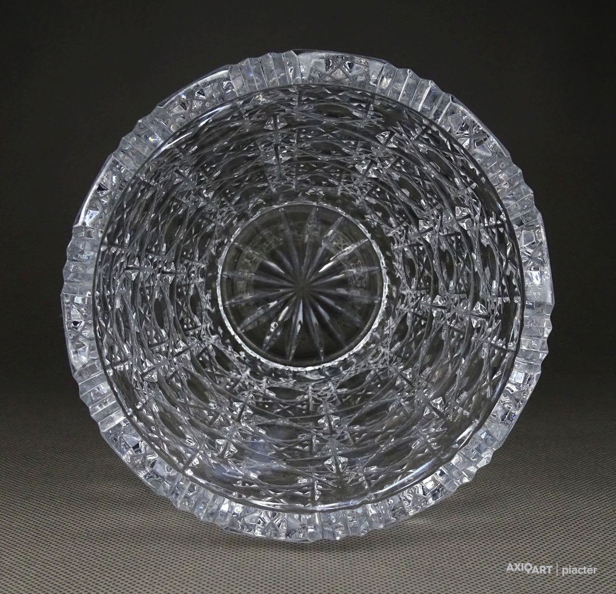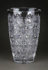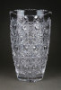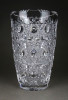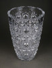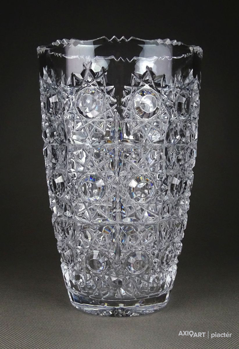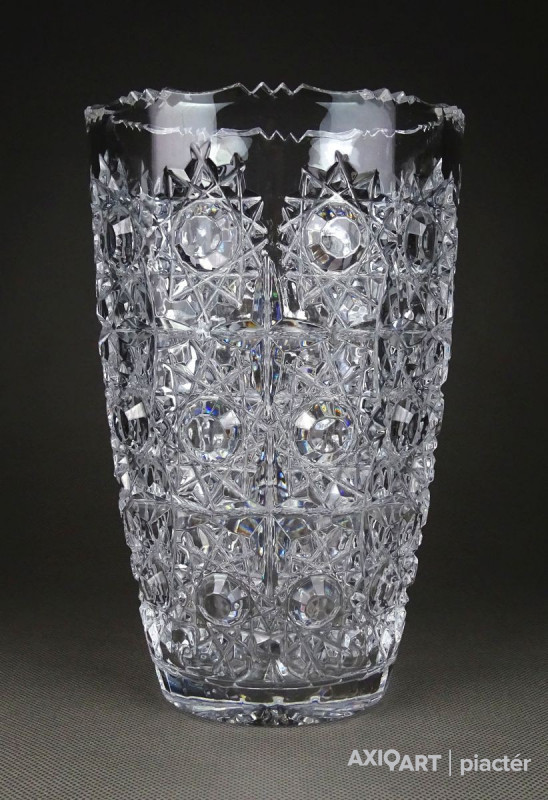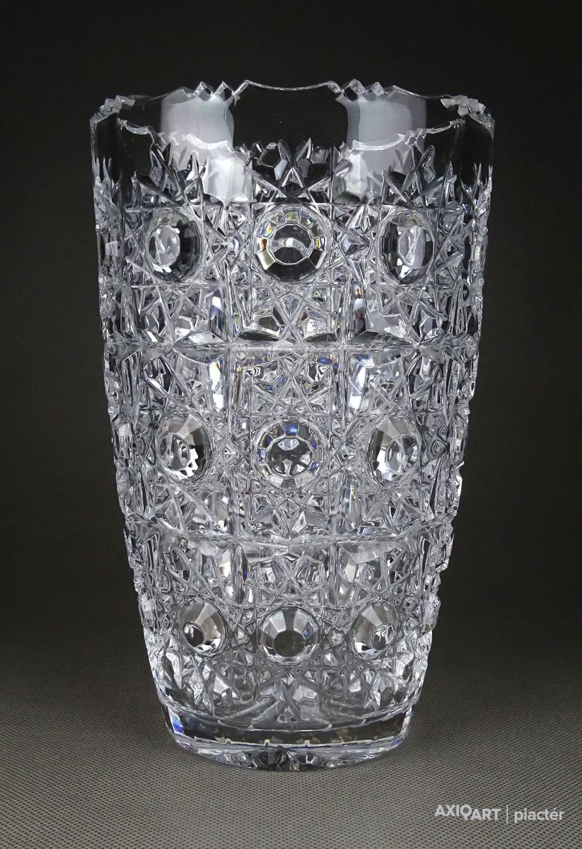 Gyönyörű, hibátlan állapotú, csiszolatokkal gazdagon díszített vastag falú kristály váza, díszváza, virágváza.