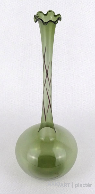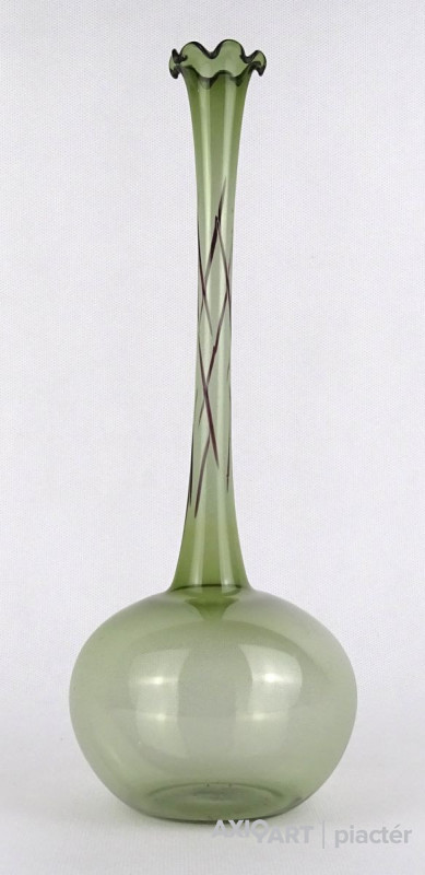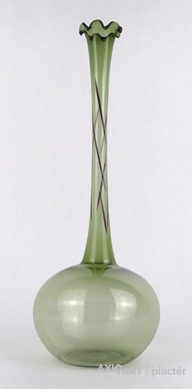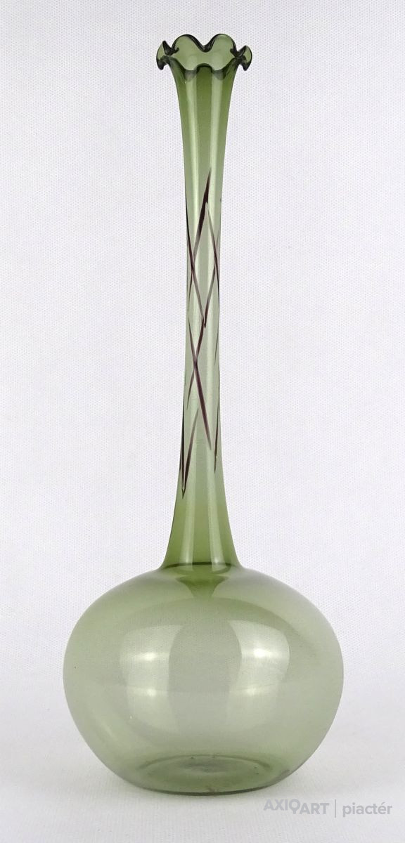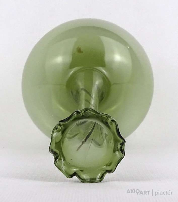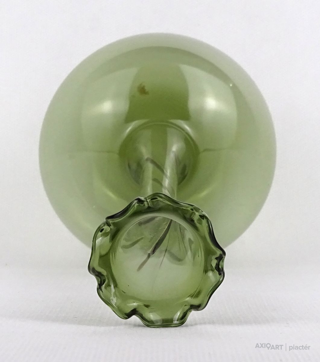 Gyönyörű, hibátlan állapotú, fodros szélű, zöld színű, hajszálvékony üveg váza, szálváza, egy szál virág számára.