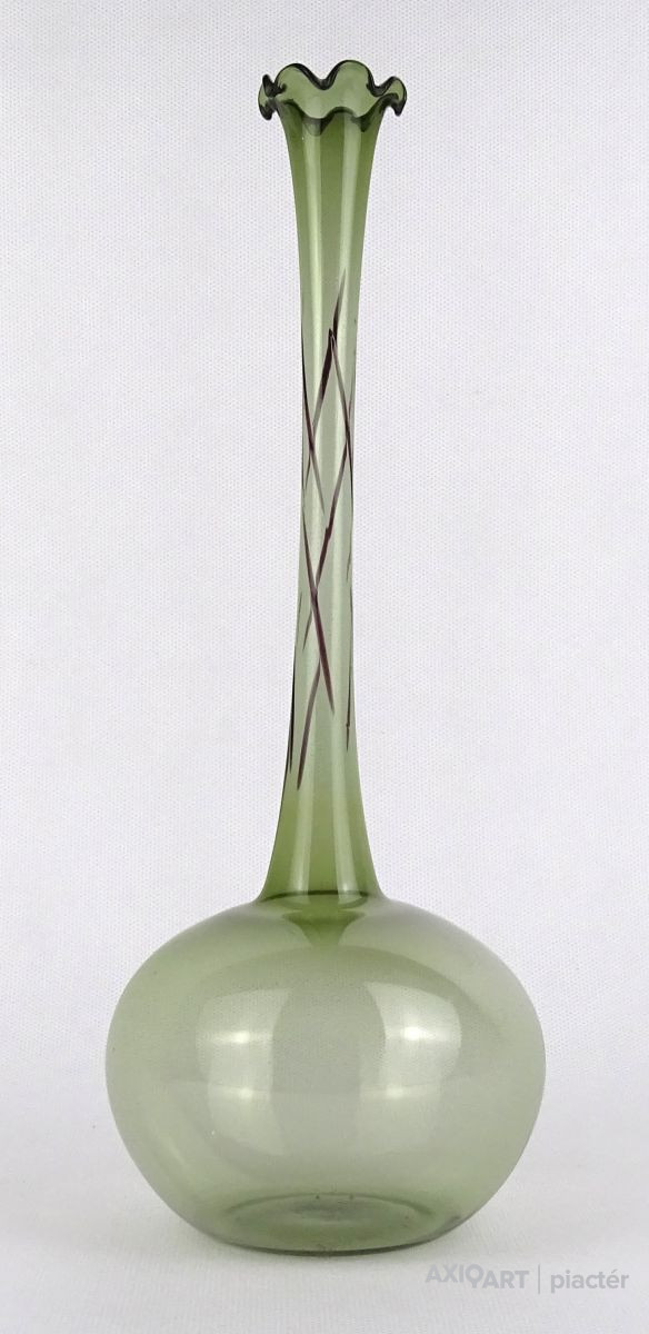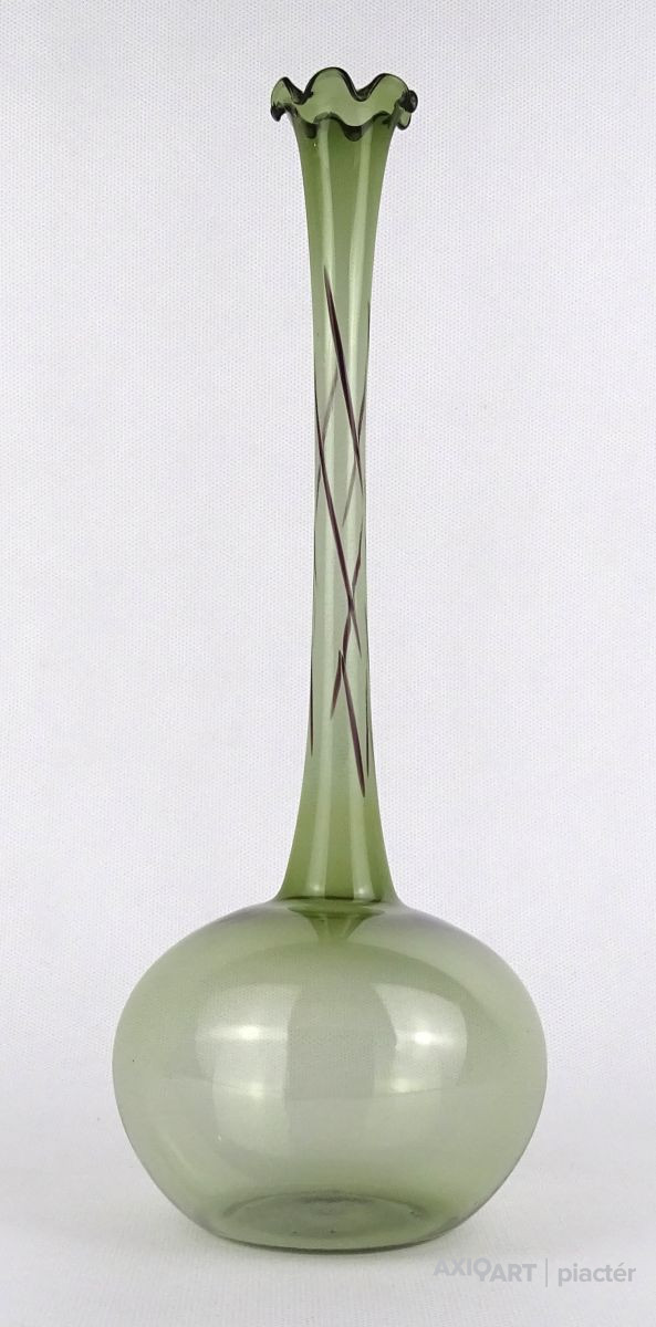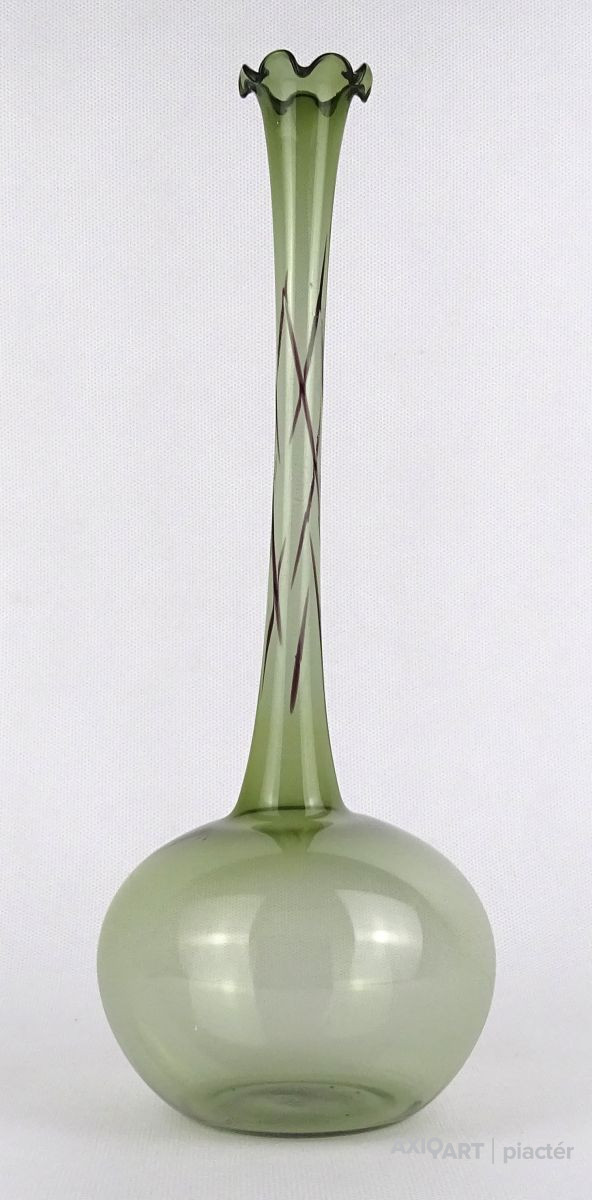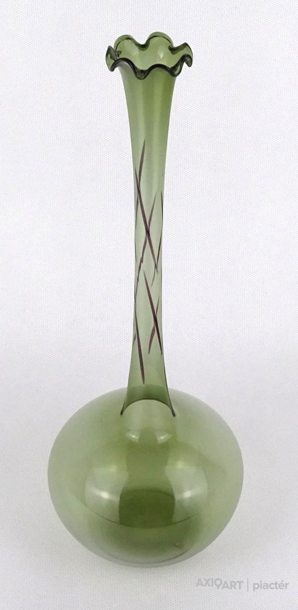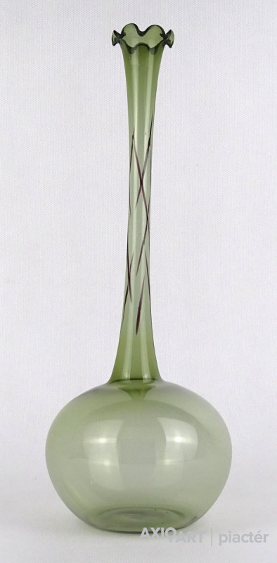 Gyönyörű, hibátlan állapotú, fodros szélű, zöld színű, hajszálvékony üveg váza, szálváza, egy szál virág számára.