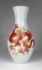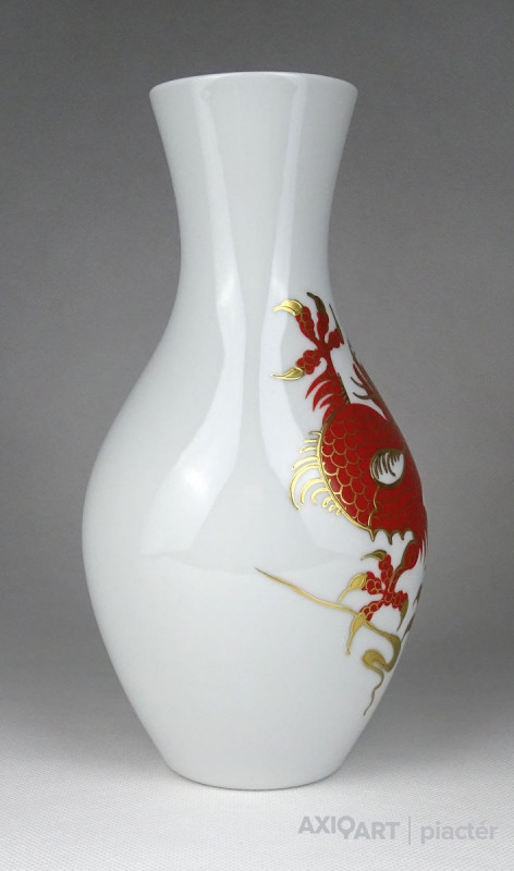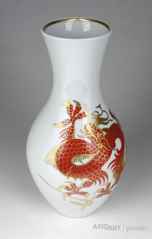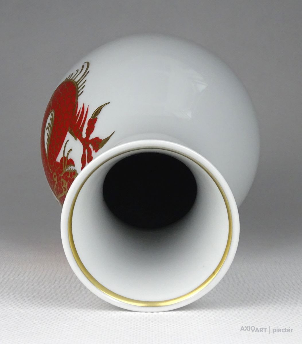 Hibátlan állapotú jelzett, nagy méretű porcelán váza. Oldalán vörös és arany színekkel kézi festett, sárkány díszítés látható.