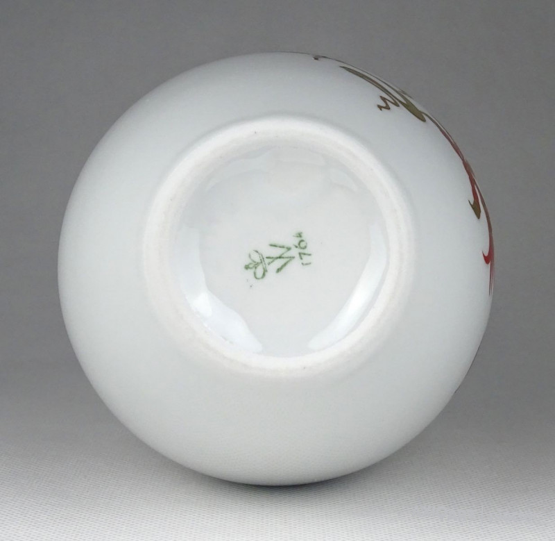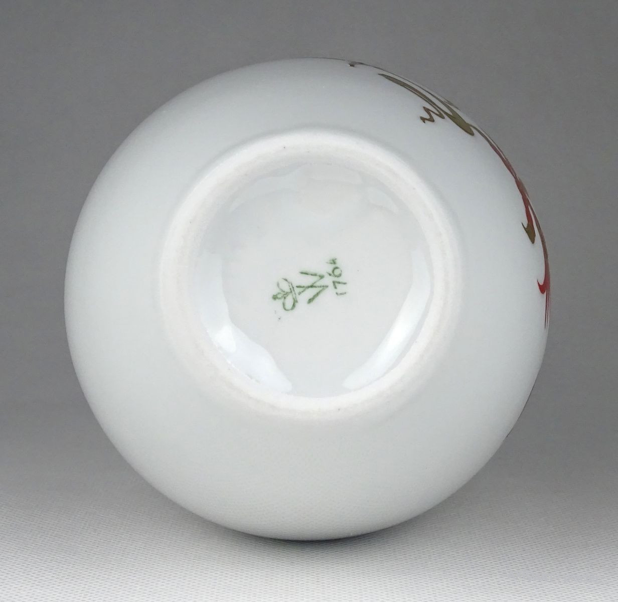 [1H672/X156] Hibátlan állapotú jelzett, nagy méretű porcelán váza. Oldalán vörös és arany színekkel kézi festett, sárkány díszítés látható. Alján Wallendorfi koronás márkajelzés: W 1764 Magasság: 20 cm Szélesség: 10 cm Súly: 0.42 kg