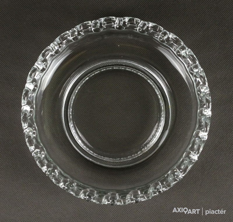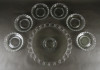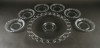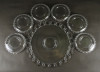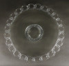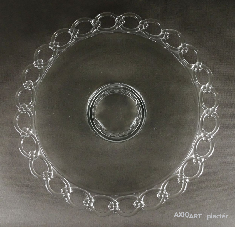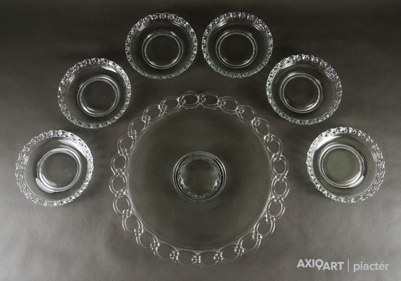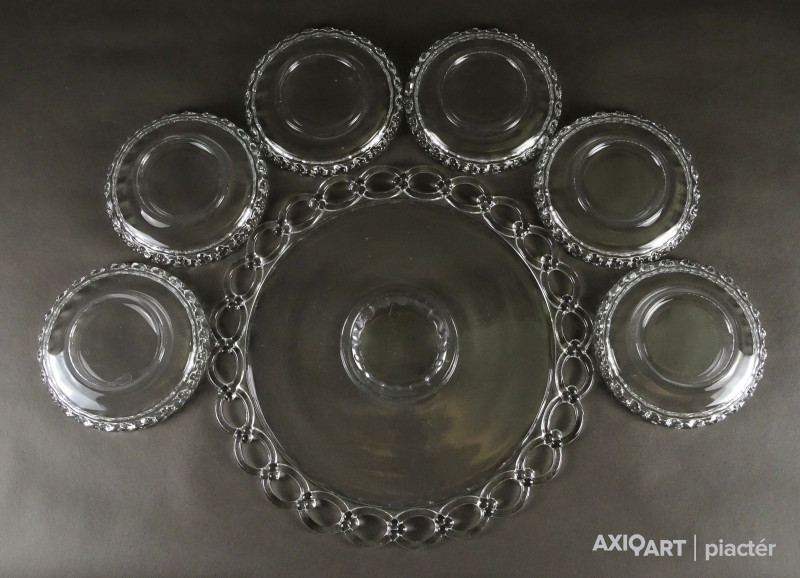 [1P900/X054] Régi áttört szélű, hibátlan állapotú hét darabos üveg süteményes készlet, tortás készlet. A készlet darabjai: - 1 darab nagy méretű sütis kínáló tál, tortatál, tálca (41 cm) - 6 darab kistányér, süteményes tányér (18 cm) Súly: 4.96 kg