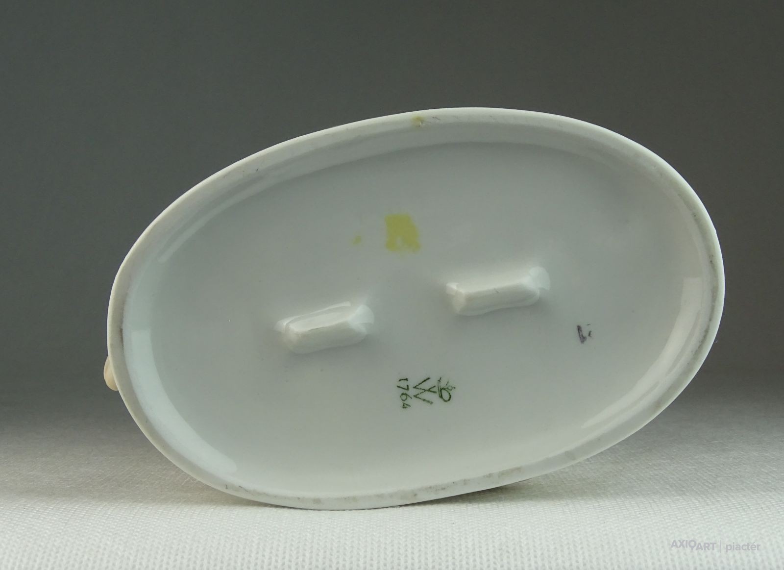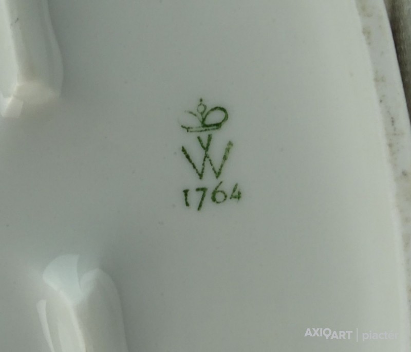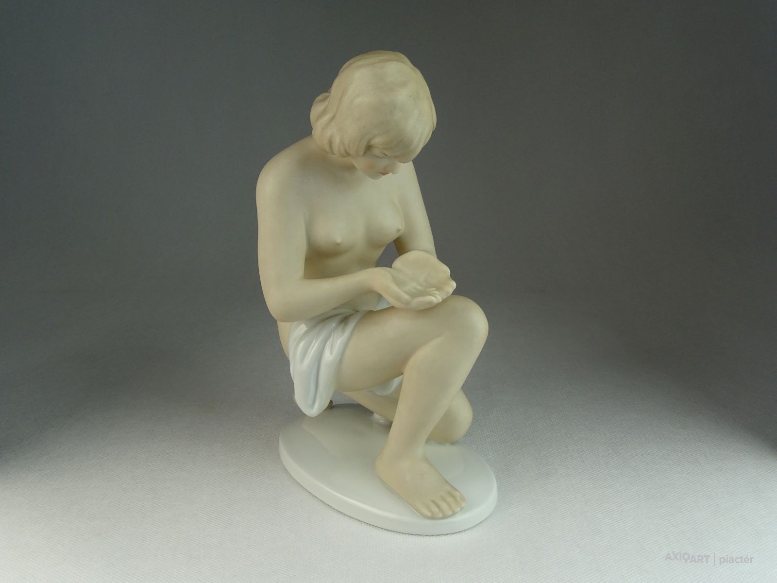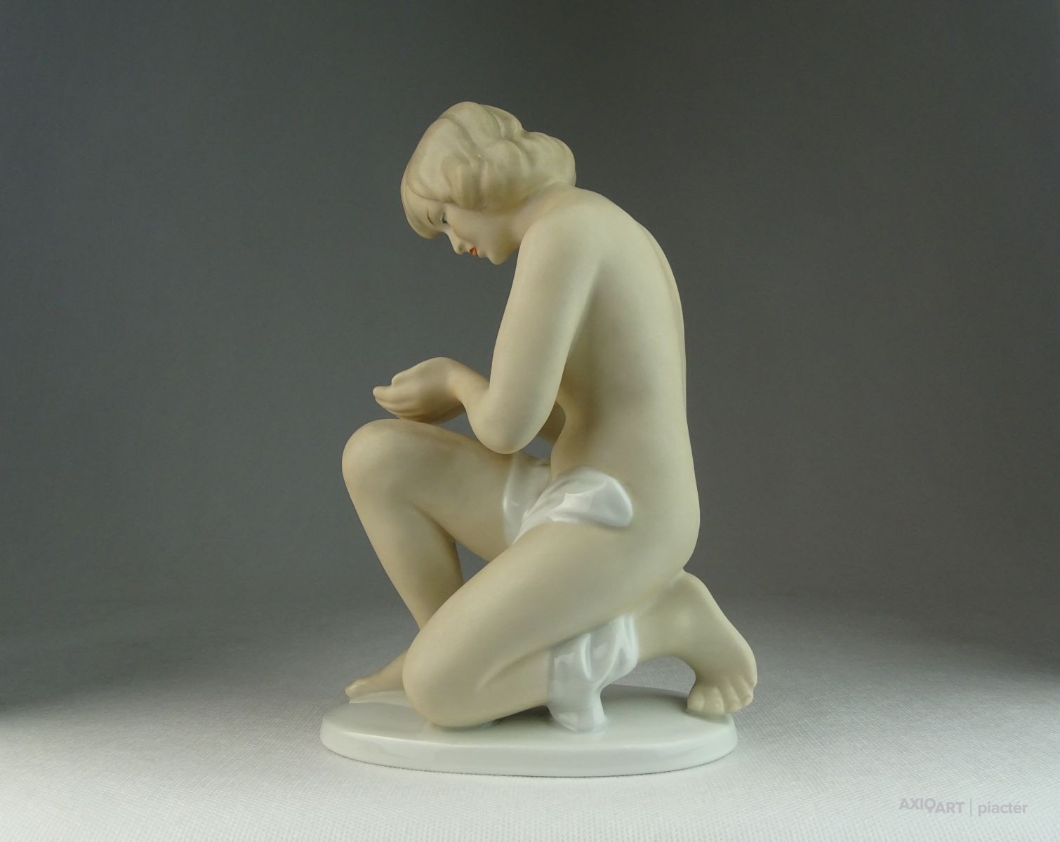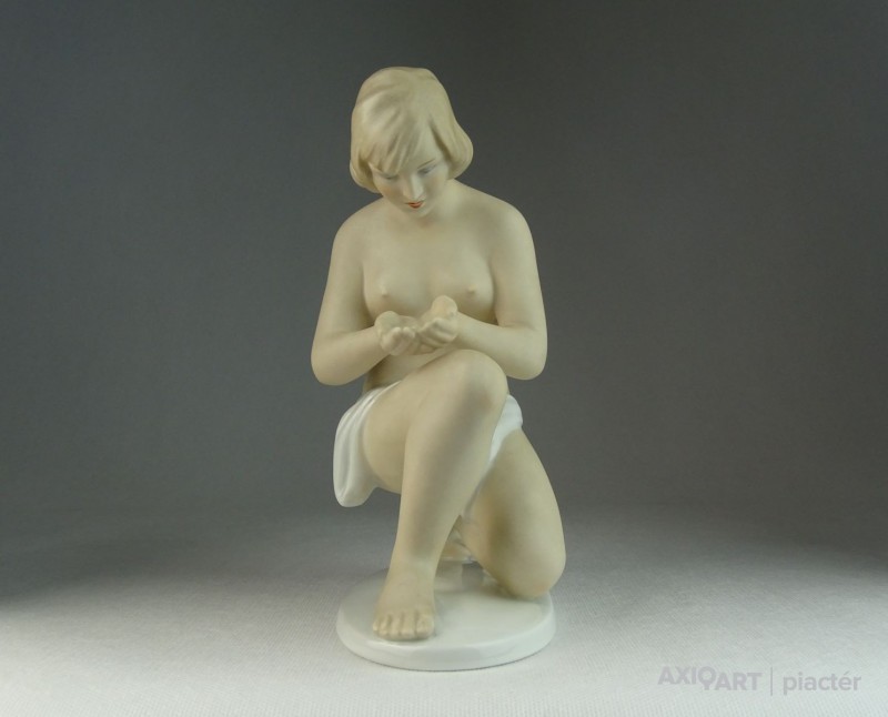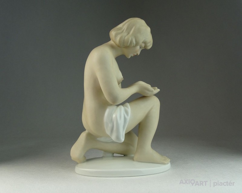 [0N527/VTR-2] Régi, gyönyörű hibátlan állapotú, jelzett, talapzaton térdelő porcelán egész alakos akt. Alján zöld koronás márkajelzés: W 1764 Magasság: 22.5 cm Szélesség: 10 cm Hosszúság: 15 cm Súly: 0.74 kg   Magassága 24,5 cm, szélessége a kezeknél 21 cm, talapzata 13,5 cm széles. Súlya 912 g.