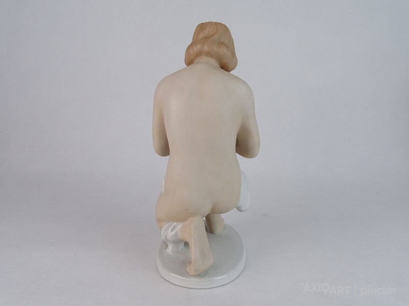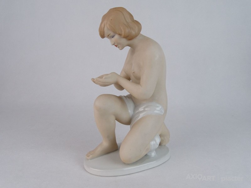 Régi, gyönyörű hibátlan állapotú, jelzett, talapzaton térdelő porcelán egész alakos női akt.
