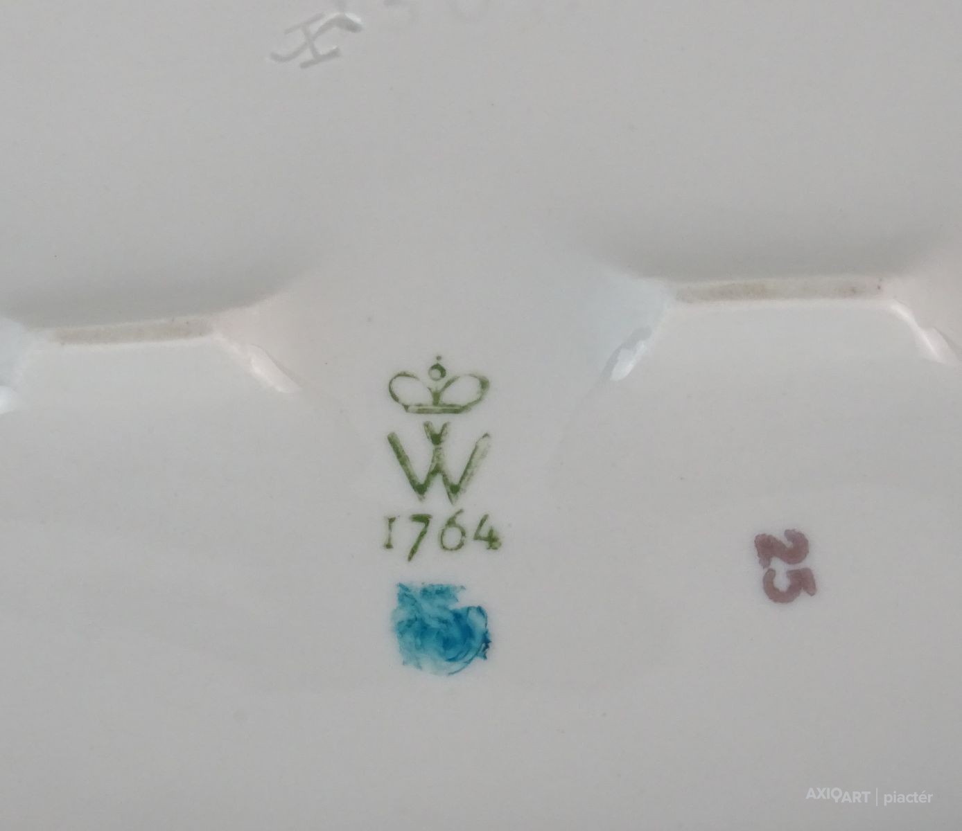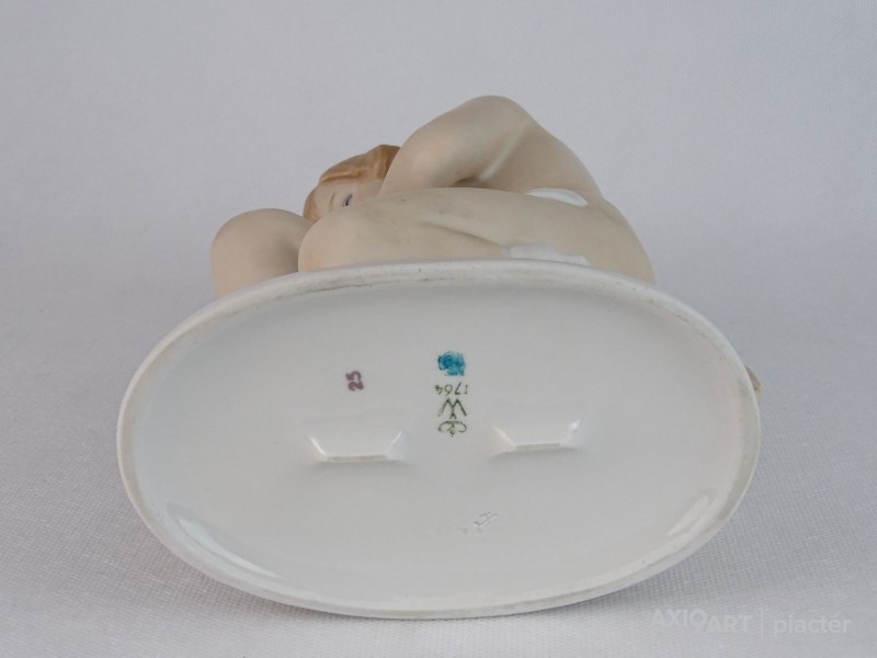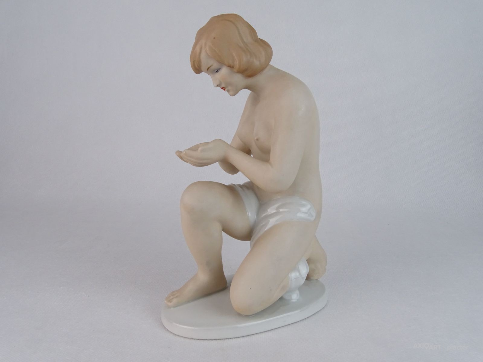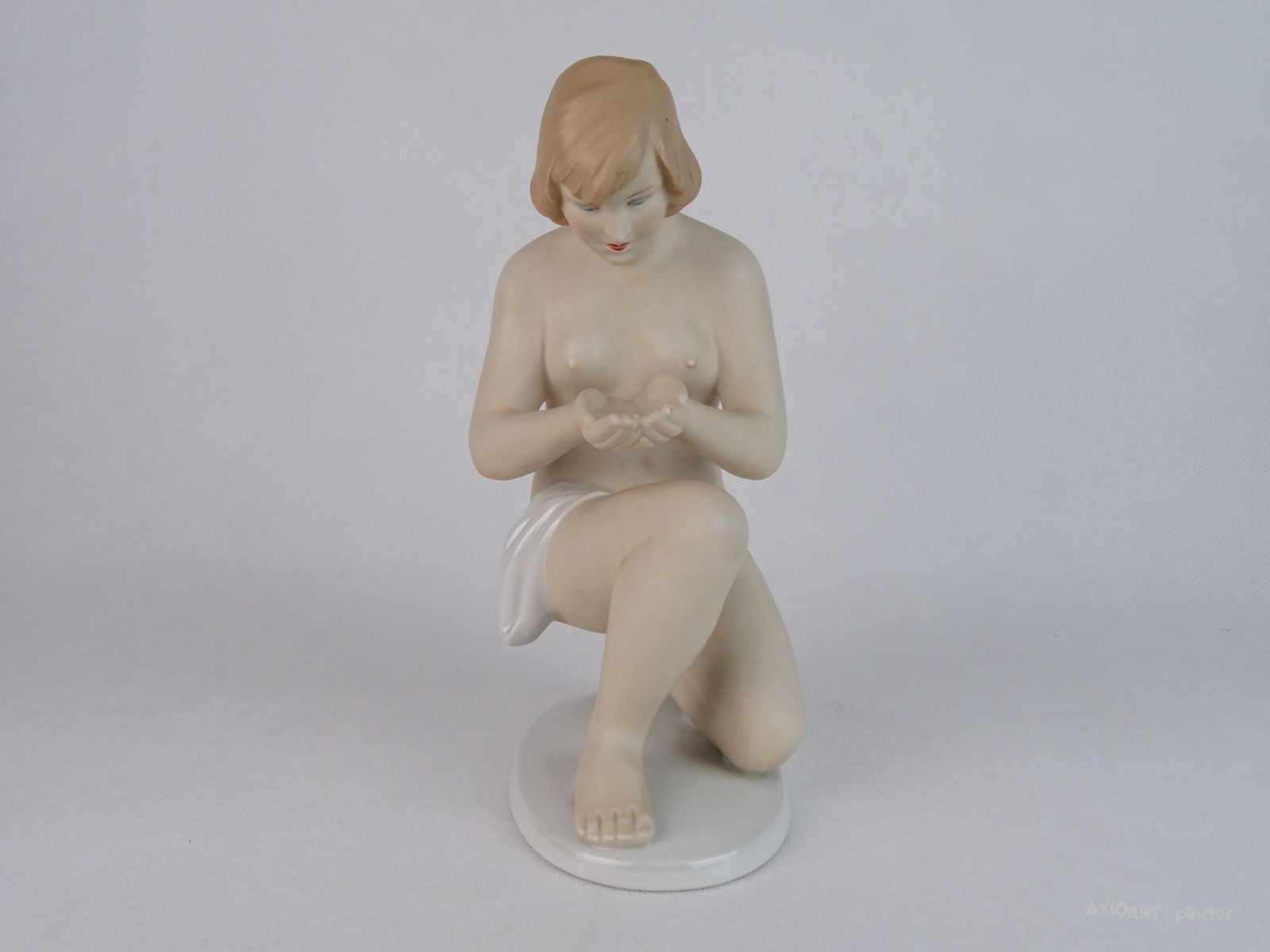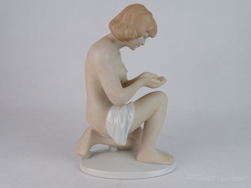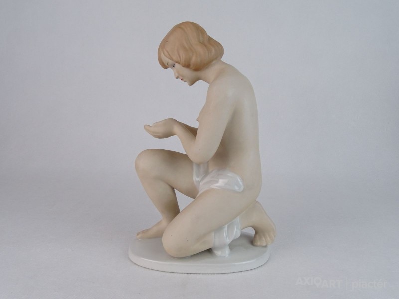 [0M741/Z009] Régi, gyönyörű hibátlan állapotú, jelzett, talapzaton térdelő porcelán egész alakos női akt. Alján zöld koronás márkajelzés: W 1764 Magasság: 22.5 cm Szélesség: 9 cm Hosszúság: 15 cm Súly: 0.695 kg   Magassága 24,5 cm, szélessége a kezeknél 21 cm, talapzata 13,5 cm széles. Súlya 912 g.