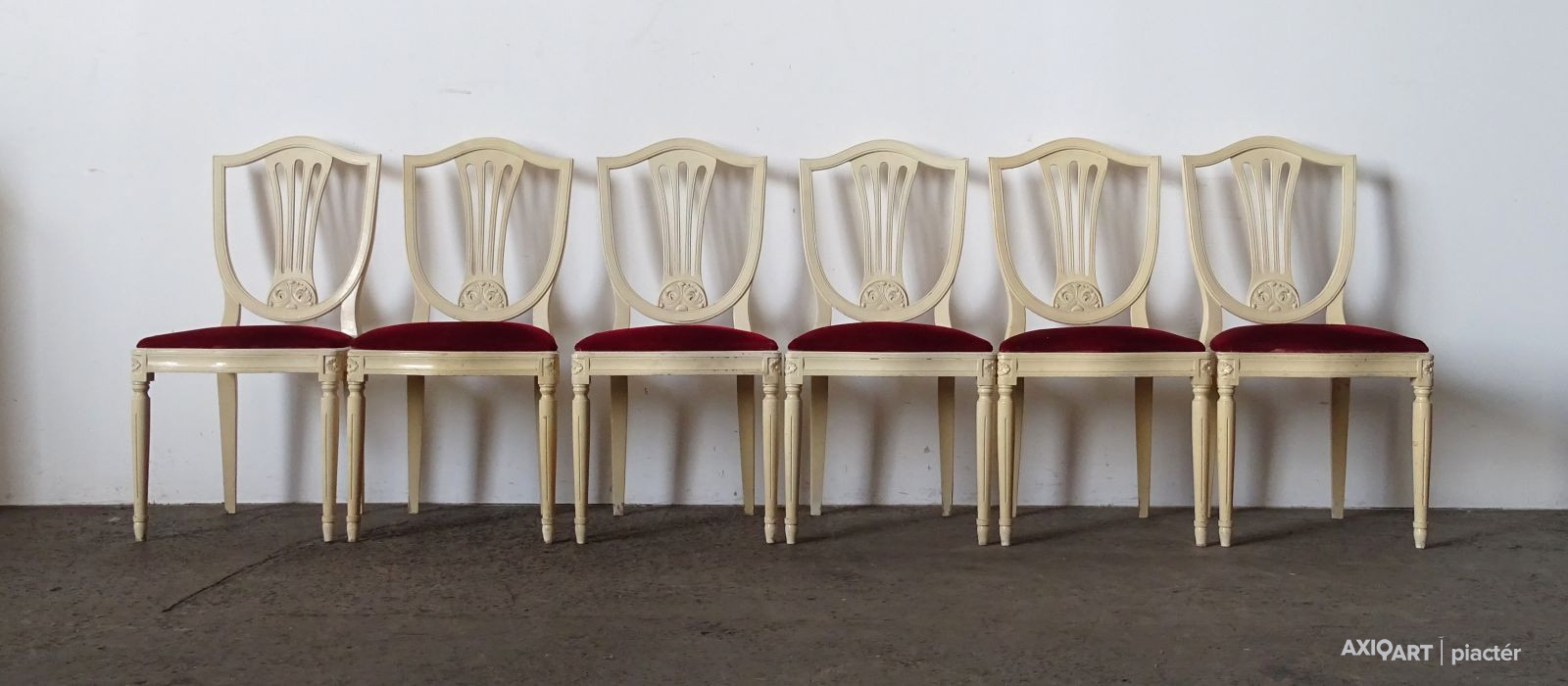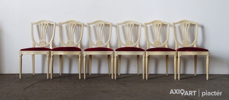 Szép állapotú étkező garnitúra. A székek ülőfelülete kárpitozott. Historizáló empire stílbútor garnitúra. Némely szék kisebb megerősítésre szorul.