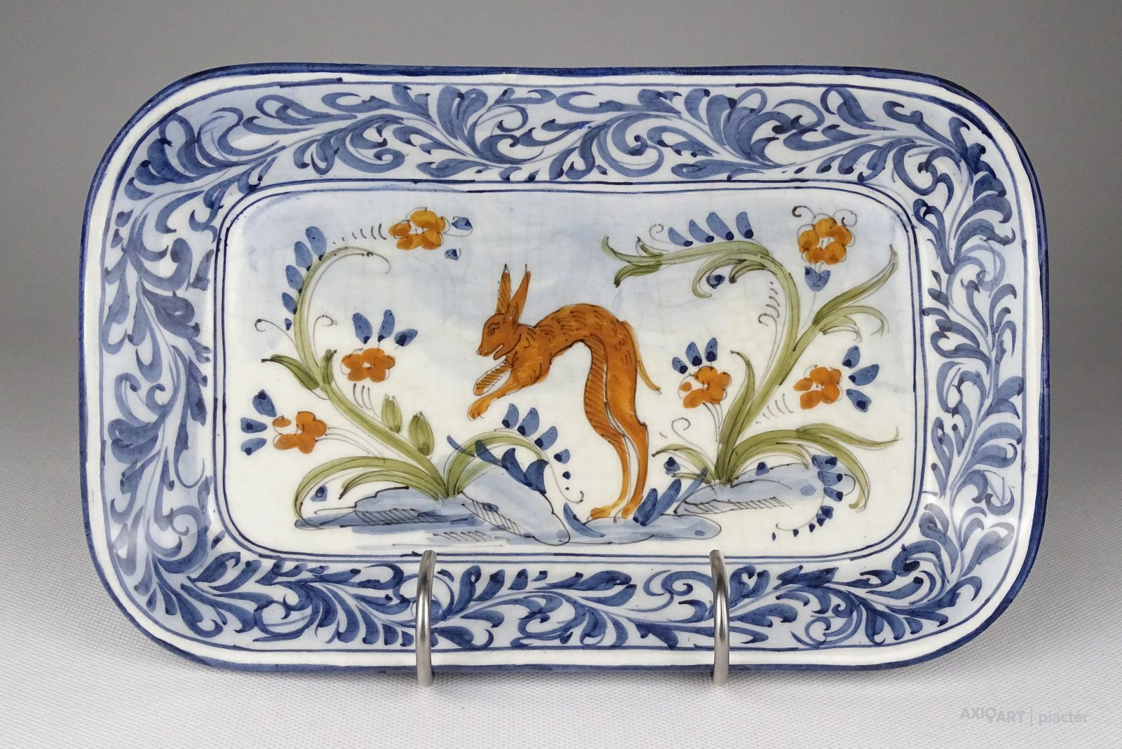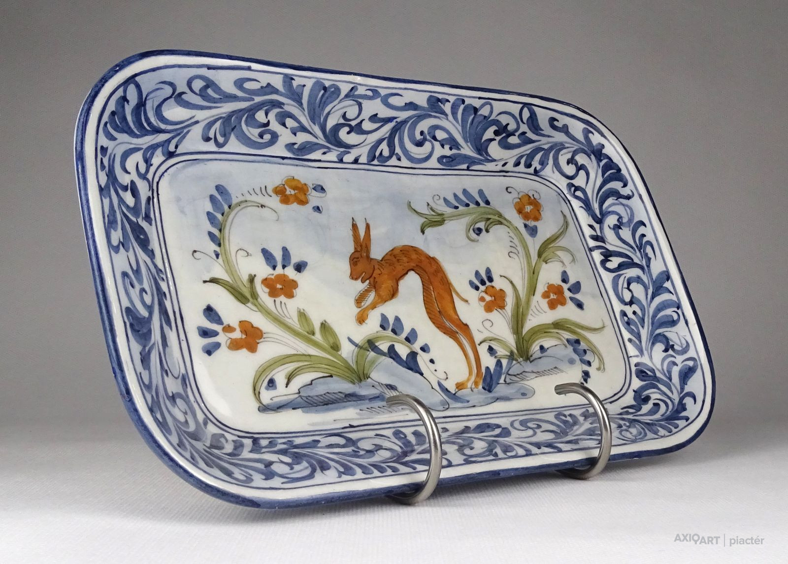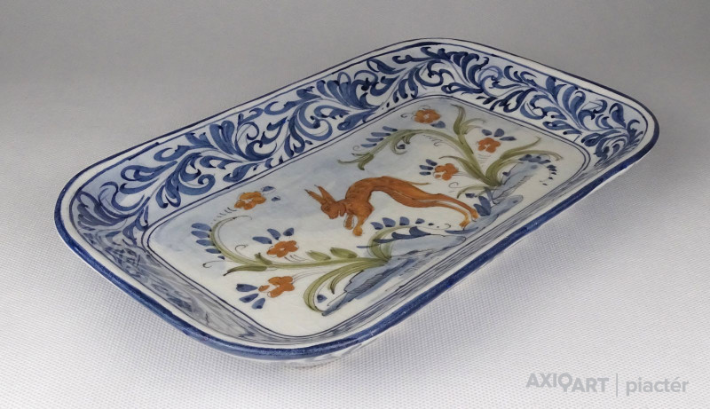 Szép állapotú, az antik itáliai fajanszokat utánzó stílusban készült, kézzel festett fajansz tál, kínáló tál. Közepén ugró nyúl, nyuszi díszítés látható. A tál peremén kopások találhatók.